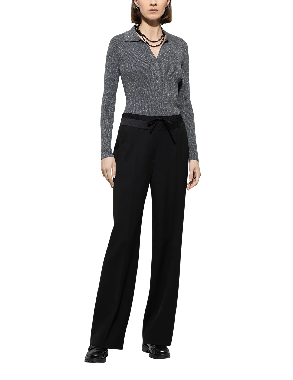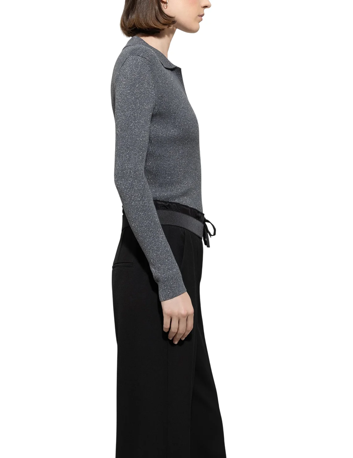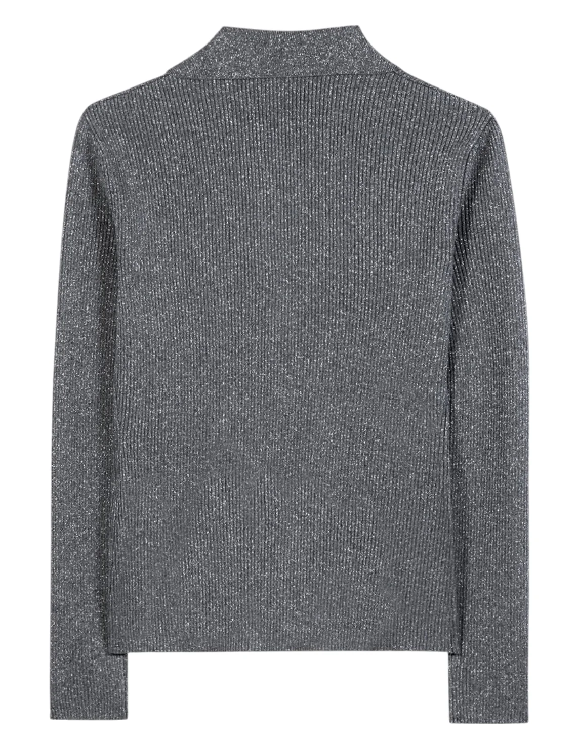 Пуловер виготовлений з віскози, поліаміду, поліестеру та вовни. Модель виконана в приталеному крої. Має відкладний комір, застібку на ґудзиках і довгі рукави з манжетами.