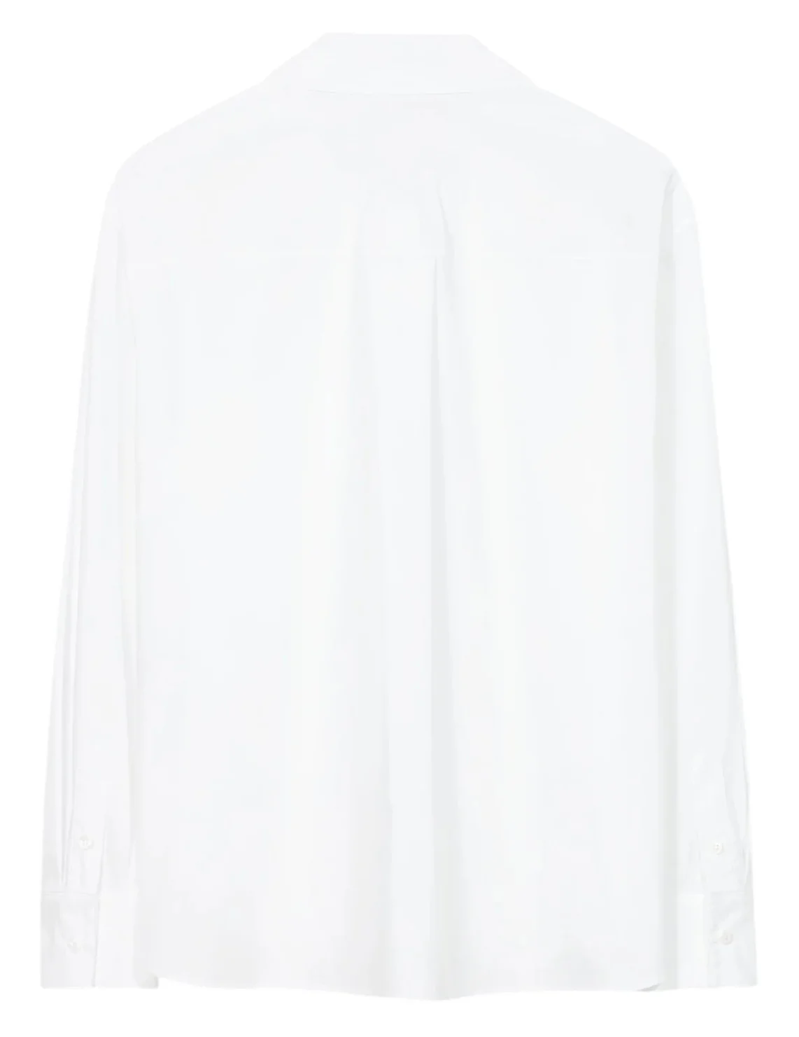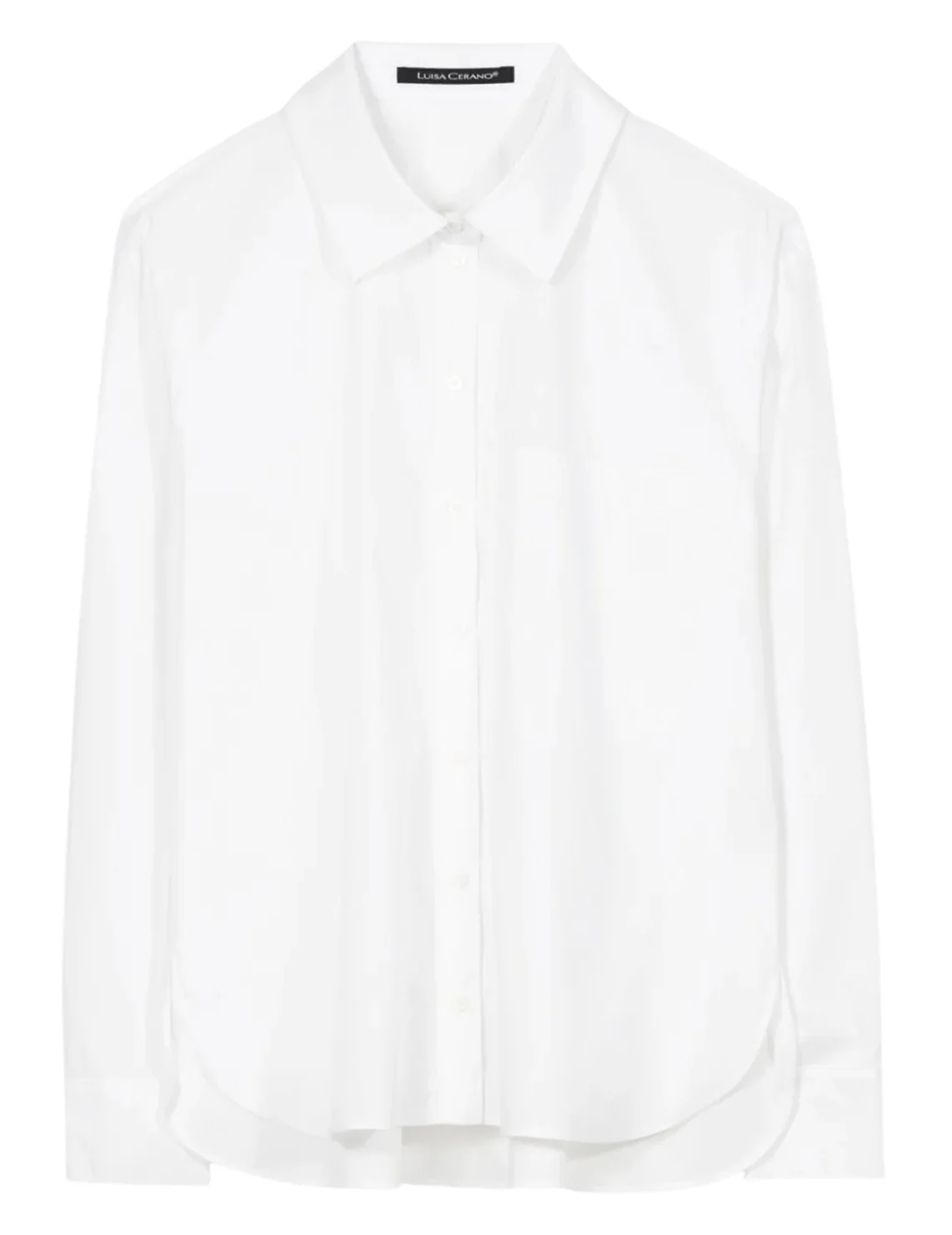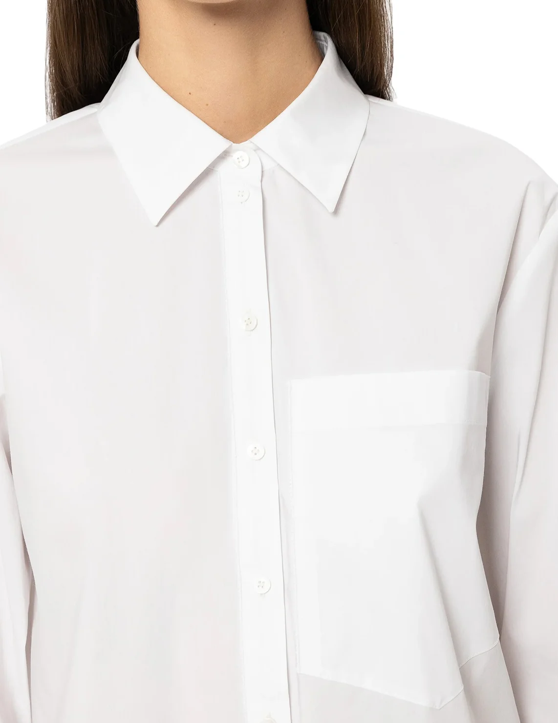 Сорочка виготовлена з бавовни, поліаміду та еластану. Модель виконана в прямому крої. Має відкладний комір, планку на ґудзиках, бічні розрізи, нагрудну кишеню та довгі рукави з манжетами.