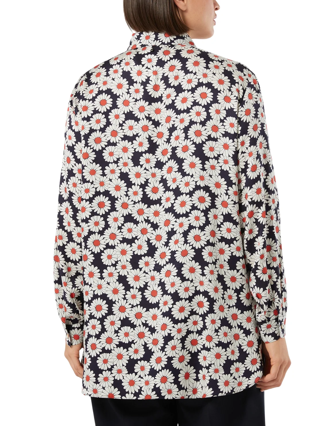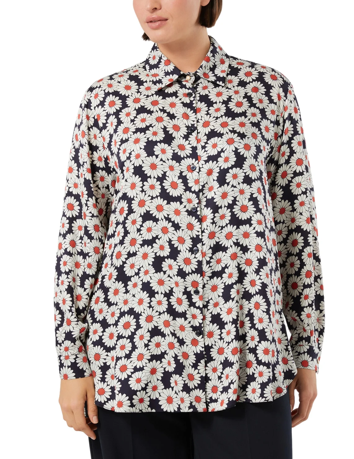 Сорочка виготовлена з віскози високої якості. Модель виконана в прямому крої. Має класичний відкладний комір, планку з ґудзиками та довгі рукави з манжетами. Декорована квітковим принтом.