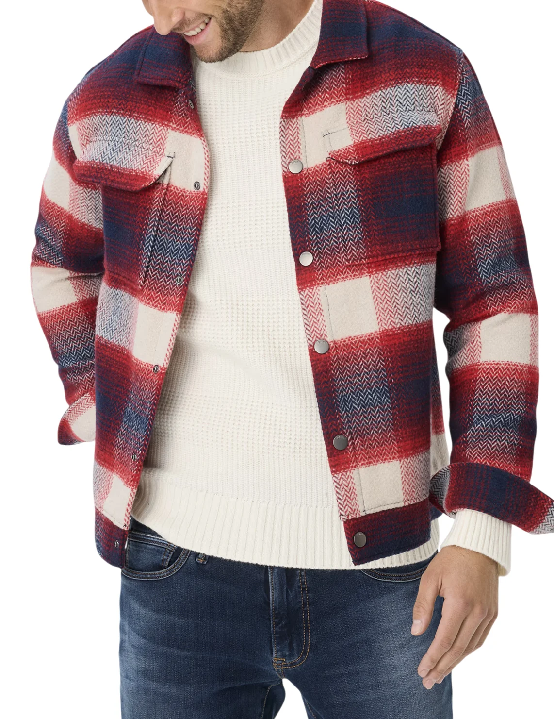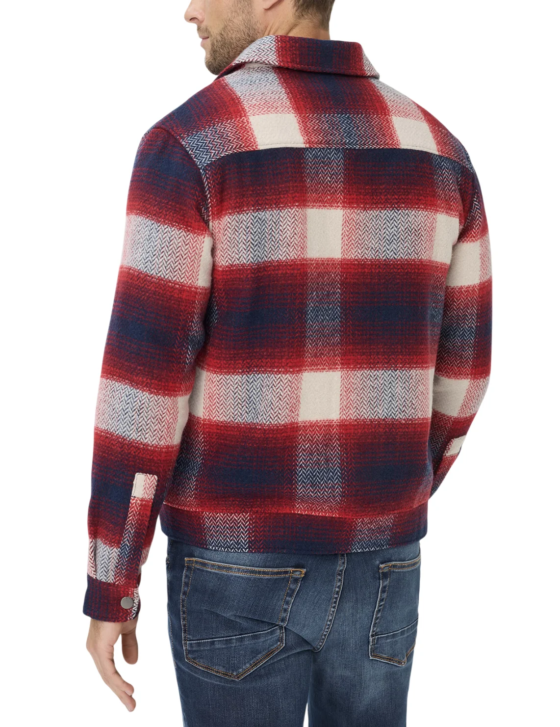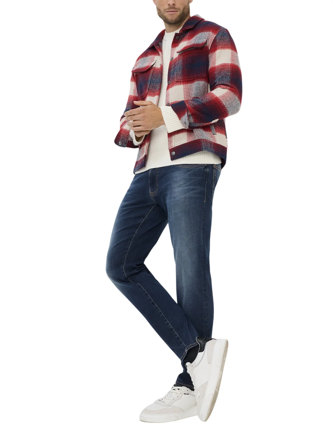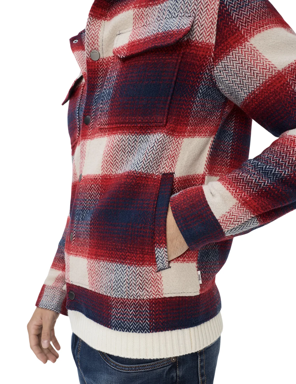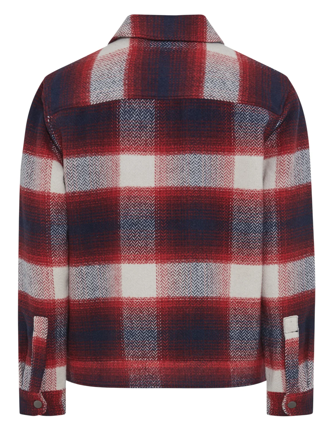 Сорочка виготовлена з поліестеру та вовни. Модель виконана в прямому крої. Має класичний відкладний комір, планку з кнопками, накладні нагрудні кишені з клапанами, довгі рукави з манжетами та дві прорізні бічні кишені. Декорована принтом у клітинку.