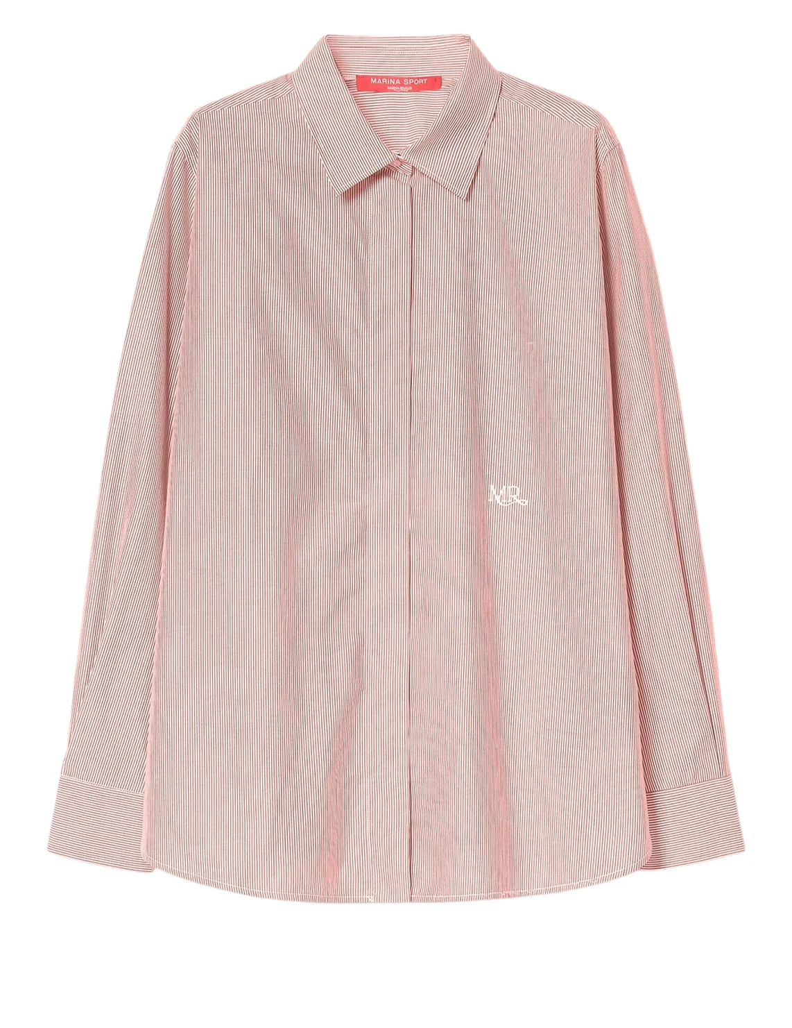 Сорочка виготовлена зі 100% бавовни високої якості. Модель виконана в прямому крої. Має відкладний комір, приховану планку на ґудзиках, бічні розрізи та довгі рукави з манжетами. Декорована принтом у смужку та логотипом бренду.