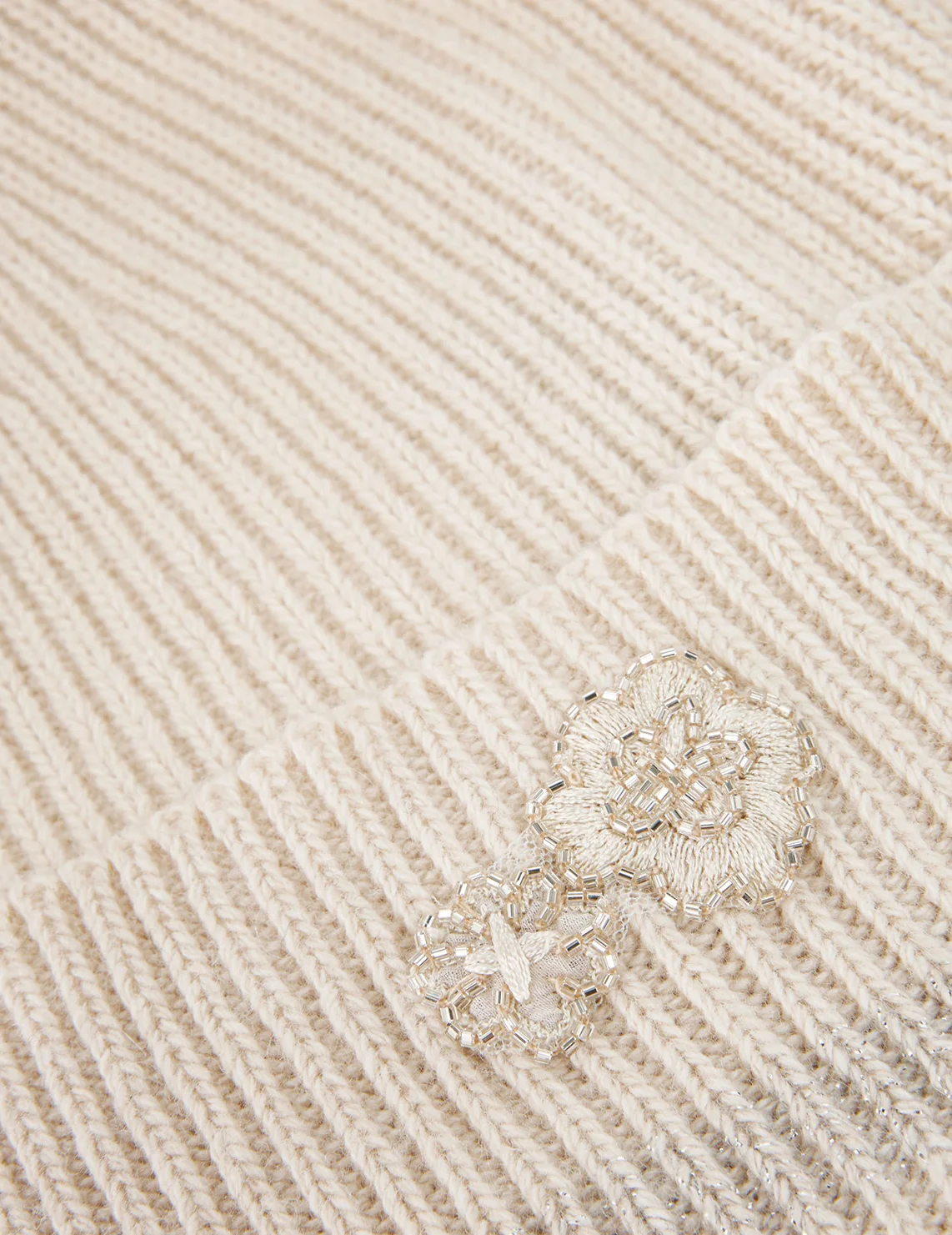 Шапка виготовлена з поліаміду, віскози, вовни, кашеміру та металізованого поліестеру. Модель має класичний відворот, вишивку з бісеру у вигляді квіток та хутряний помпон.