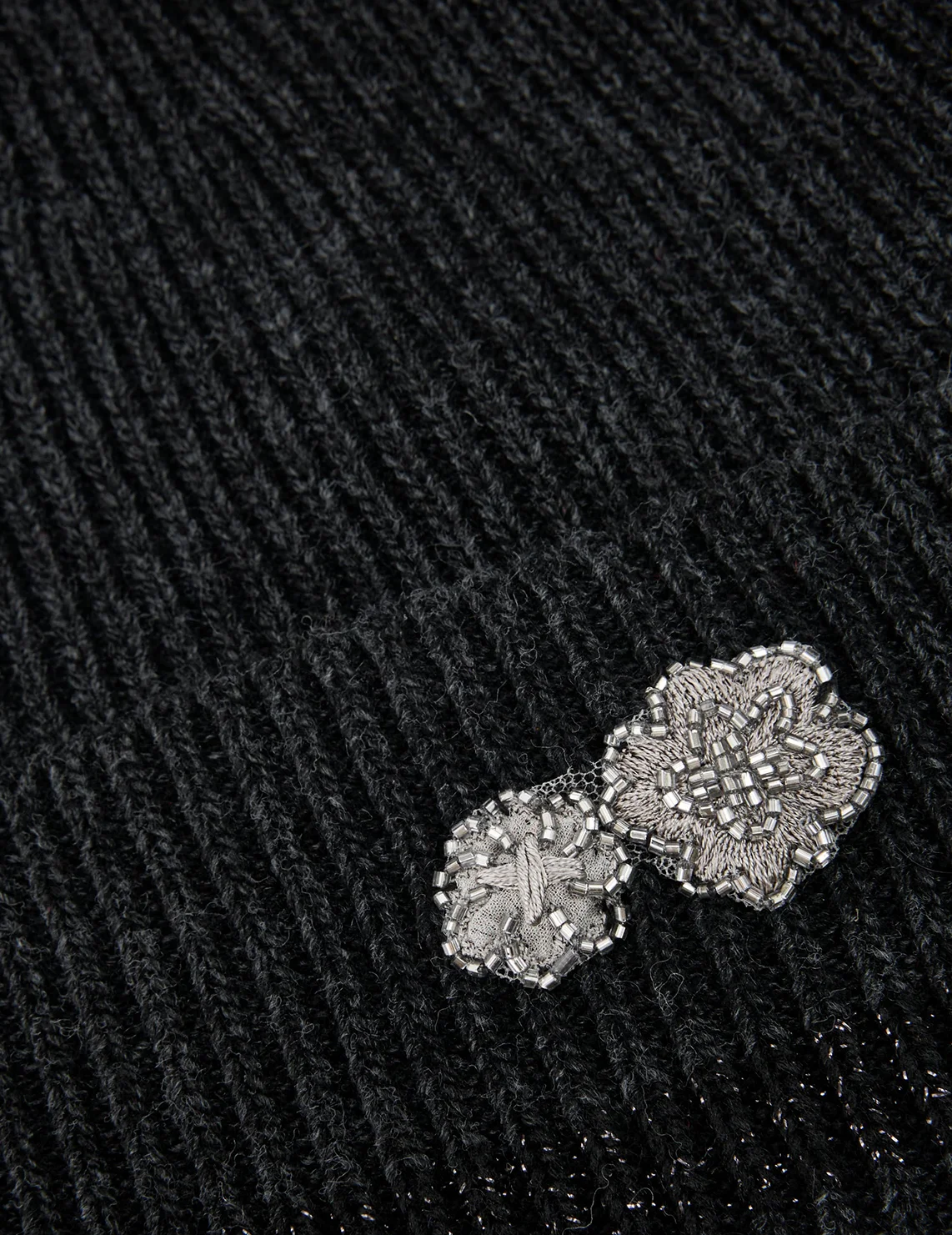 Шапка виготовлена з поліаміду, віскози, вовни, кашеміру та металізованого поліестеру. Модель має класичний відворот, вишивку з бісеру у вигляді квіток та хутряний помпон.