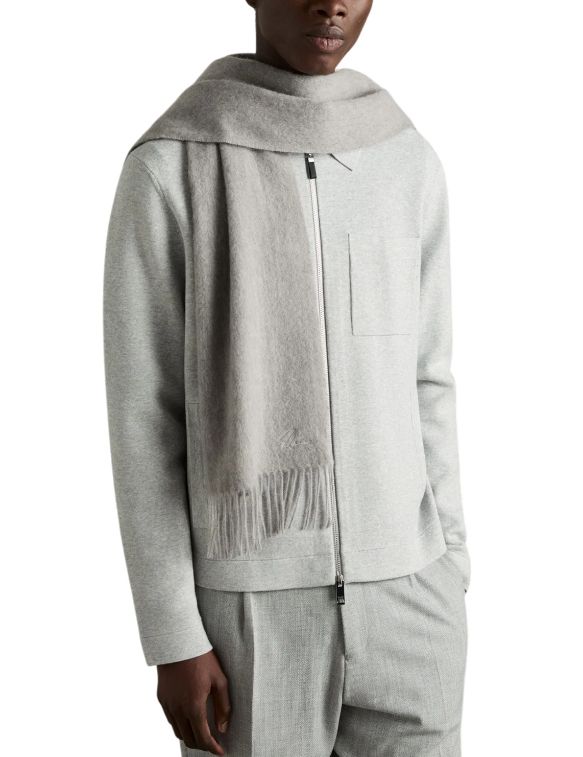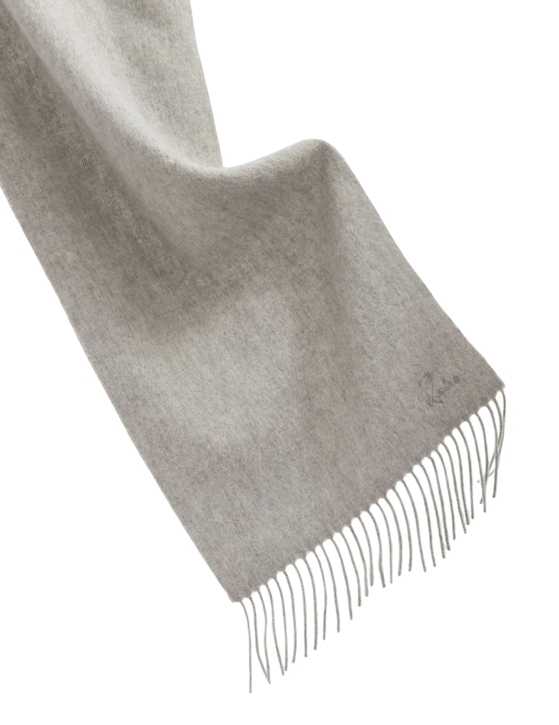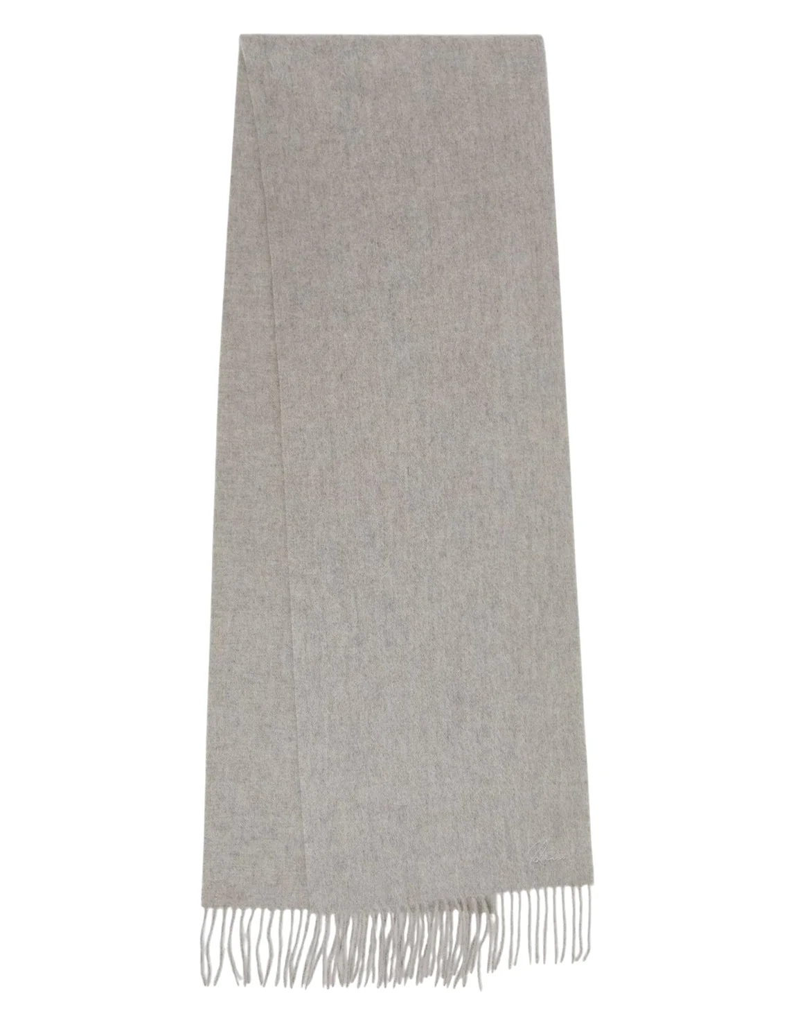 Шарф виготовлений із вовни та кашеміру. Модель має класичний дизайн, вишивку з написом бренду та бахрому по краях.