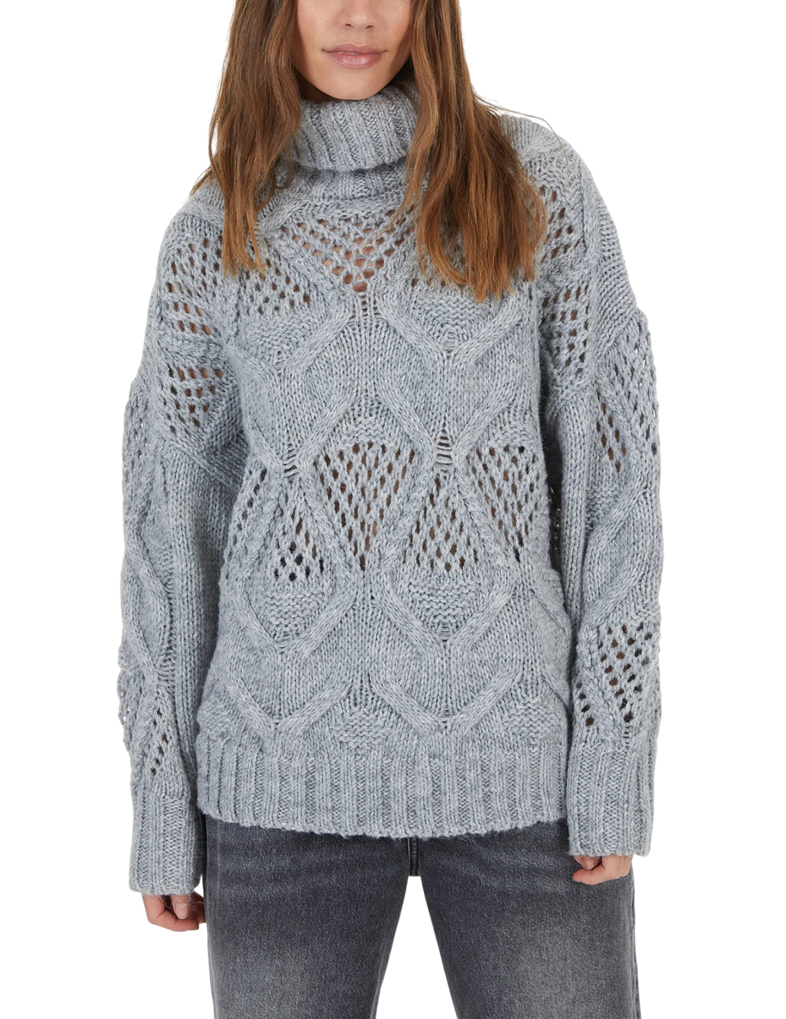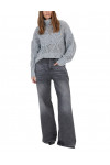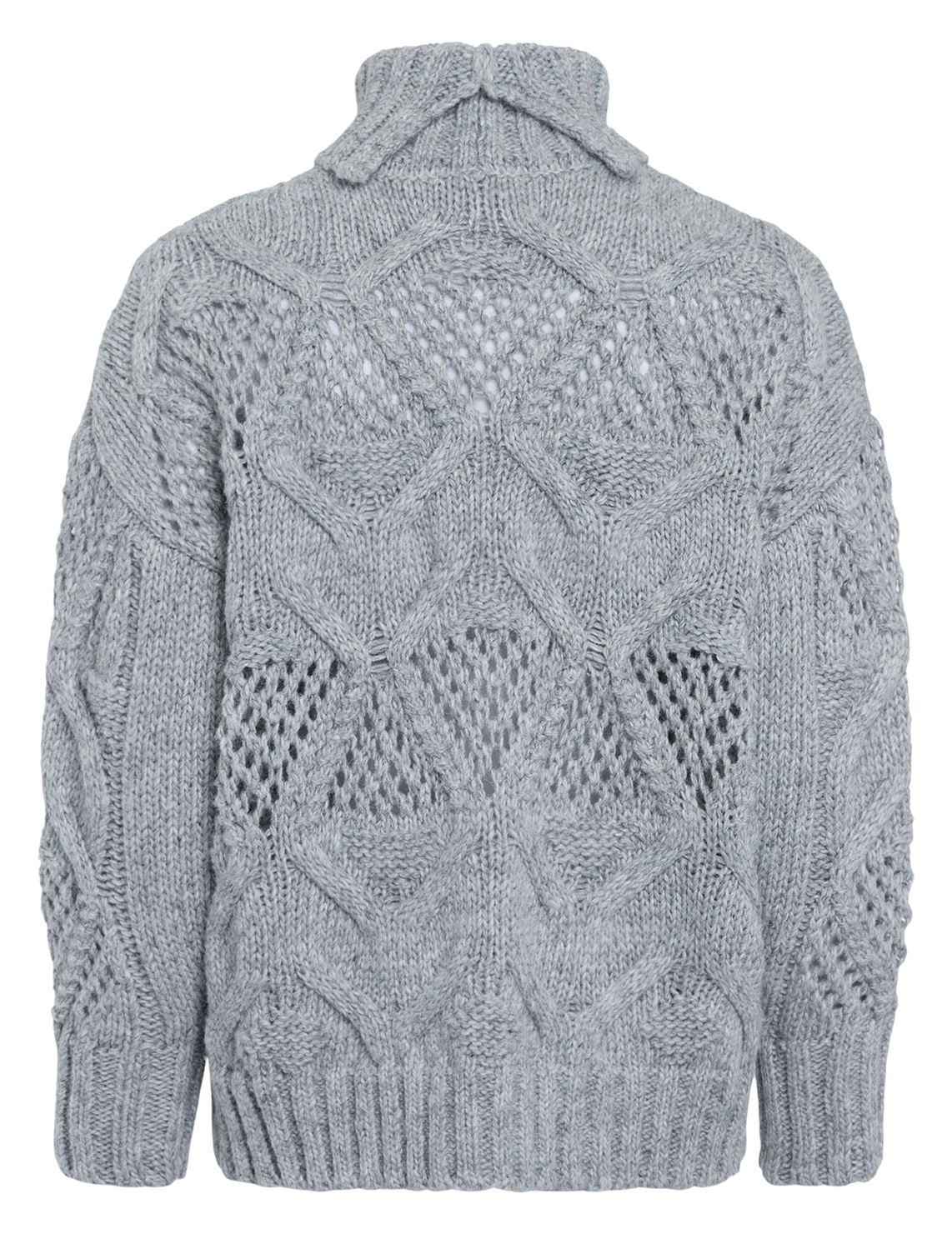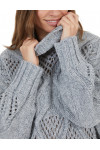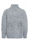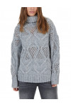 Светр виготовлений із поліестеру, поліакрилу та вовни. Модель виконана у вільному крої. Має комір-стійку з відворотом, довгі рукави з манжетами в рубчик, занижену плечову лінію і перфорацію.