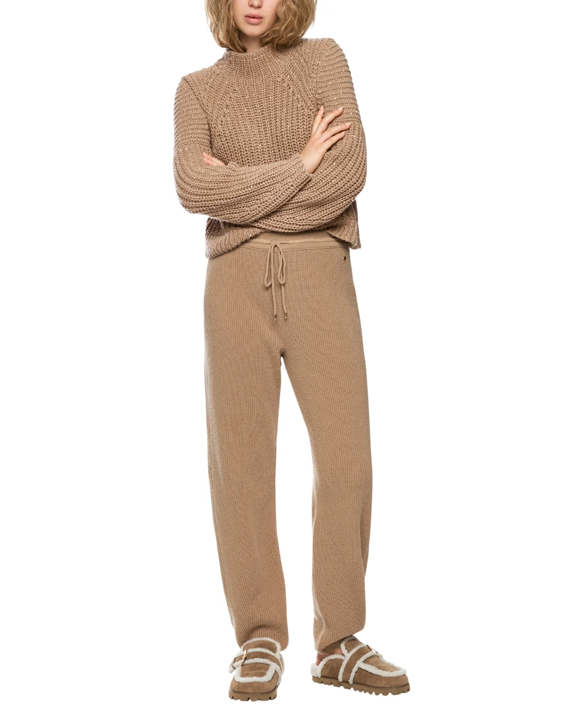Светр виготовлено з вовни, кашеміру, поліаміду, шовку та поліестеру. Модель виконана в прямому крої. Має комір-стійку та довгі рукави з манжетами.