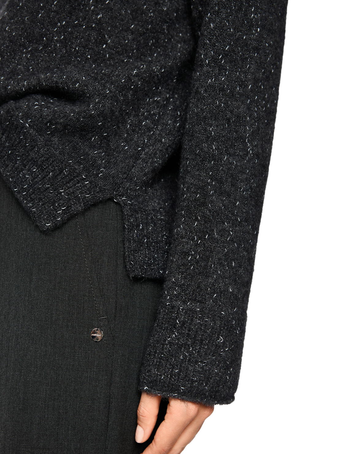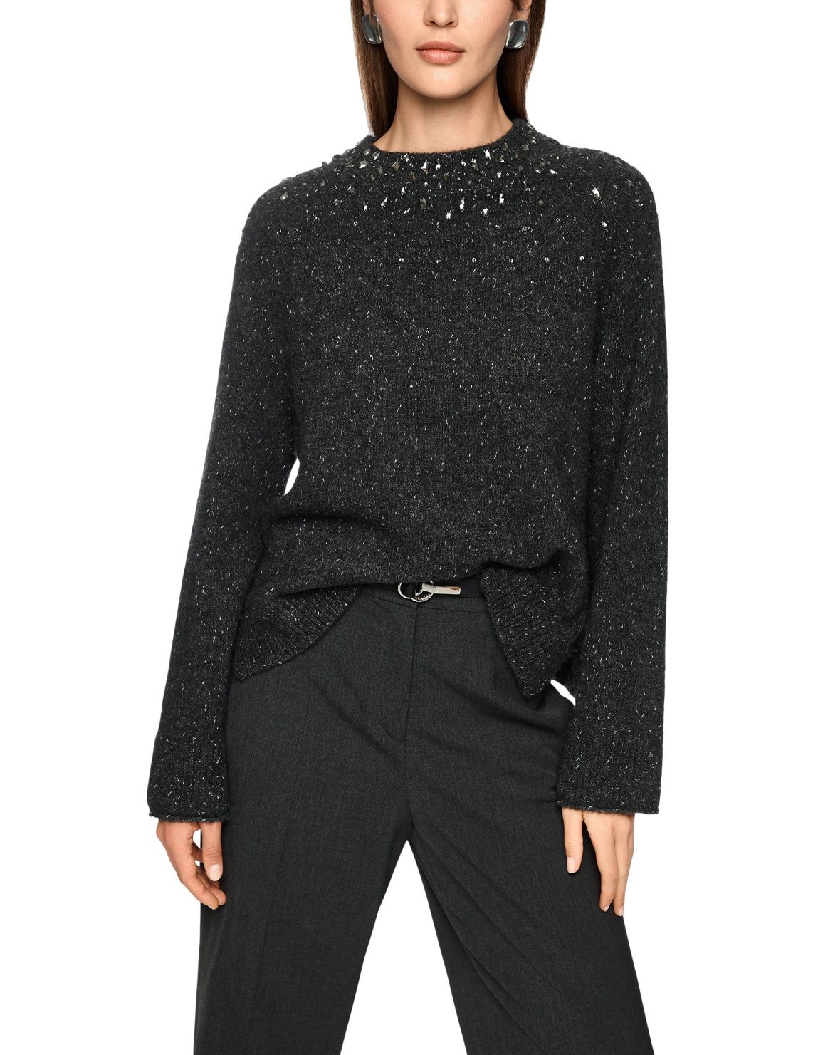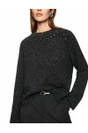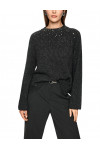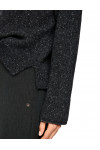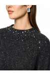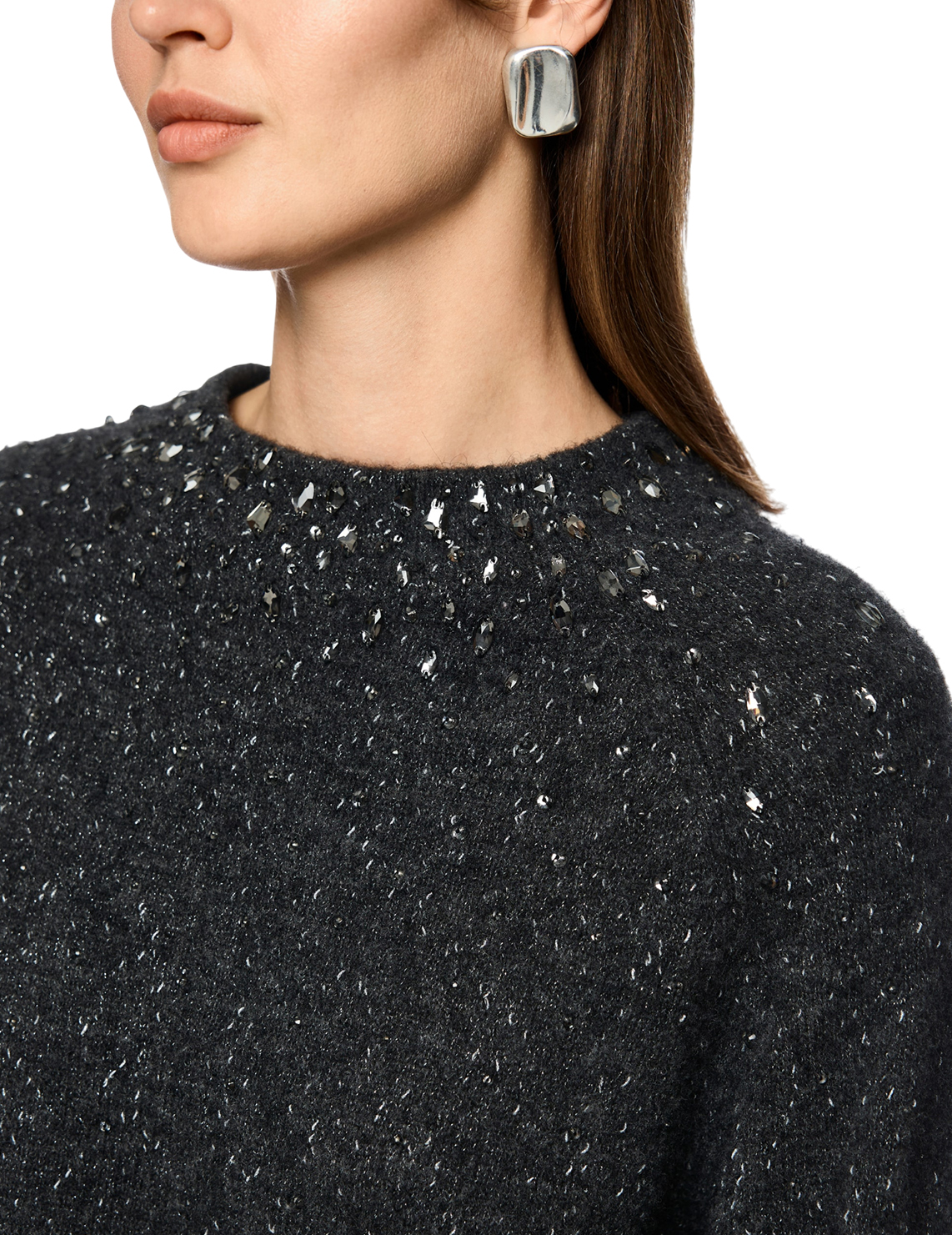 Светр виготовлено з поліаміду, альпаки, вовни, поліестеру та металізованого волокна. Модель виконана у вільному крої. Має комір-стійку, занижену плечову лінію та довгі рукави з манжетами. Декорований стразами.