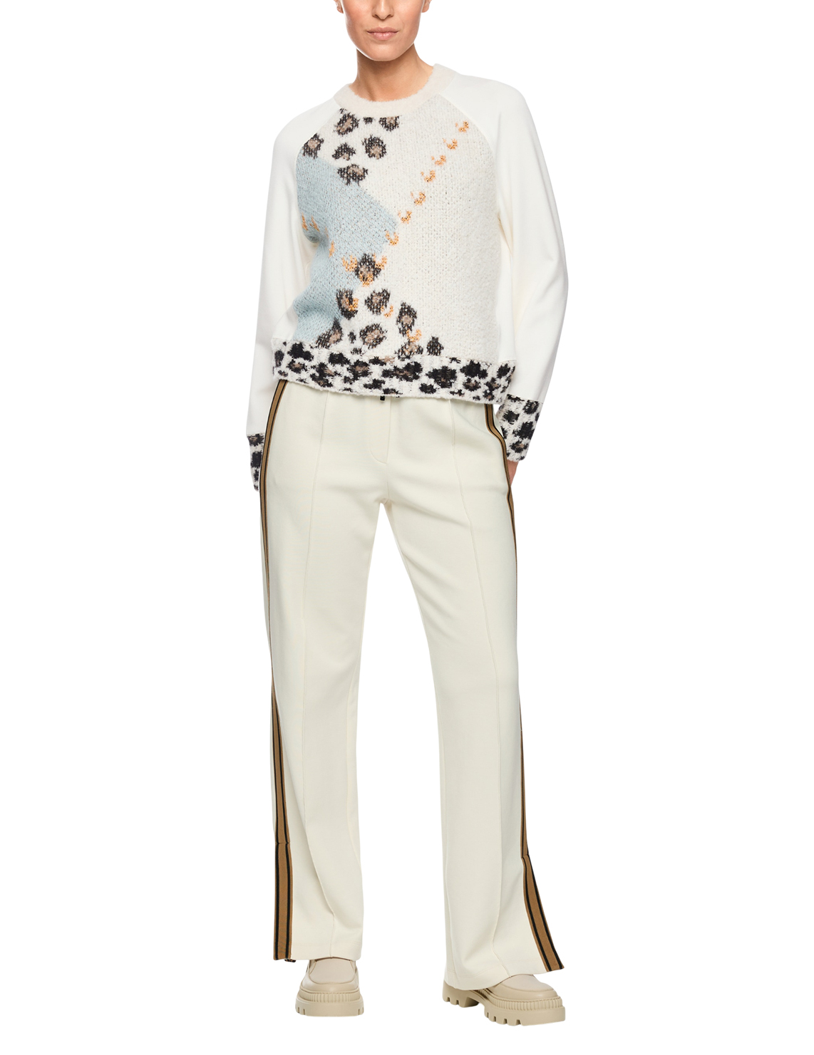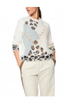 Светр виготовлений із поліаміду, віскози та еластану. Модель виконана у вільному крої. Має круглий виріз горловини, занижену плечову лінію та довгі рукави з манжетами. Декорований оригінальним принтом.