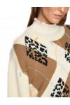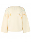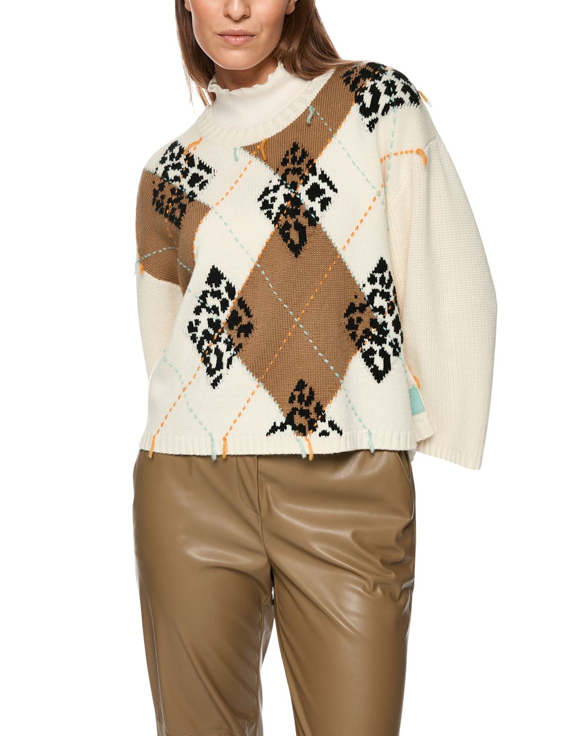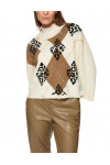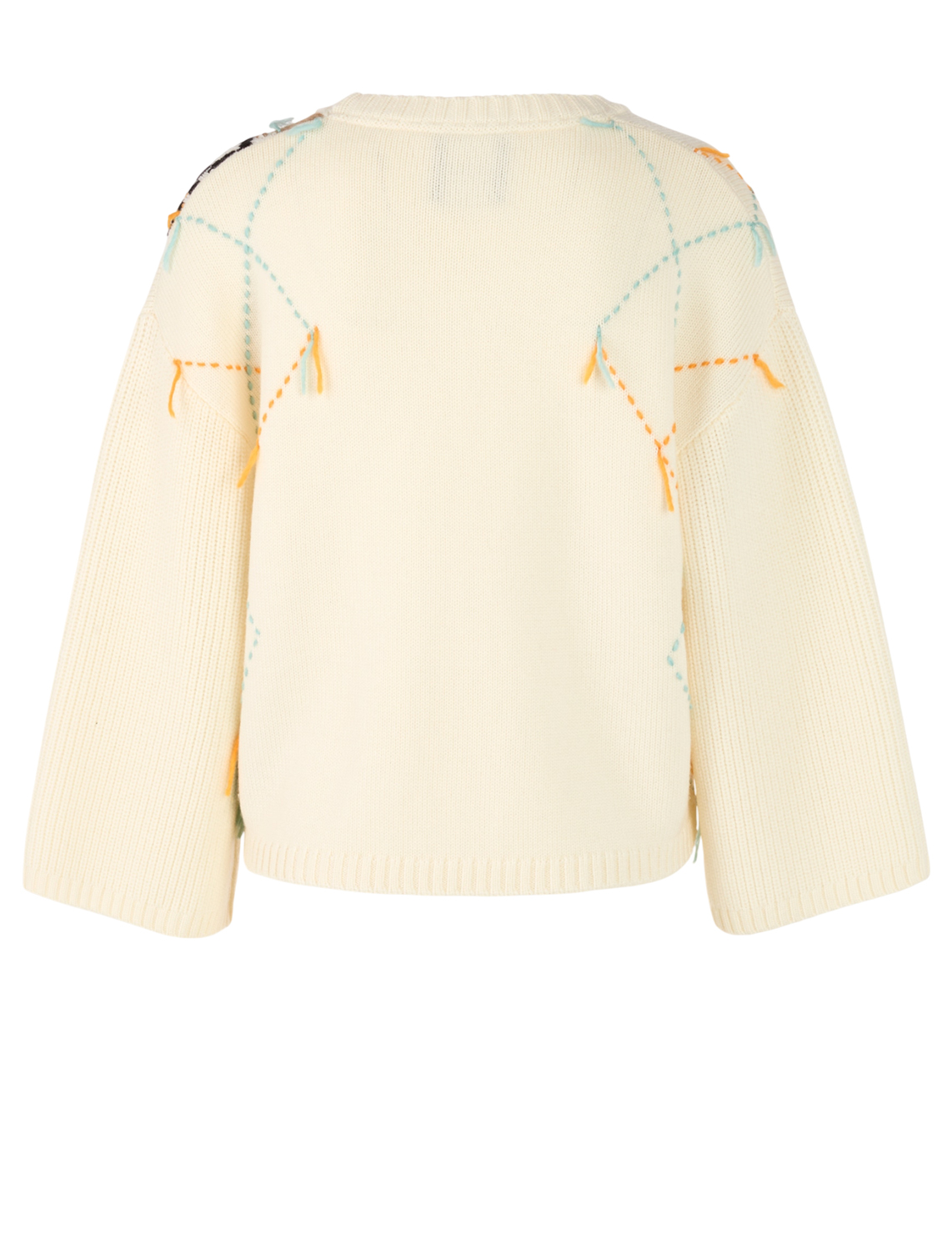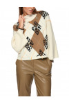 Светр виготовлений зі 100% вовни високої якості. Модель виконана у вільному крої. Має круглий виріз горловини, занижену плечову лінію та довгі рукави. Декорований геометричним принтом і вишивкою.