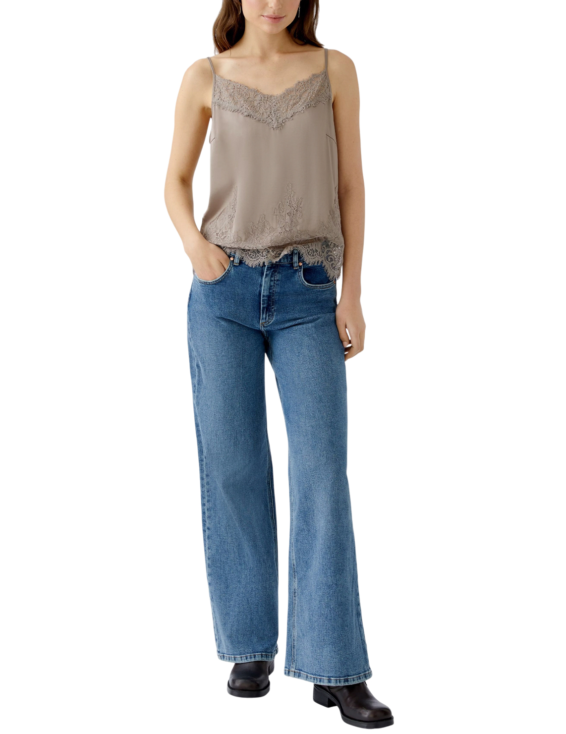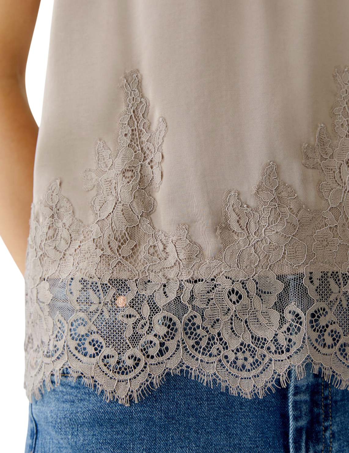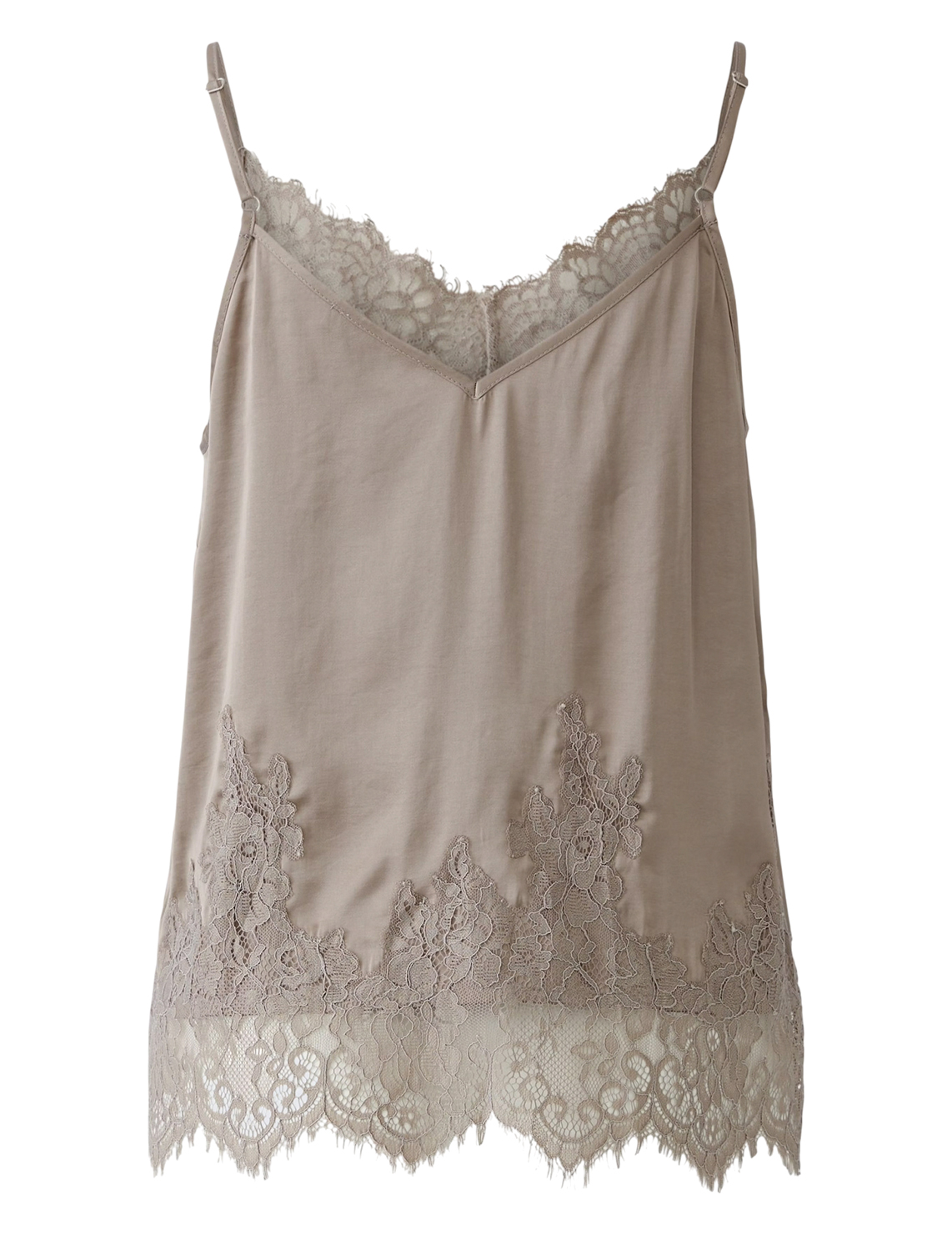 Топ виготовлений із поліестеру та віскози. Модель виконана в прямому крої. Має V-подібний виріз горловини та тонкі регульовані бретелі. Декорований мереживом.