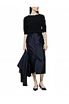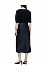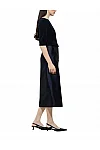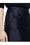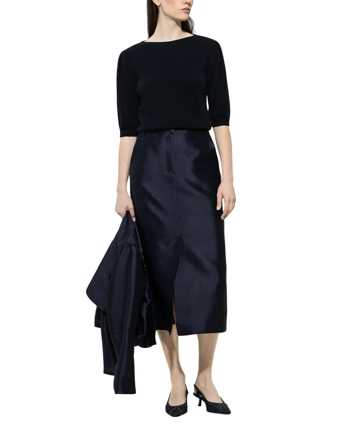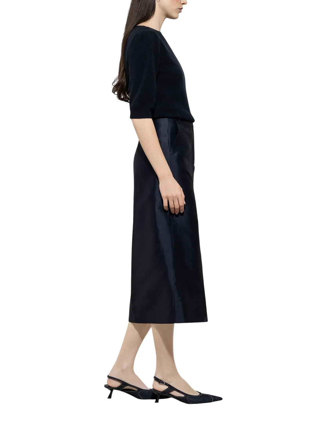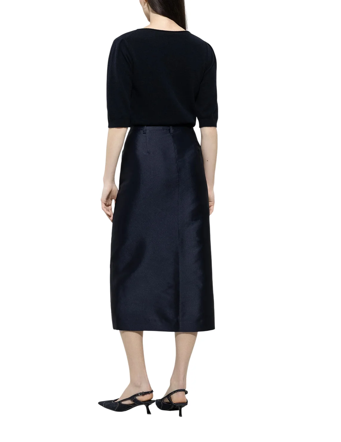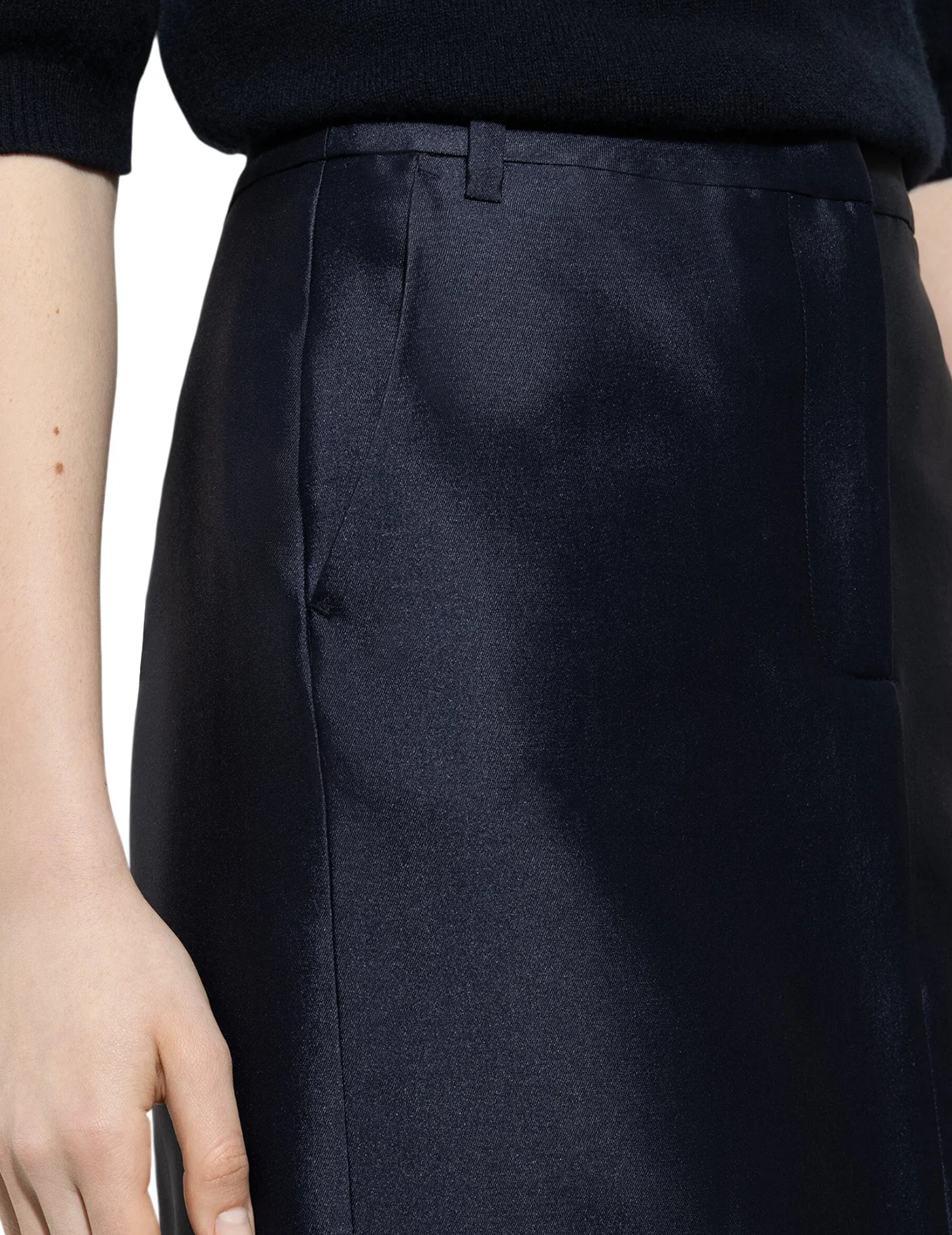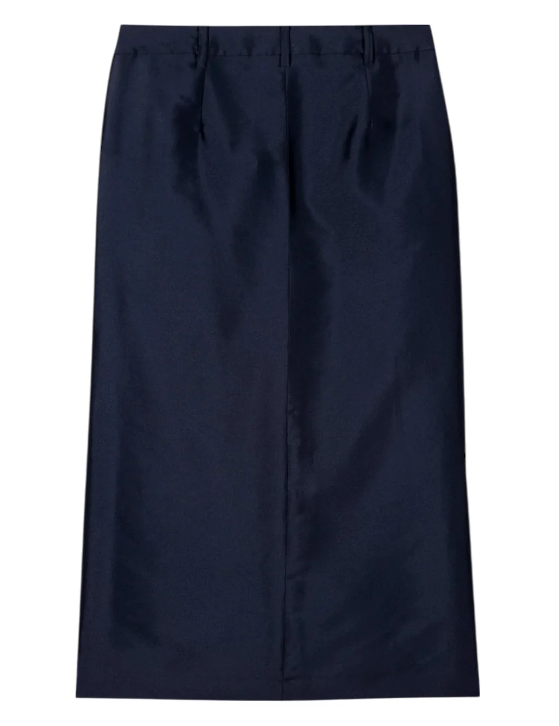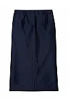 Спідниця виготовлена з поліестеру та шовку. Модель довжини міді виконана в прямому крої. Має шльовки для ременя, приховану застібку-блискавку з гачком, прорізні кишені та розріз спереду.