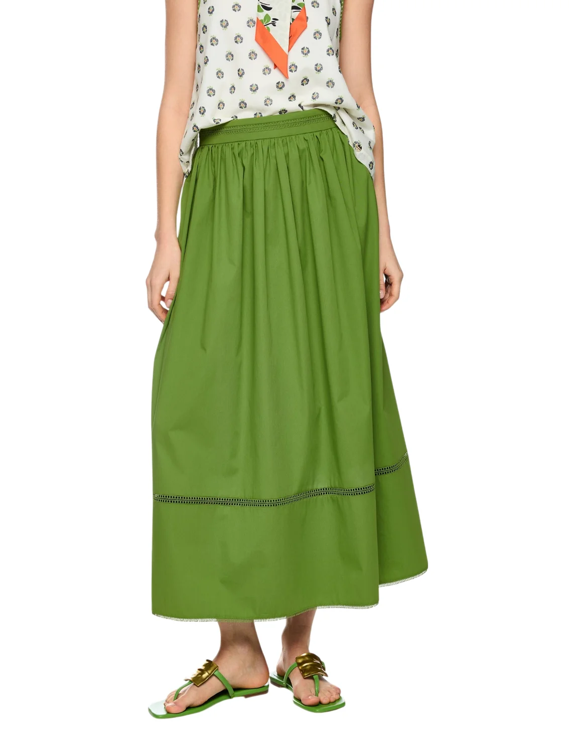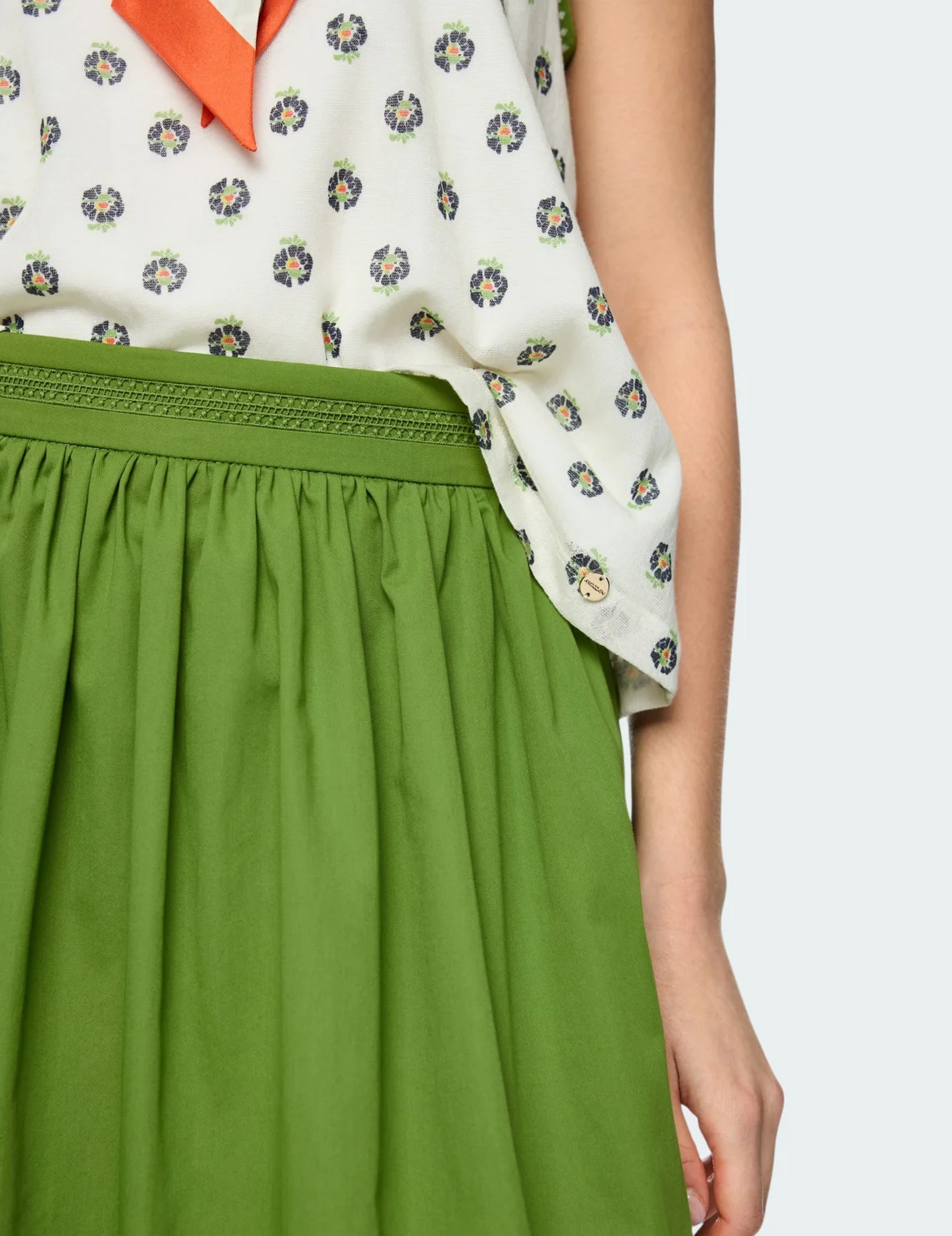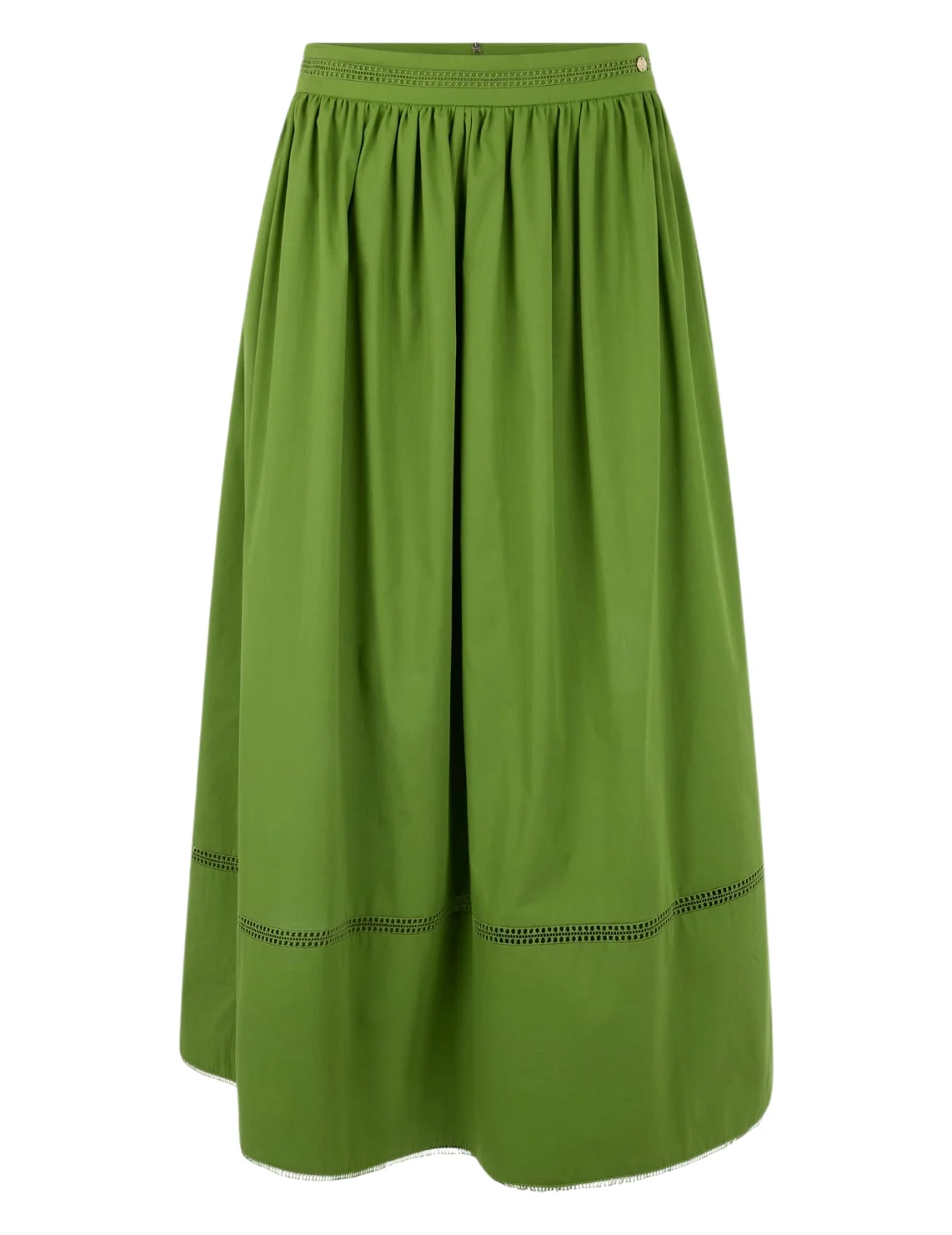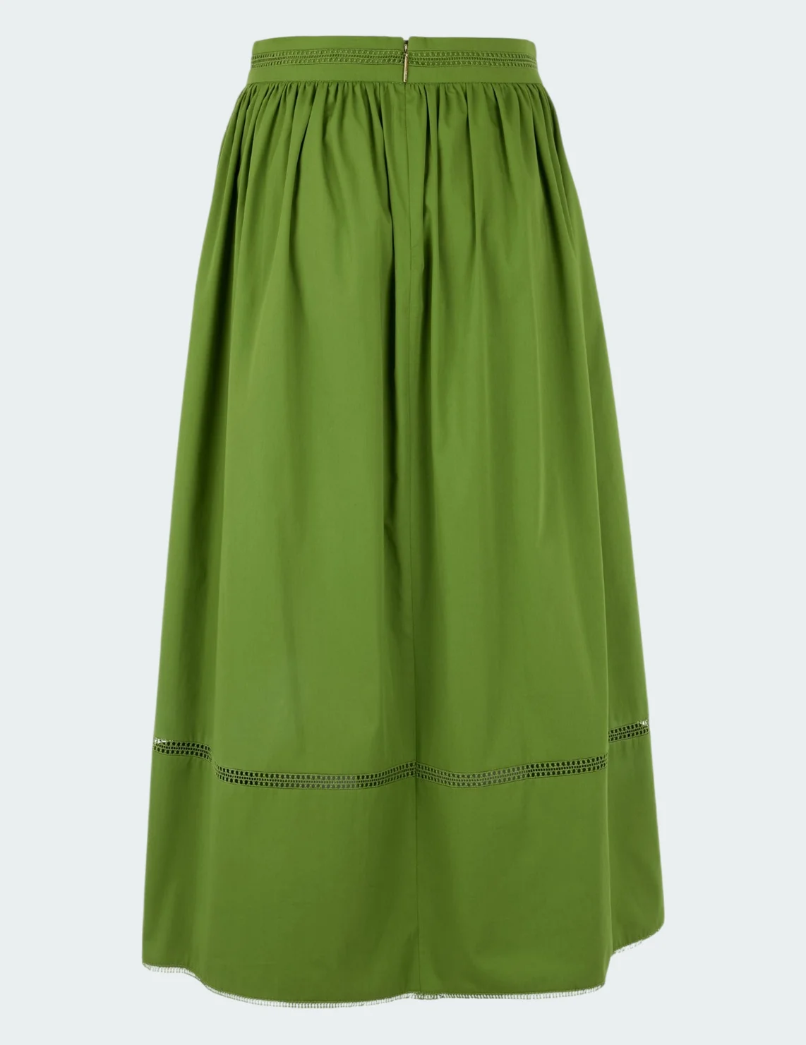 Спідниця виготовлена з бавовни, поліестеру та еластану. Модель довжини міді виконана у розкльошеному крої. Має еластичний пояс, перфорацію та бахрому на подолі. Застібається на приховану блискавку ззаду.