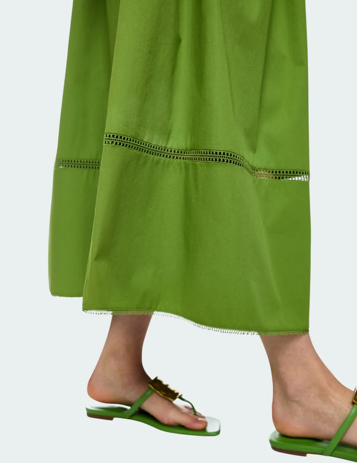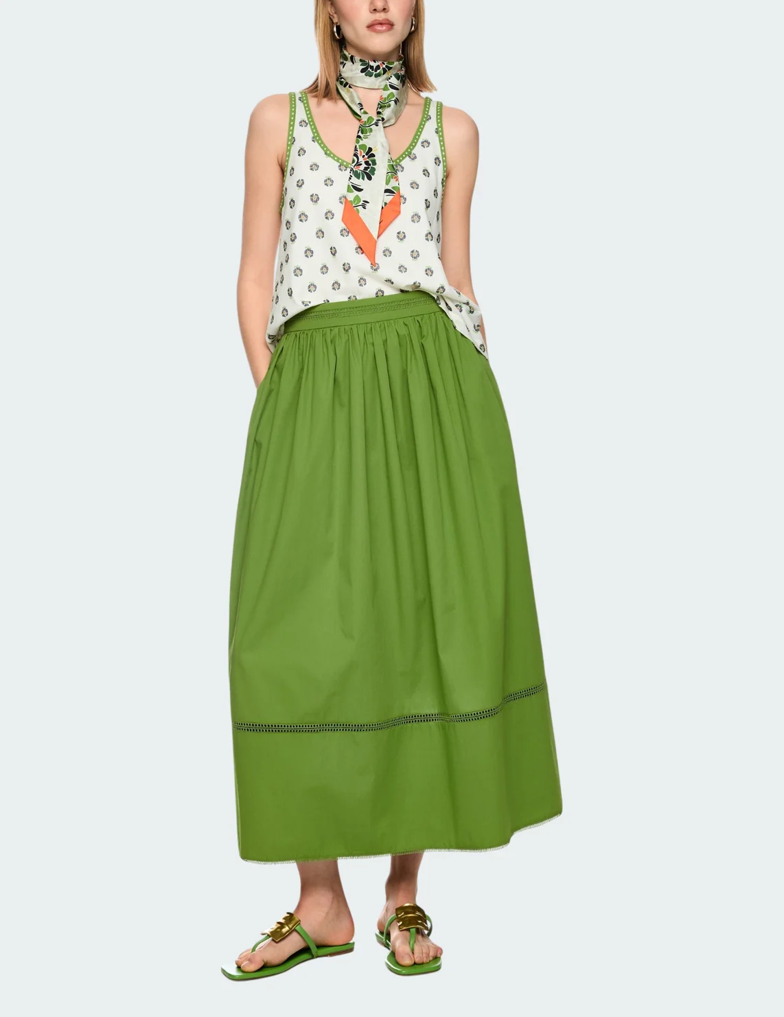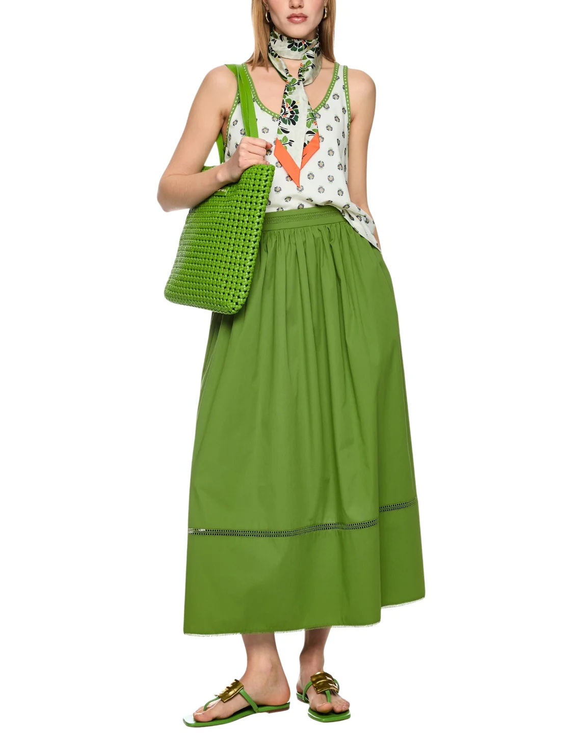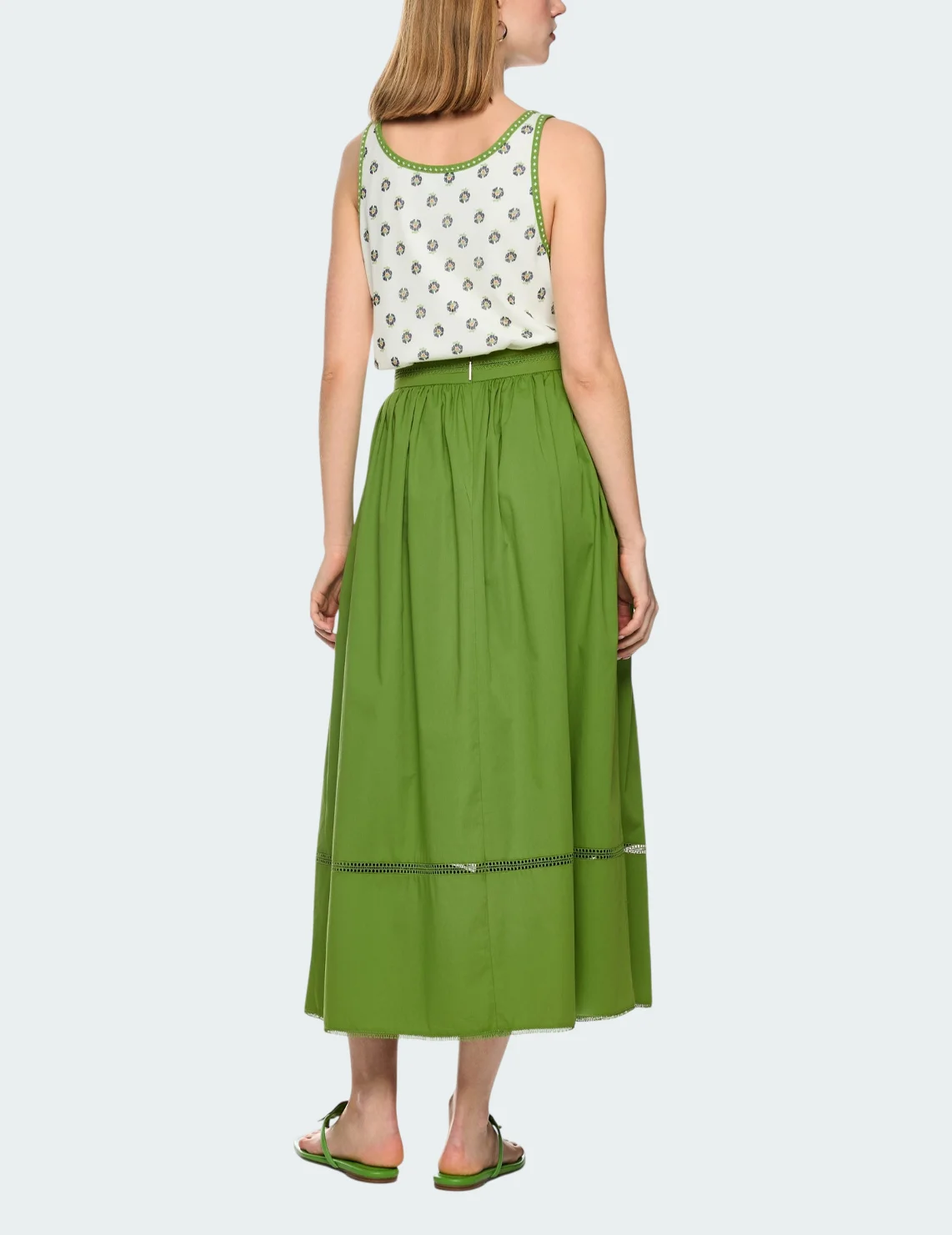 Спідниця виготовлена з бавовни, поліестеру та еластану. Модель довжини міді виконана у розкльошеному крої. Має еластичний пояс, перфорацію та бахрому на подолі. Застібається на приховану блискавку ззаду.