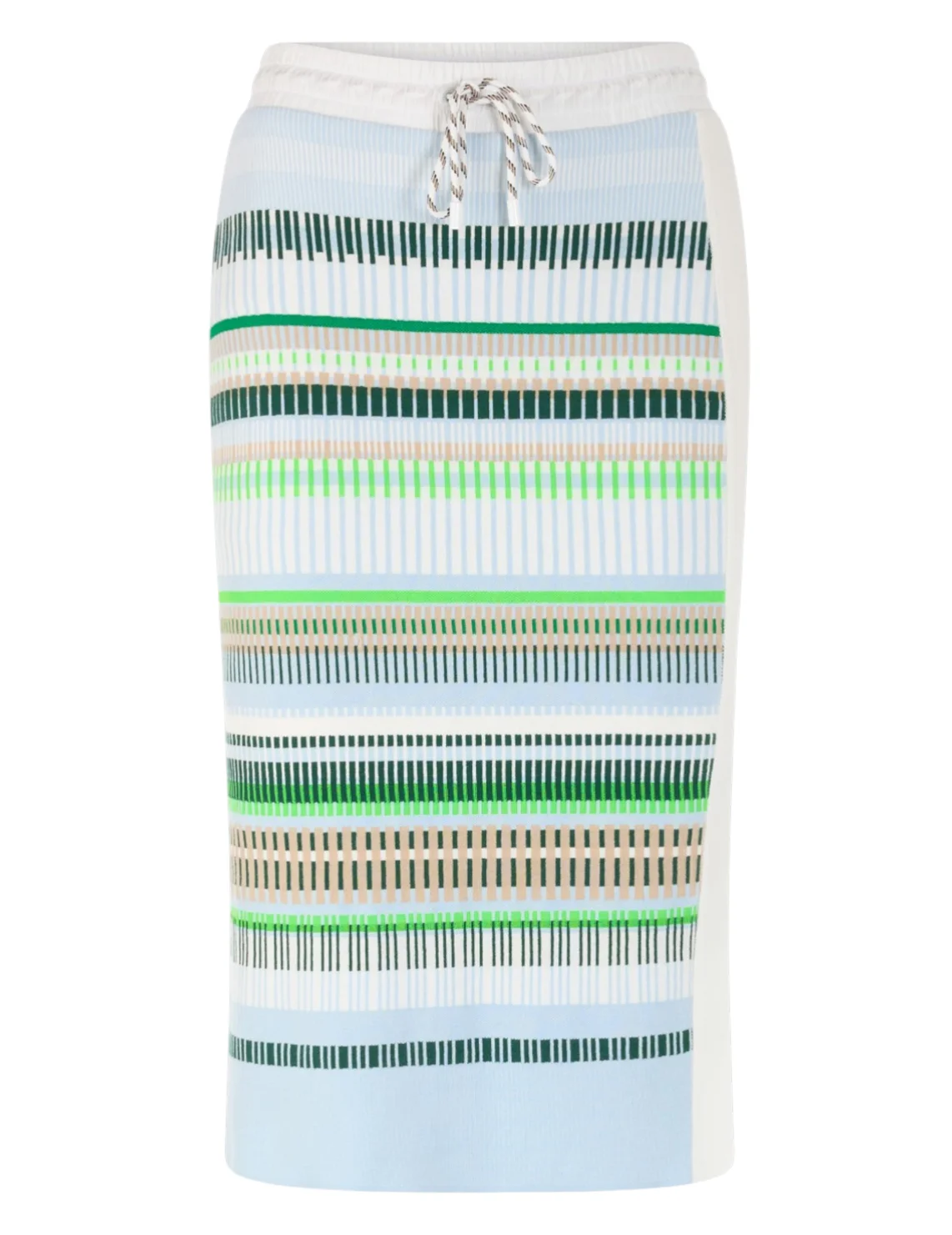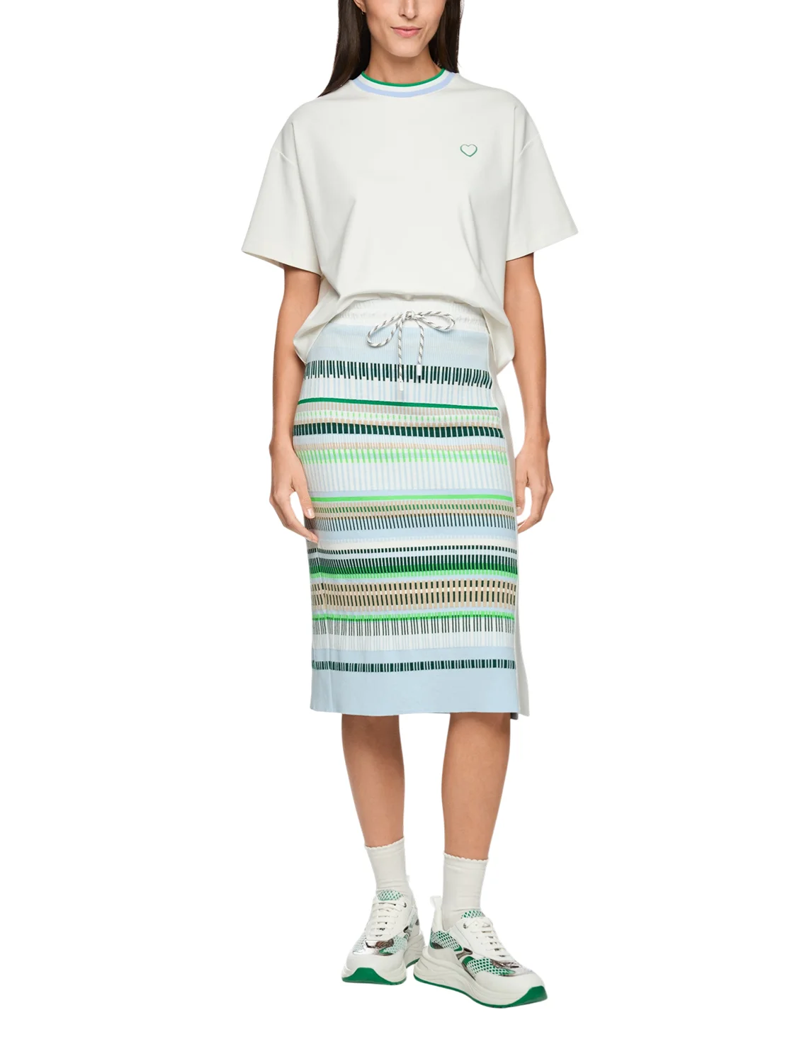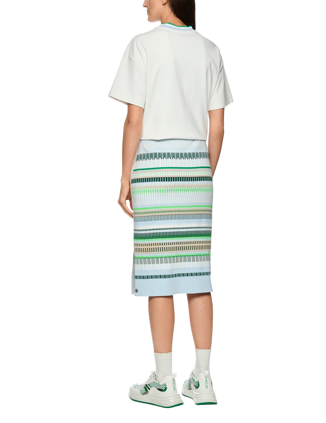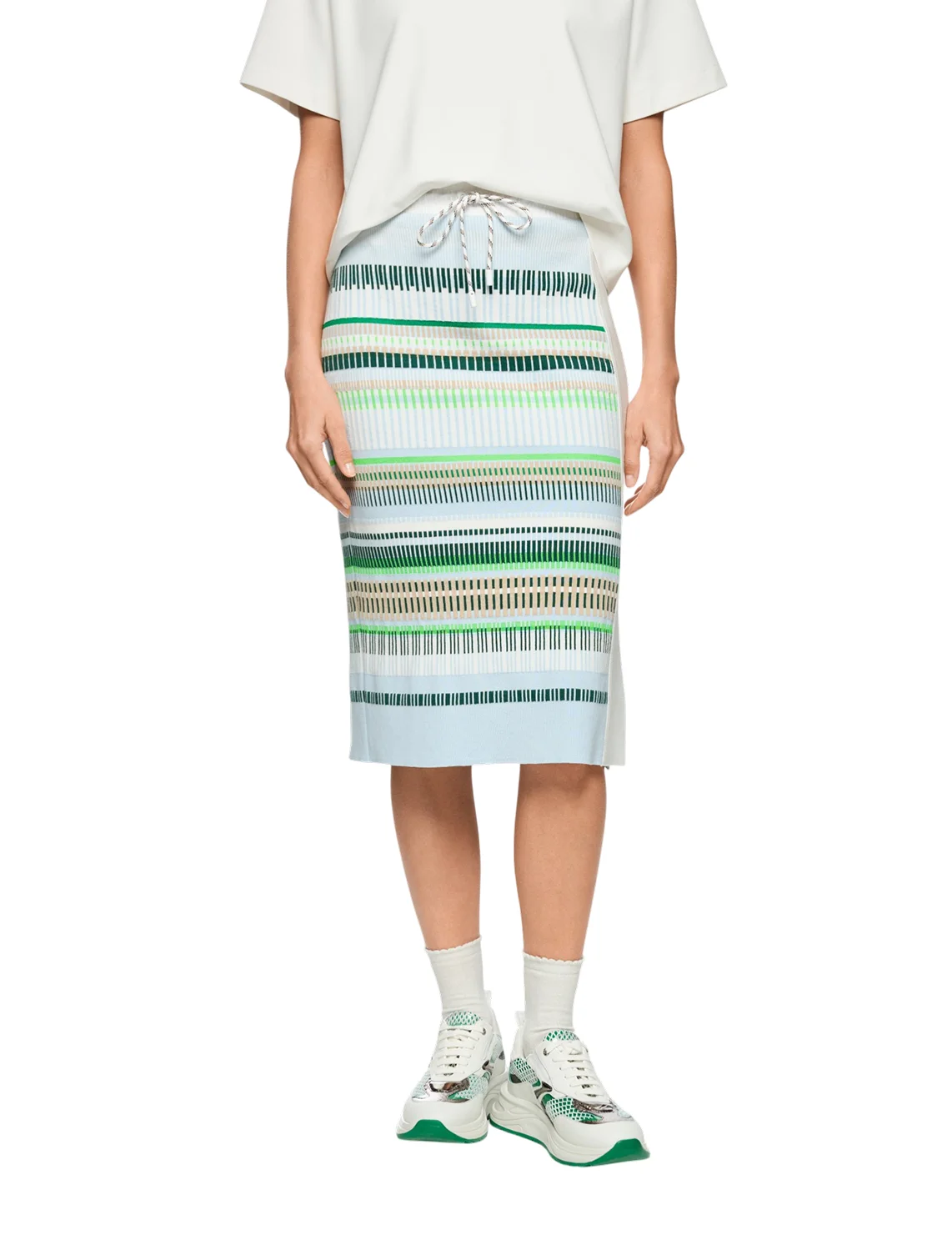 Спідниця виготовлена з бавовни та поліестеру. Модель довжини міді виконана в завуженому крої. Має еластичний пояс з куліскою та бічний розріз. Декорована принтом у смужку.