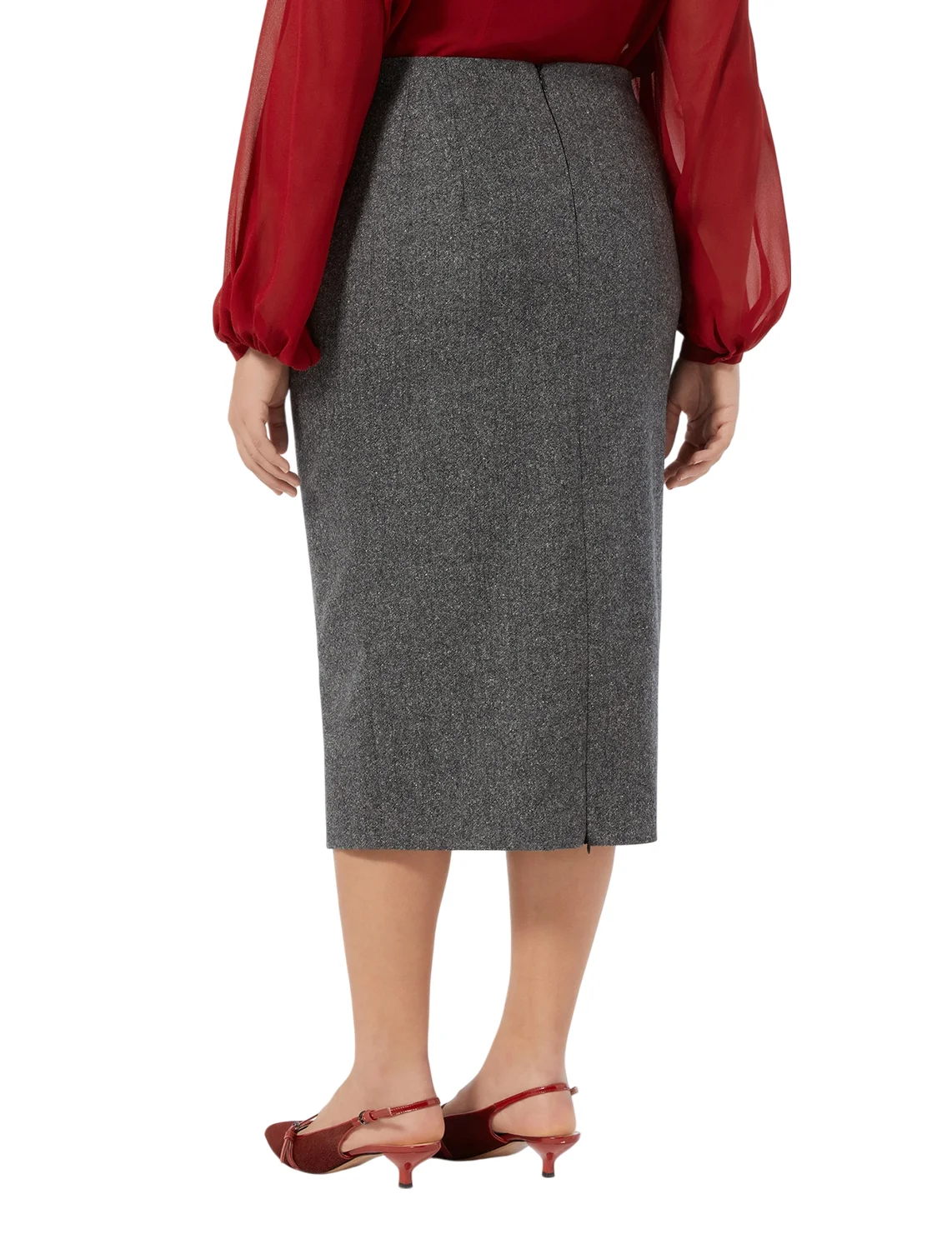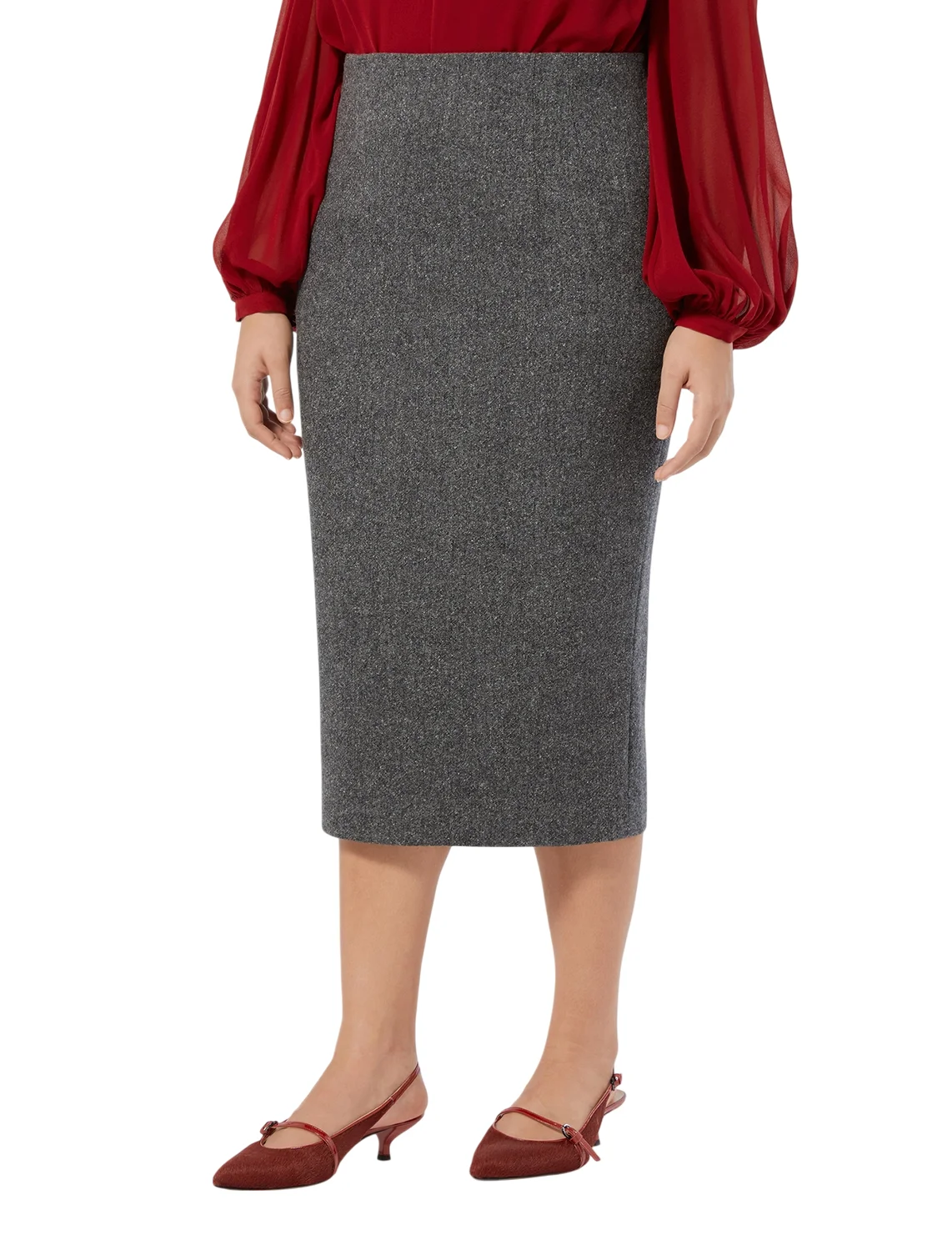 Спідниця виготовлена з вовни, поліаміду, шовку та еластану, підкладка з віскози та поліестеру. Модель довжиною міді виконана в завуженому крої. Має двосторонню застібку-блискавку ззаду.