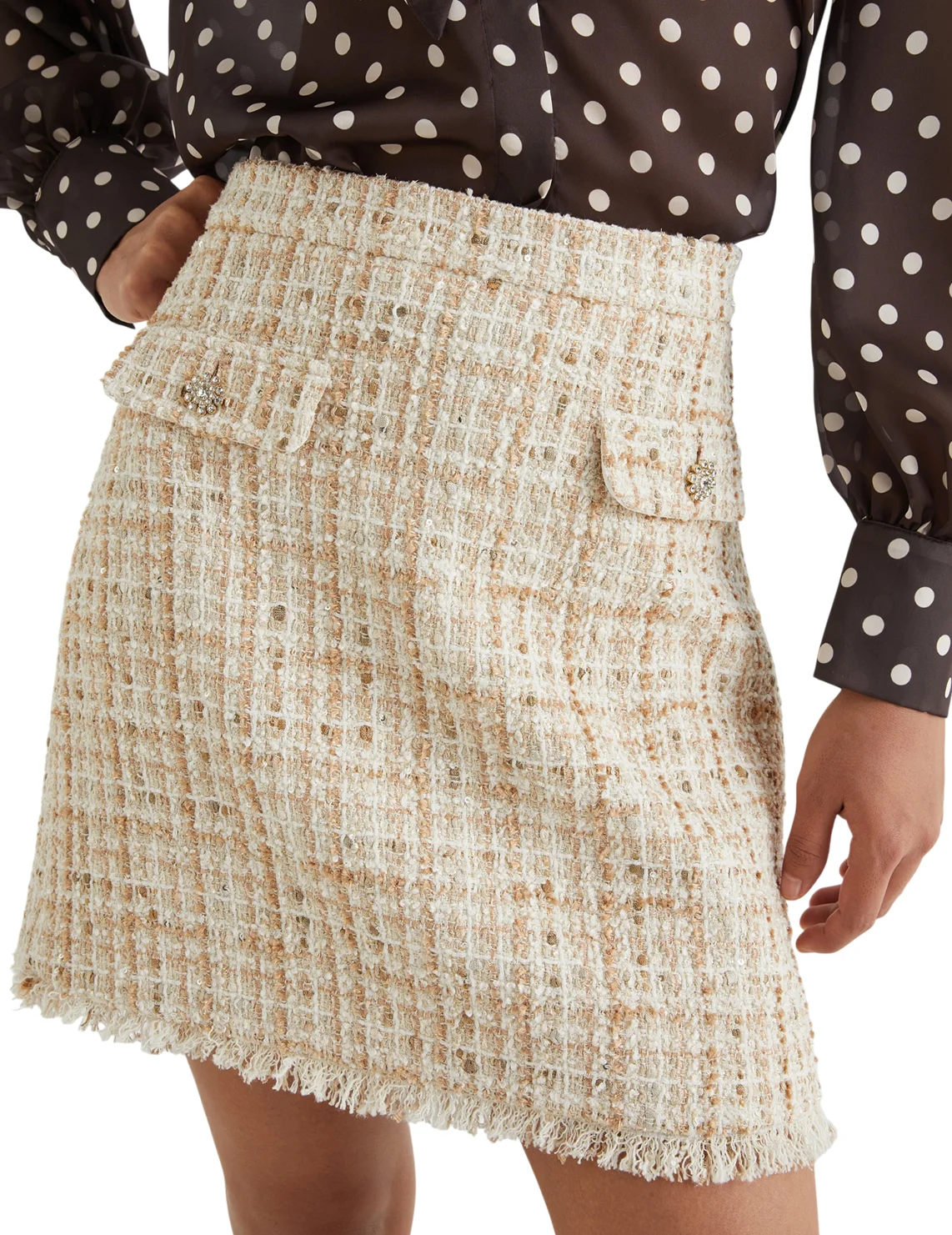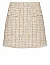 Спідниця виготовлена з бавовни, поліестеру, поліаміду, віскози та металізованої нитки. Модель довжини міні виконана в прямому крої. Має приховану застібку-блискавку ззаду та кишені з клапанами. Декорована принтом у клітинку та бахромою.