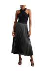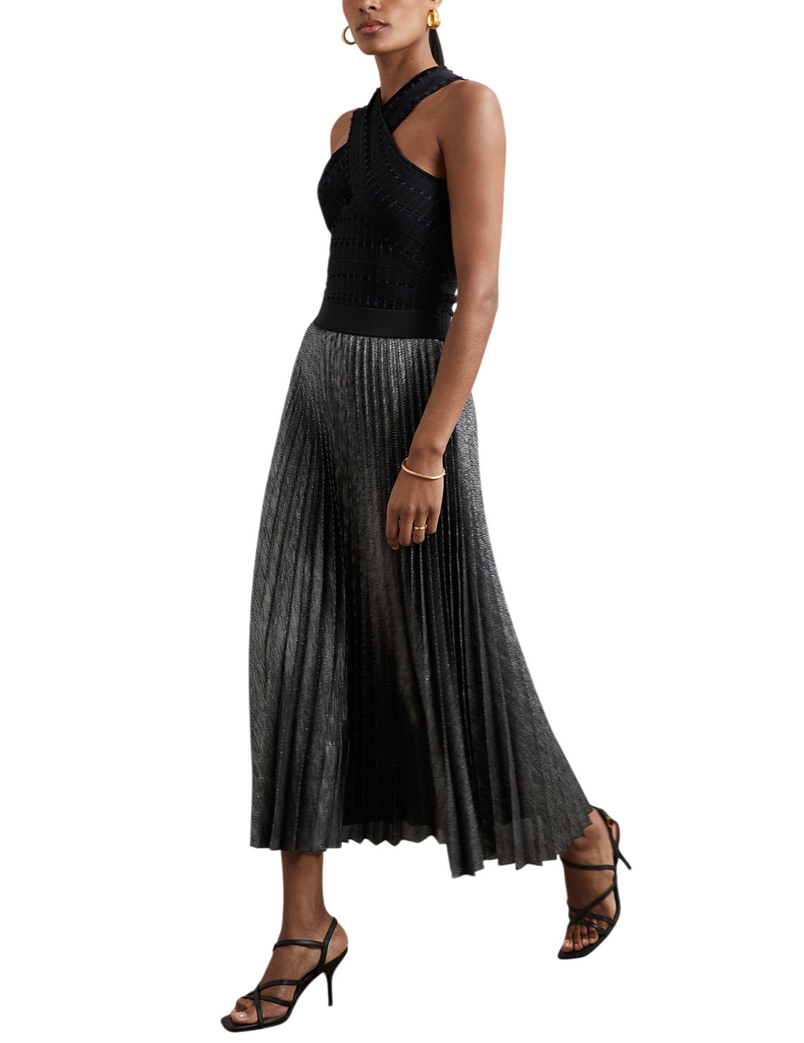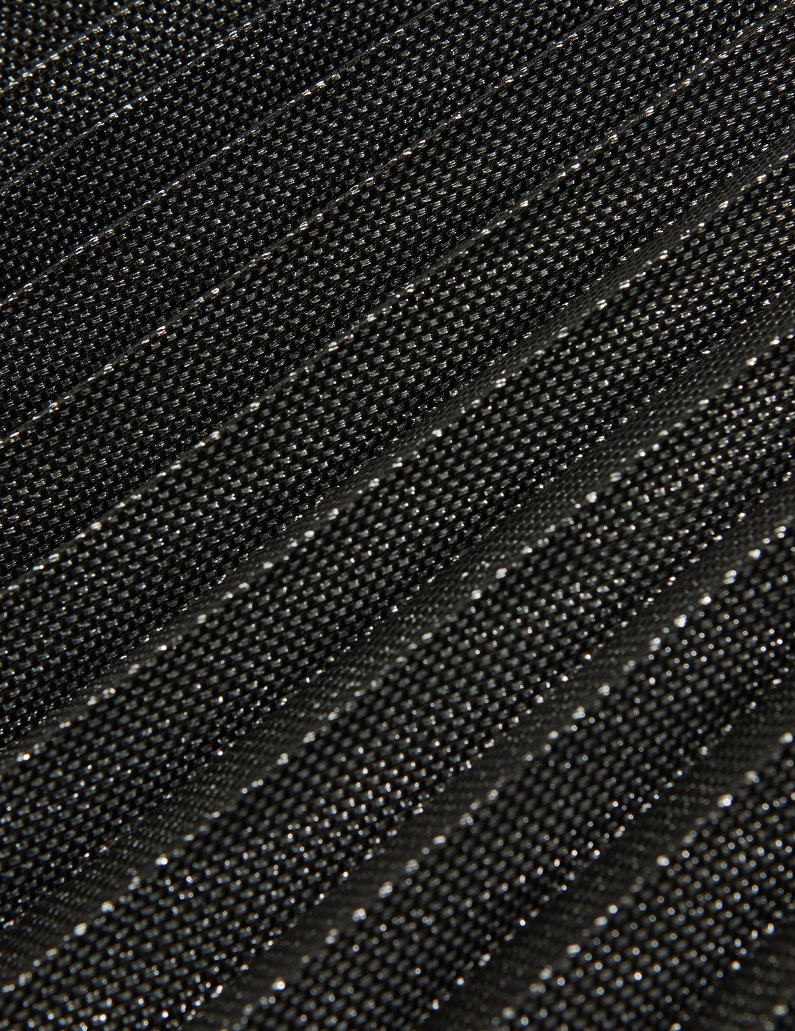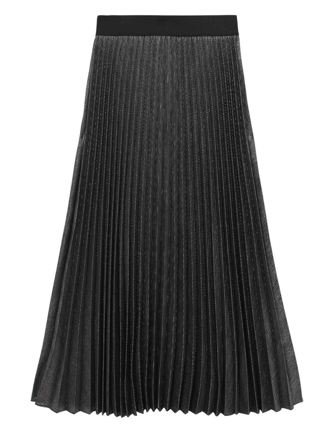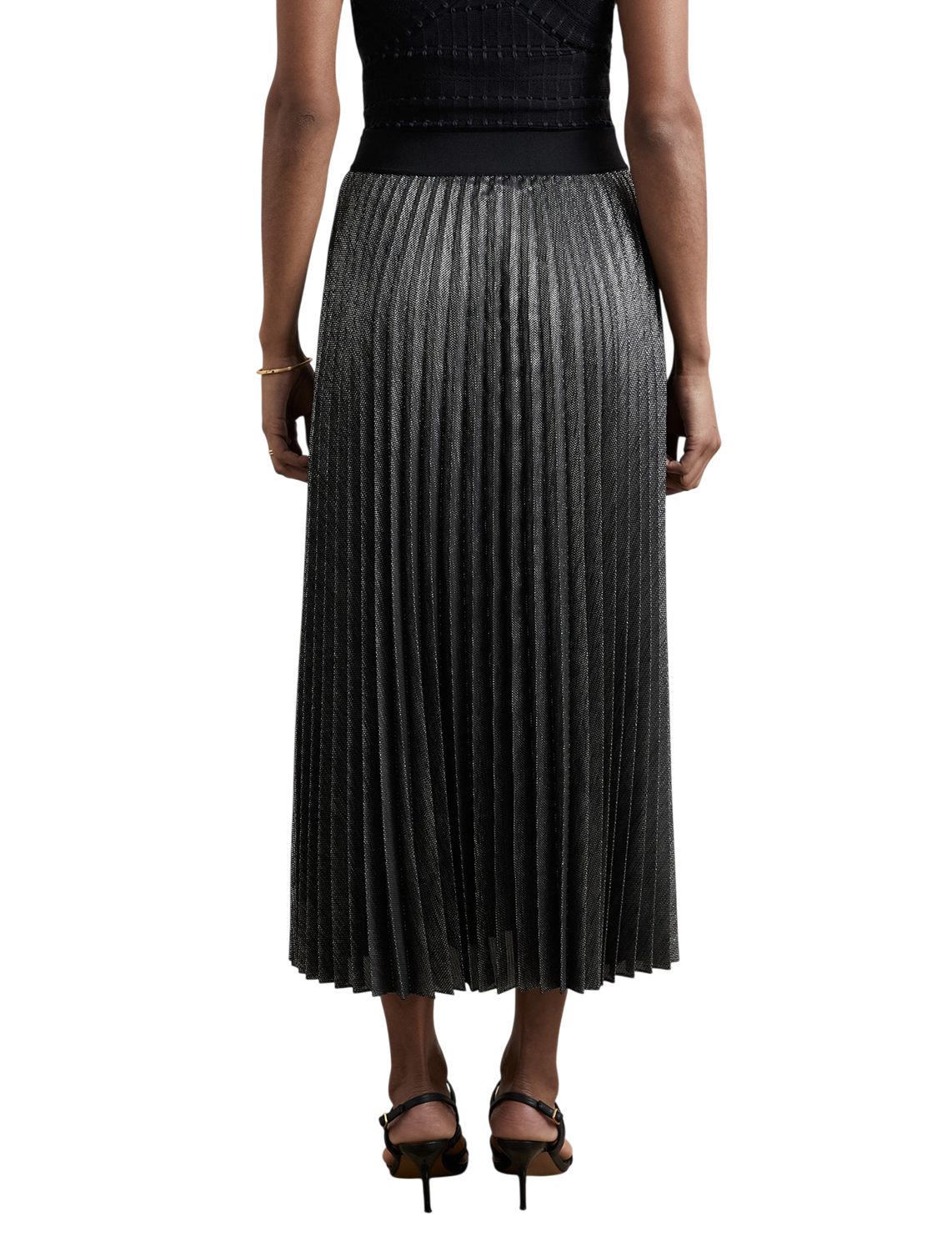 Спідниця виготовлена з поліестеру та металізованого волокна, підкладка з віскози, нейлону та еластану. Модель довжини міді виконана в розкльошеному крої. Має еластичний пояс та плісування.