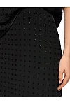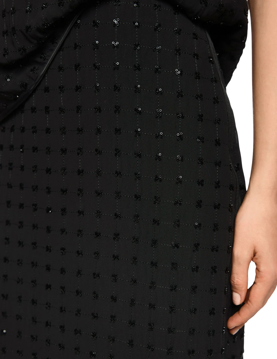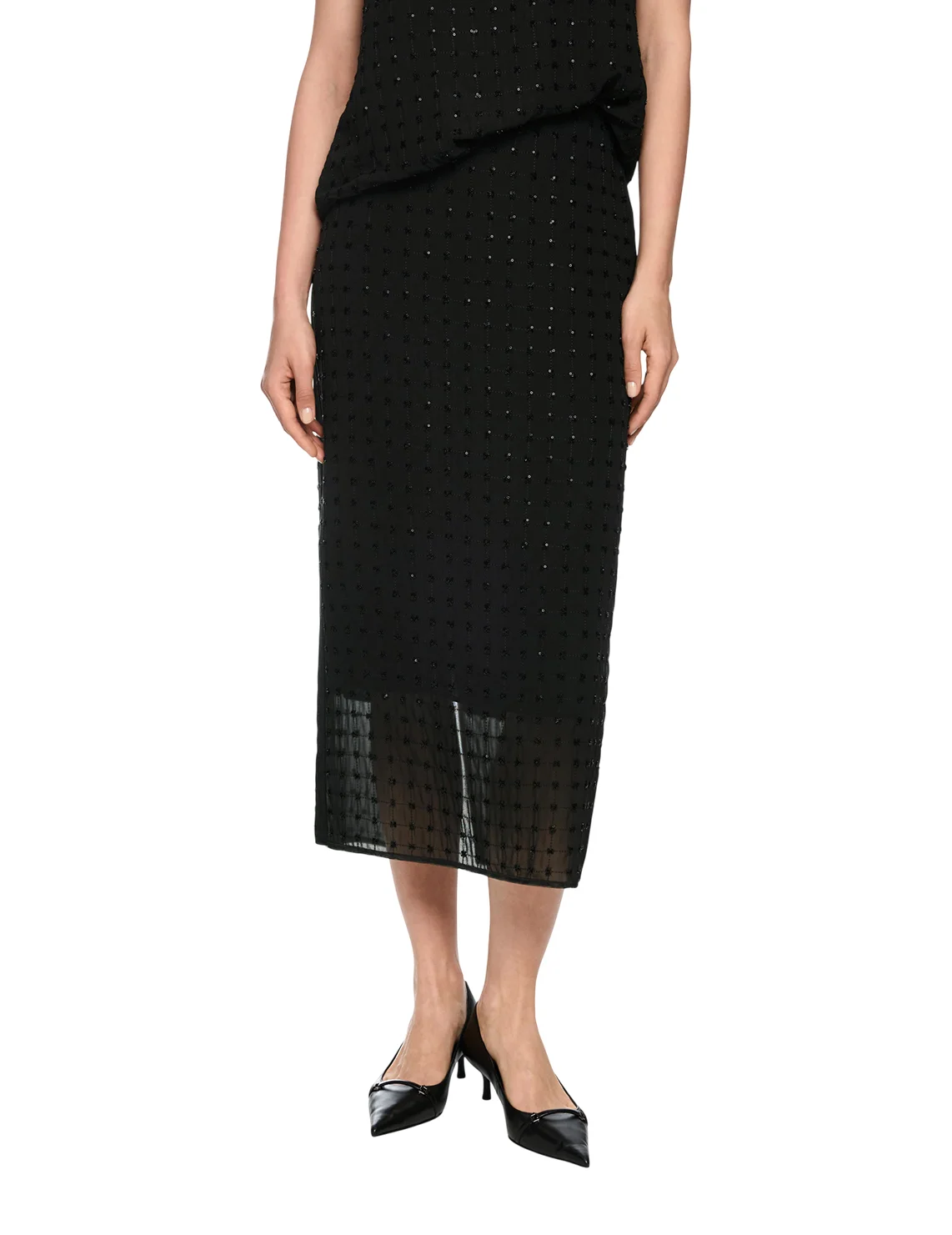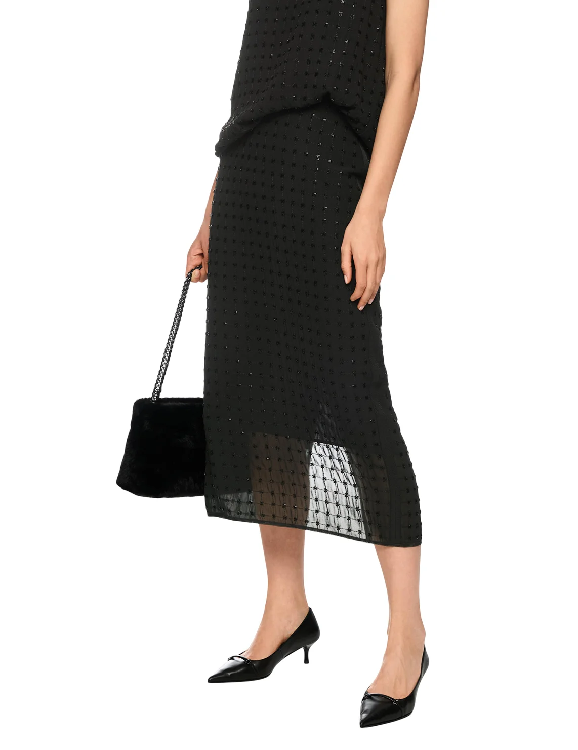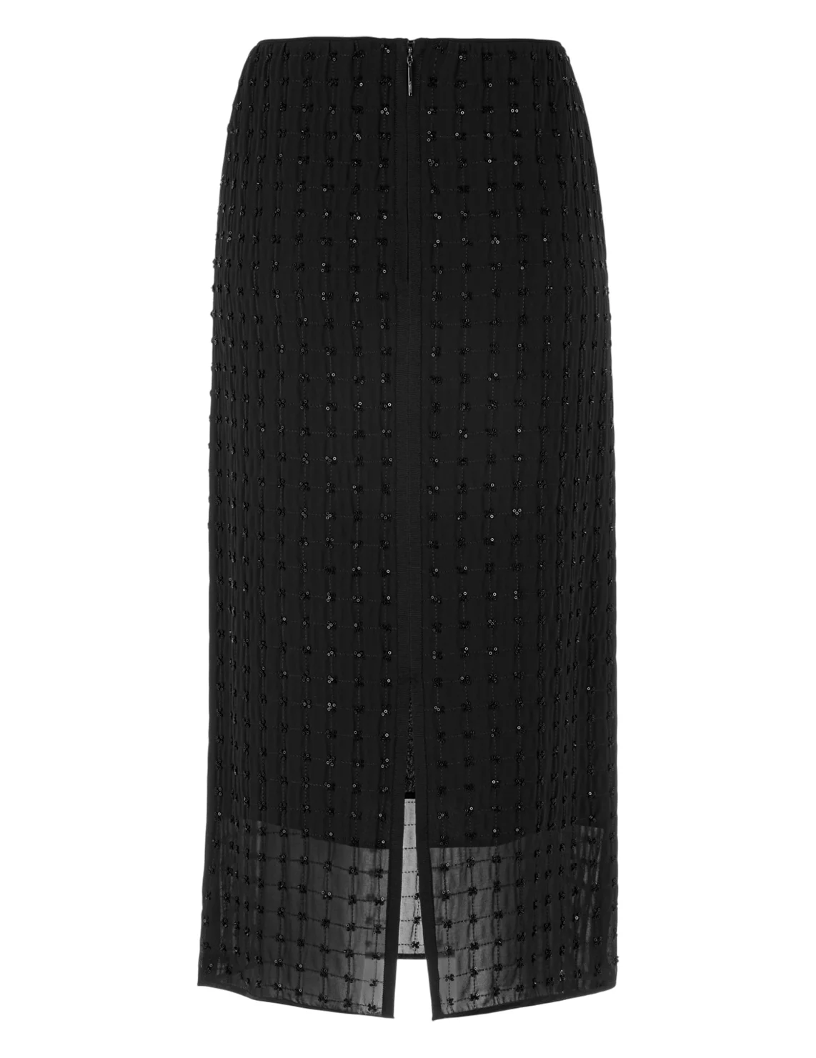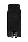 Спідниця виготовлена зі 100% поліестеру, підкладка з поліестеру. Модель довжини міді виконана в прямому крої. Має розріз і застібку на блискавці ззаду. Декорована паєтками.