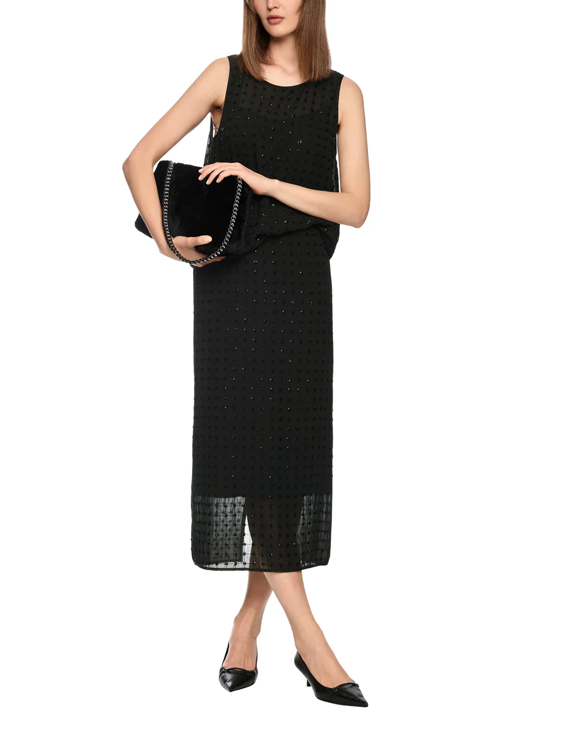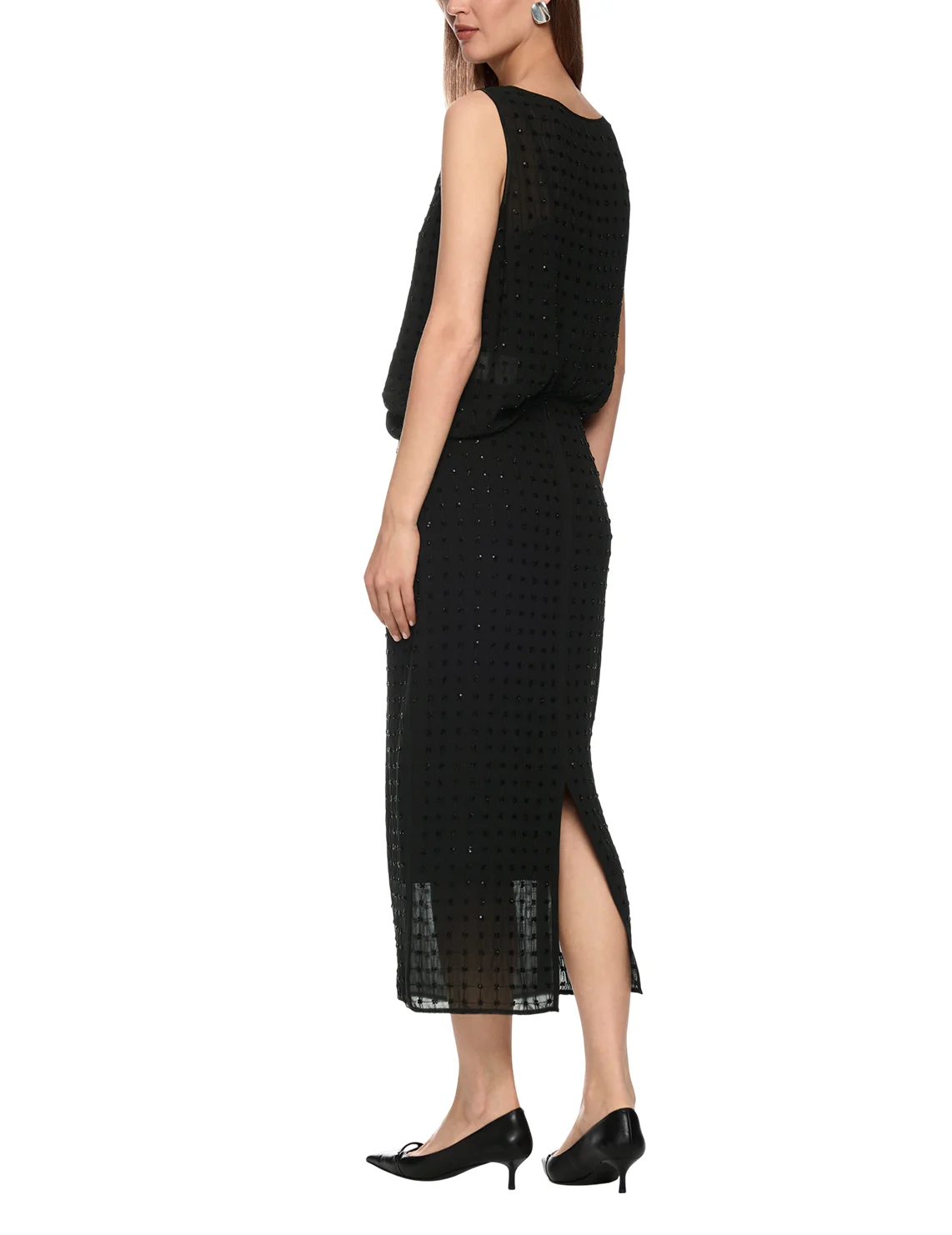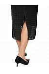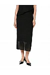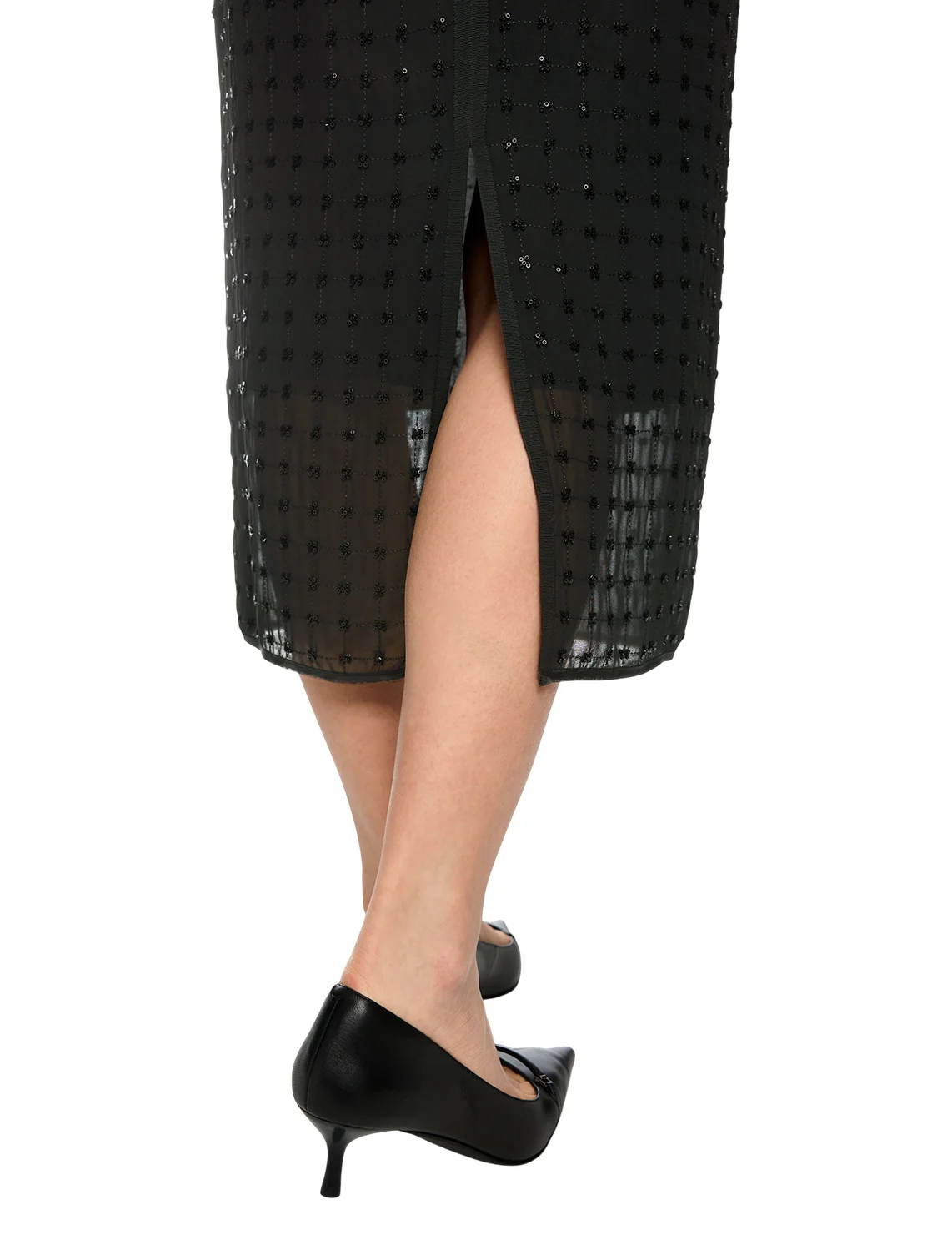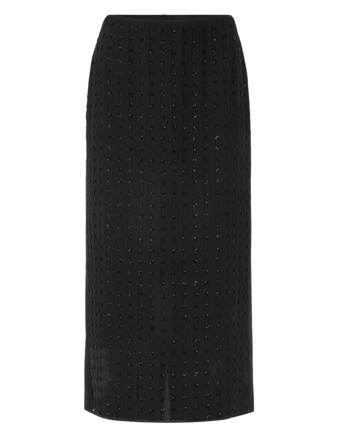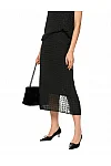 Спідниця виготовлена зі 100% поліестеру, підкладка з поліестеру. Модель довжини міді виконана в прямому крої. Має розріз і застібку на блискавці ззаду. Декорована паєтками.