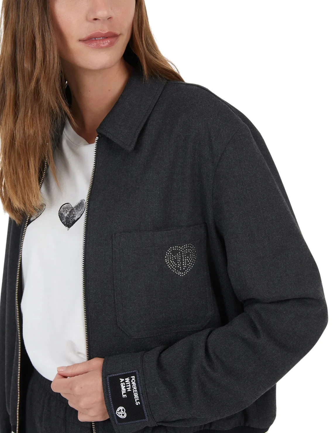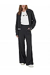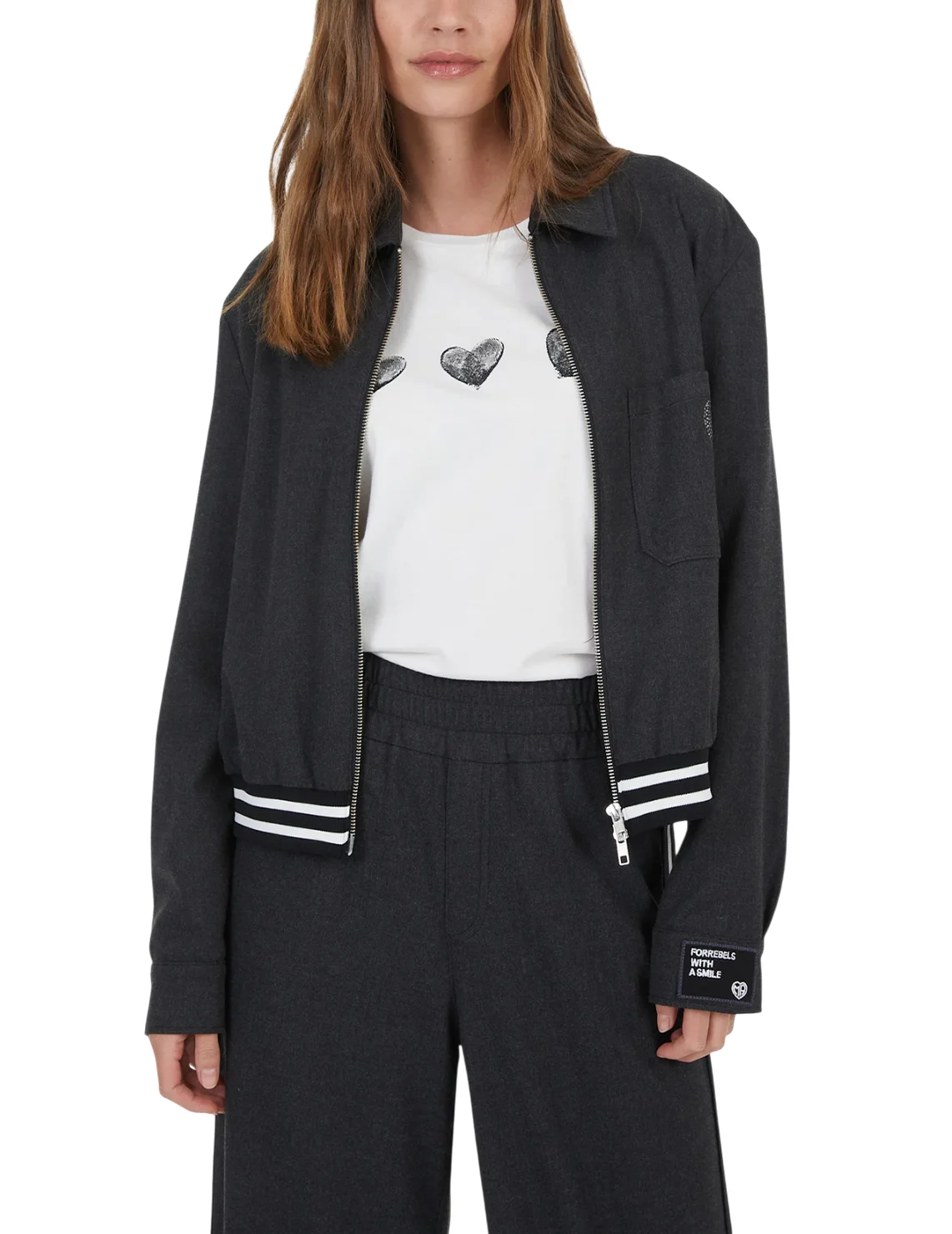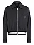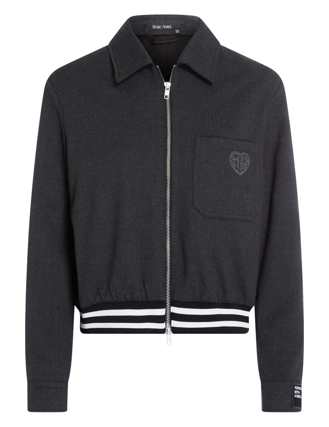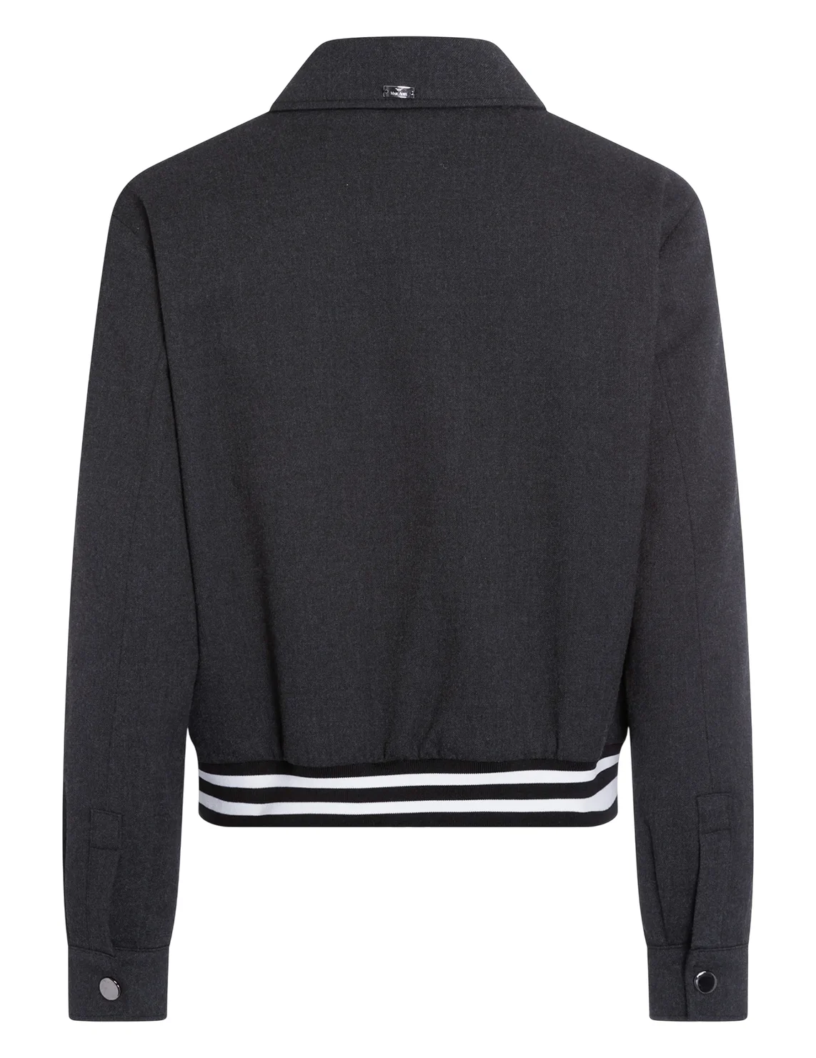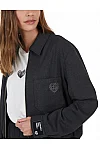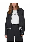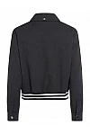 Жакет виготовлений з поліестеру, віскози та еластану. Модель прямого крою. Має відкладний комір, довгі рукави з манжетами, накладну кишеню та двосторонню застібку на блискавці. Декорований принтом у смужку, нашивкою на манжеті та стразами на кишені.