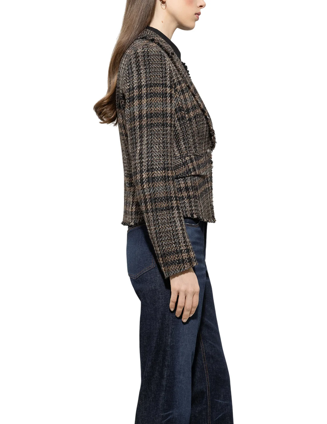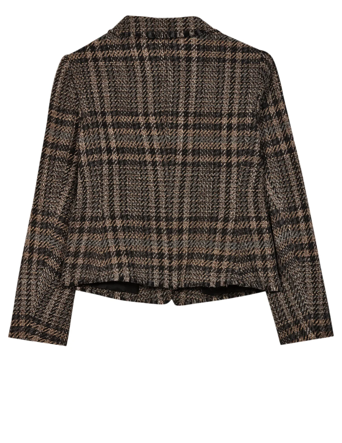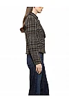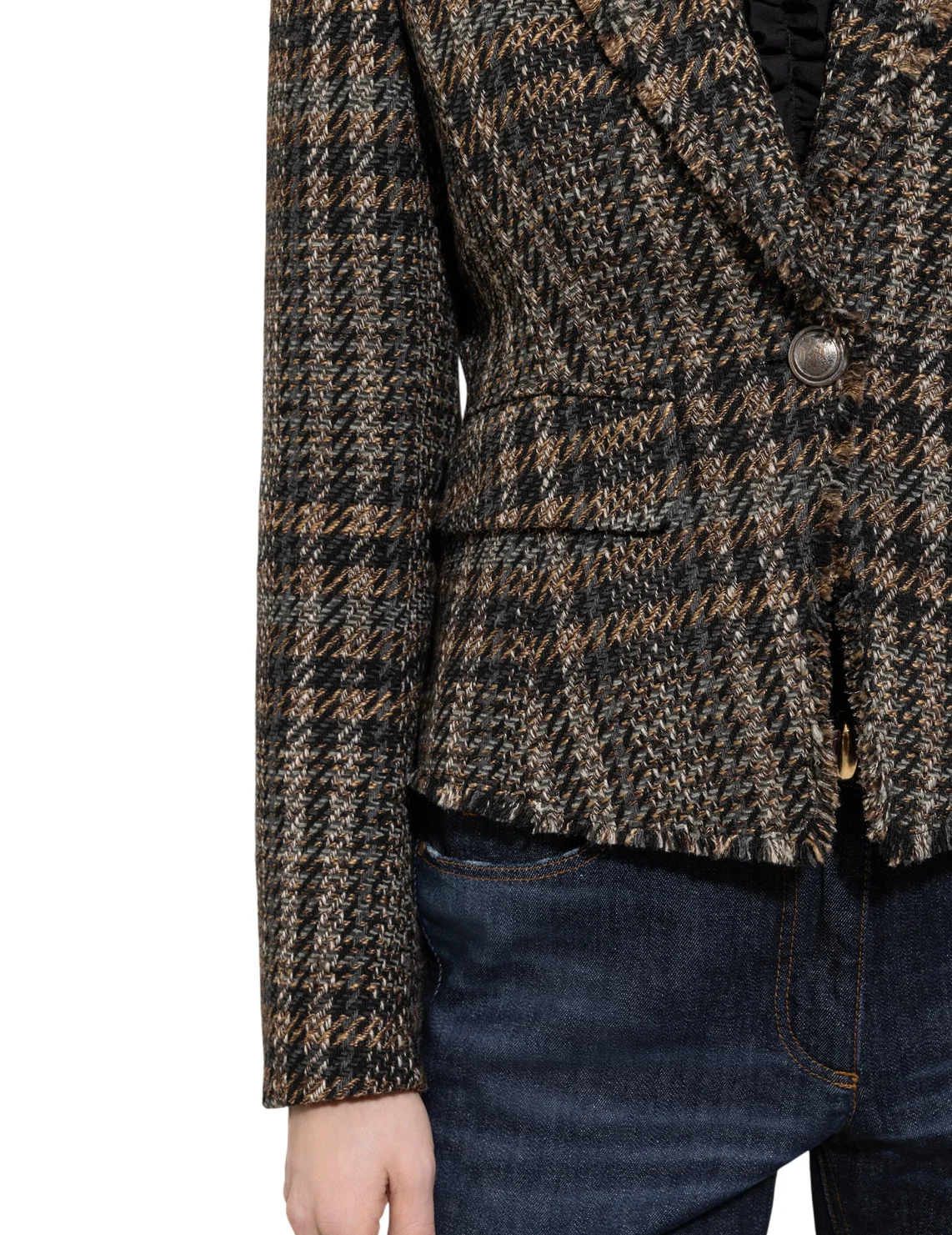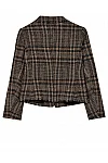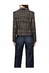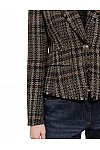 Жакет виготовлений із вовни, поліестеру, поліакрилу та поліаміду. Модель прямого крою. Має відкладний комір з лацканами, декоративні клапани, застібку на ґудзиках та довгі рукави. Декорований принтом у клітинку та бахромою по краях.