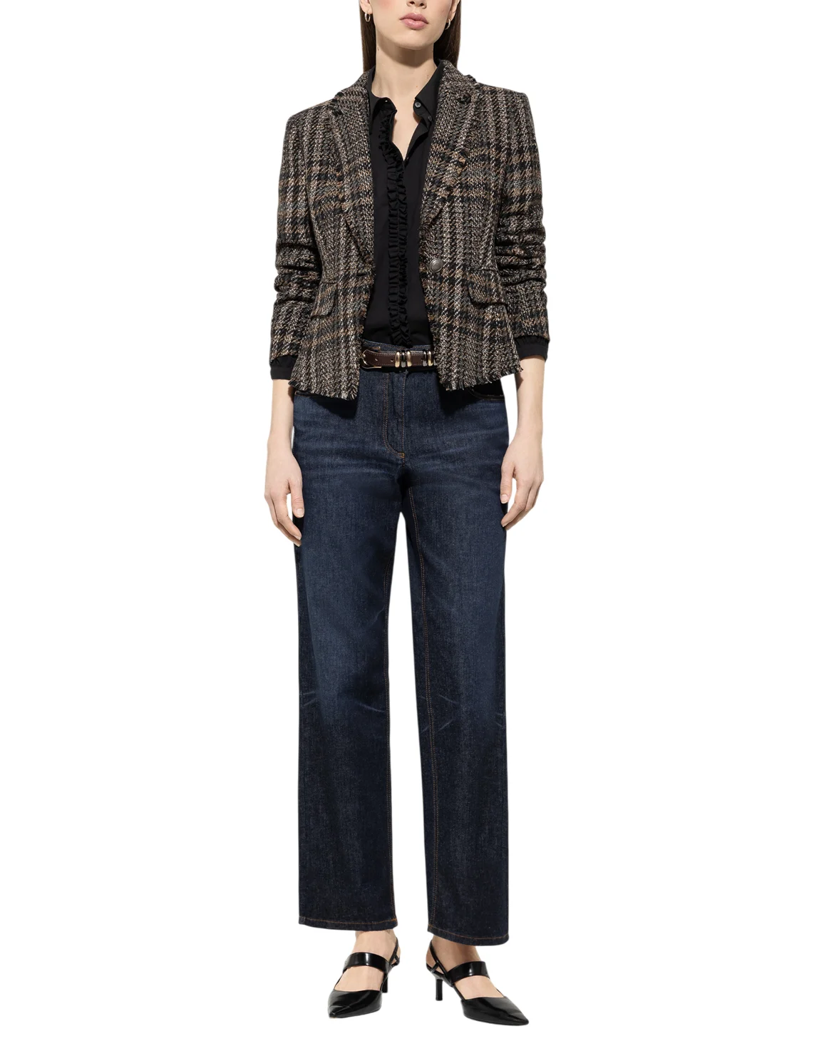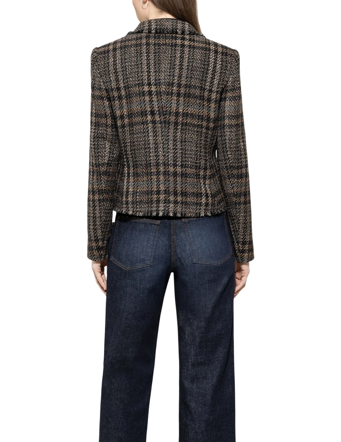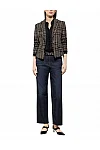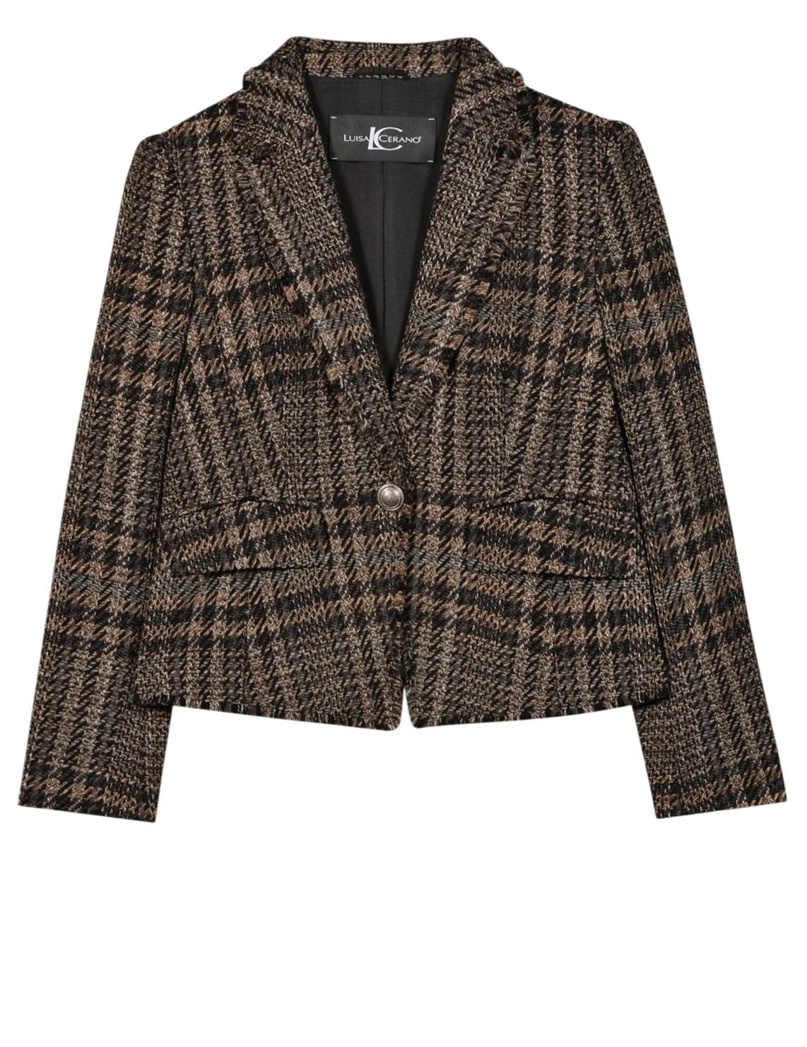 Жакет виготовлений із вовни, поліестеру, поліакрилу та поліаміду. Модель прямого крою. Має відкладний комір з лацканами, декоративні клапани, застібку на ґудзиках та довгі рукави. Декорований принтом у клітинку та бахромою по краях.