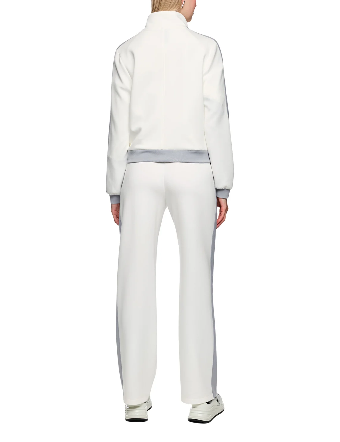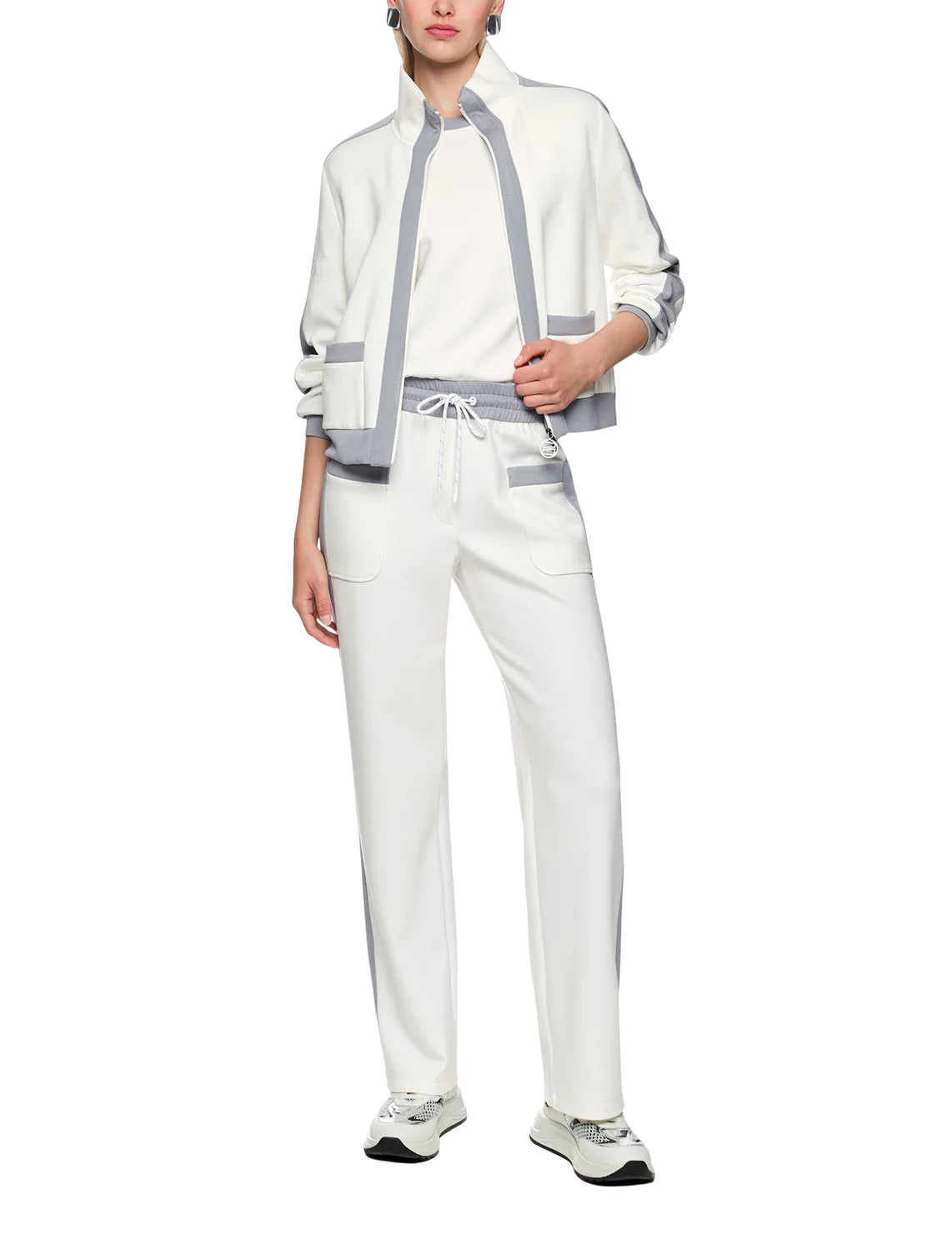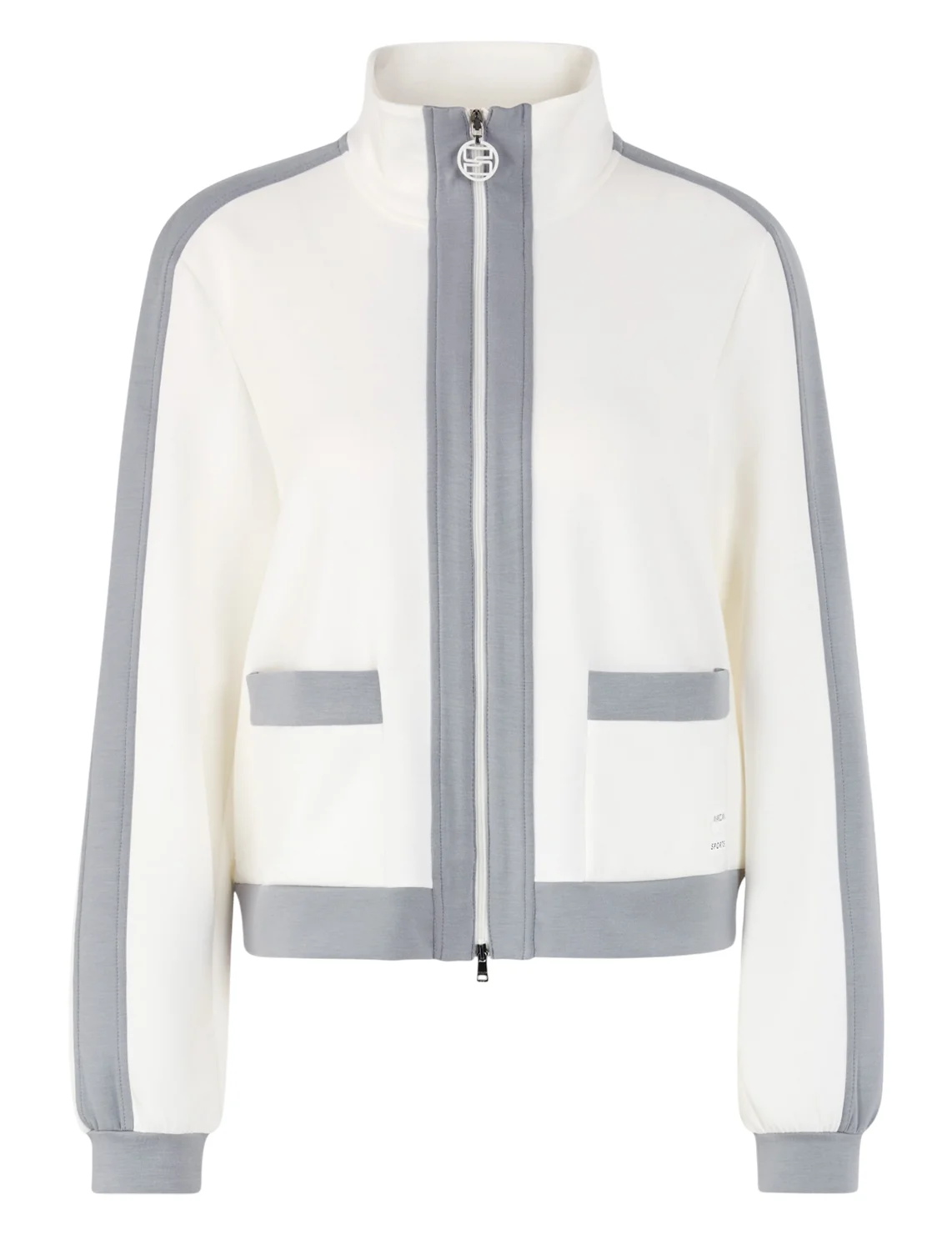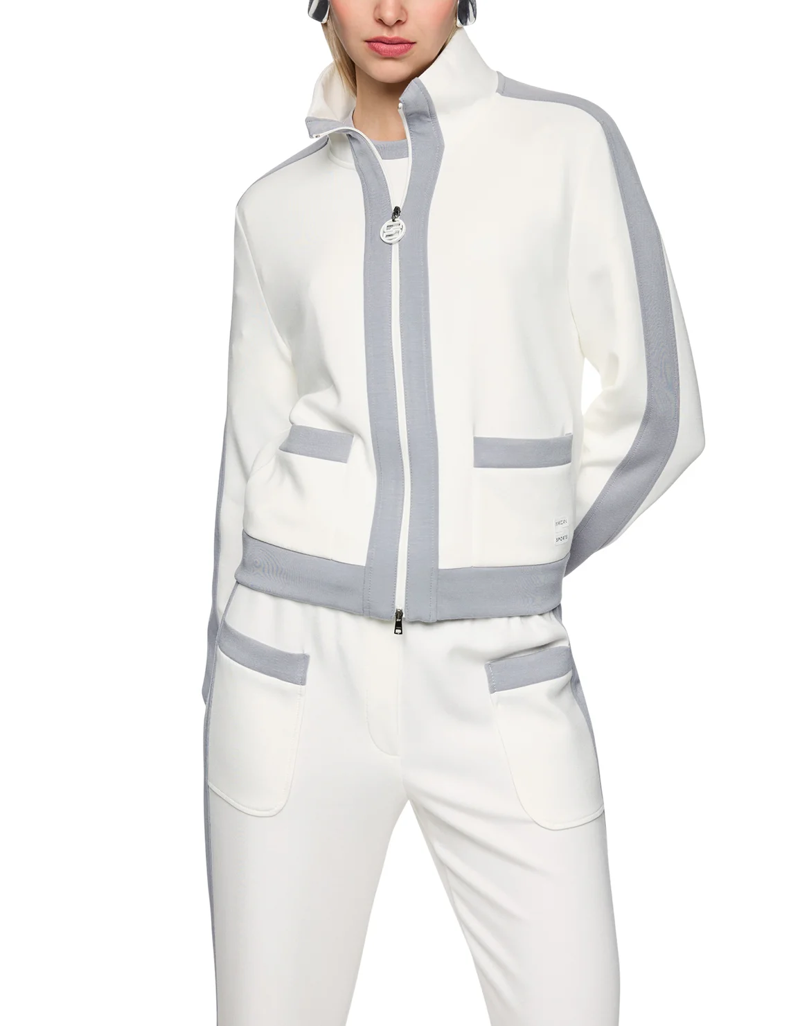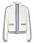 Жакет виготовлений з поліаміду, віскози та еластану. Модель виконана в прямому крої. Має комір-стійку, двосторонню застібку на блискавці, довгі рукави з манжетами та накладні кишені. Декорований логотипом бренду та принтом у смужку.