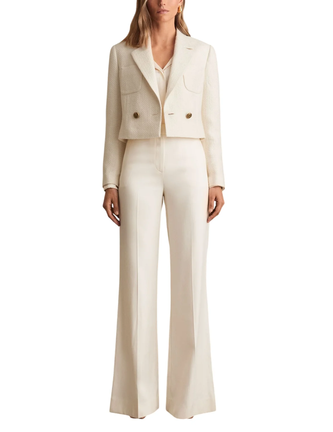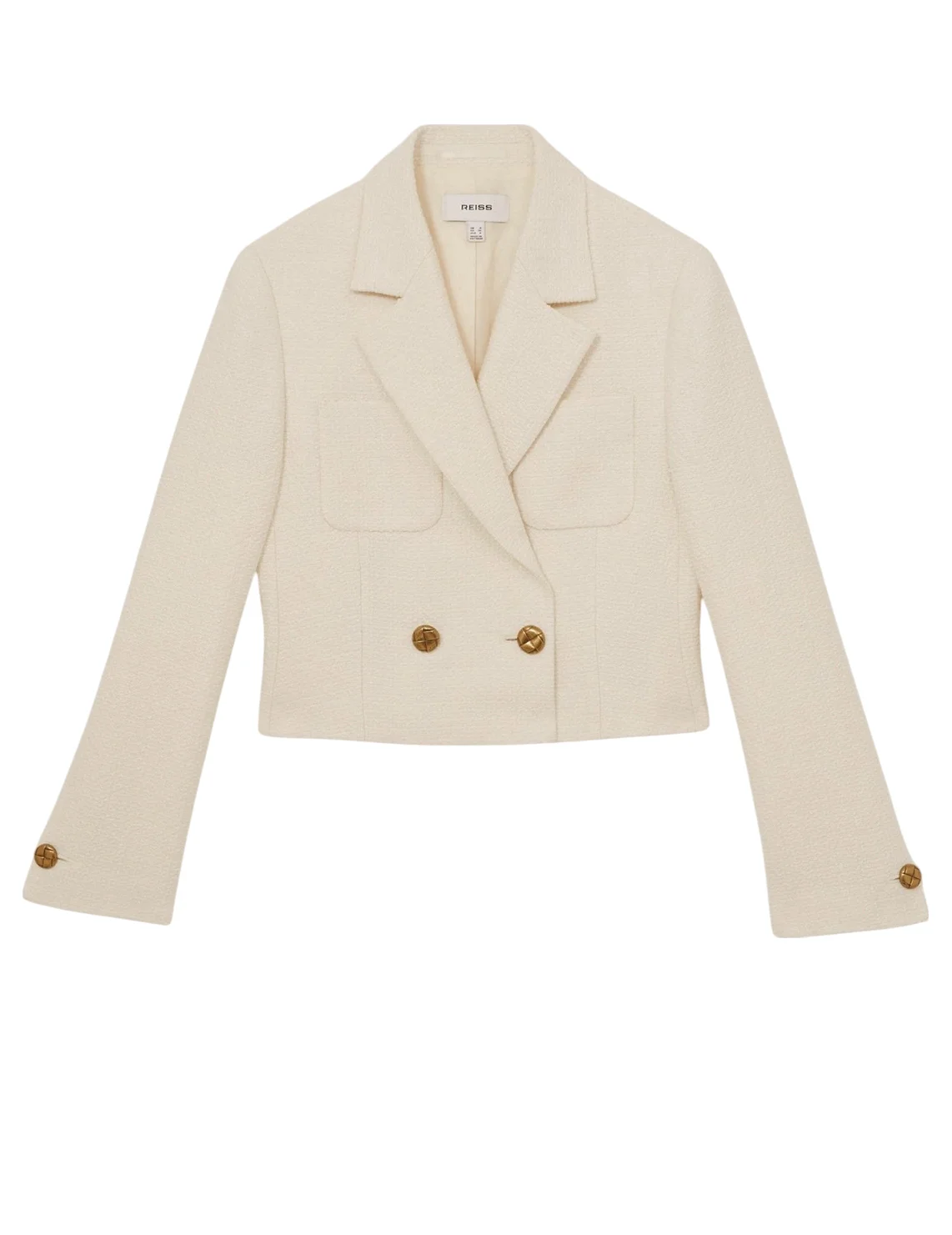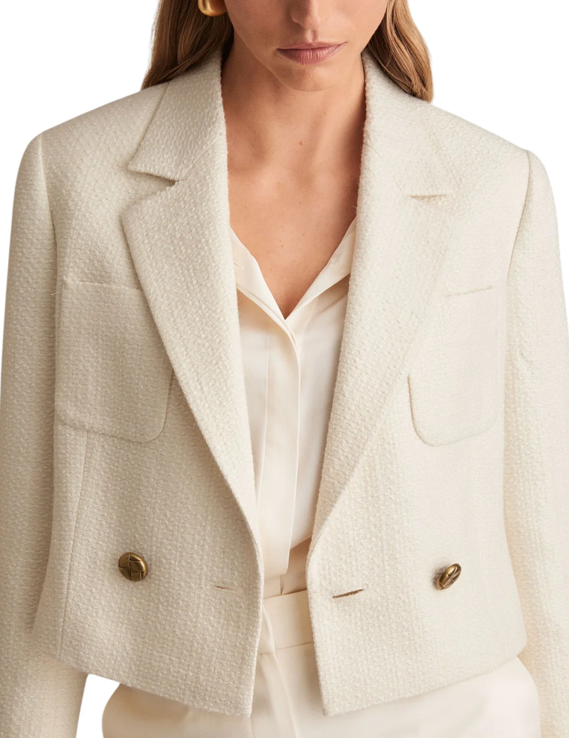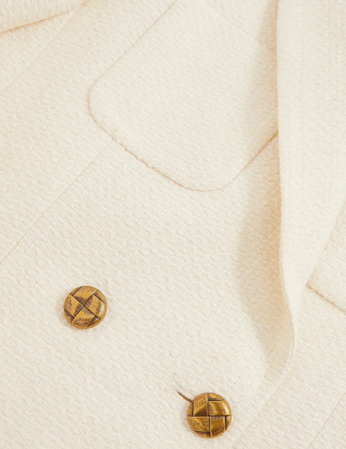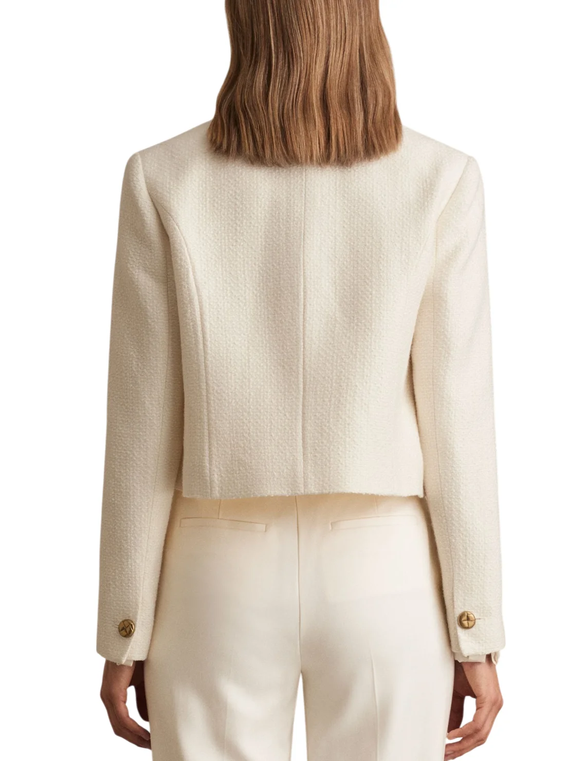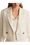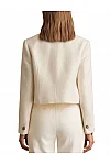 Жакет виготовлений з поліестеру, вовни та бавовни. Модель прямого крою. Має відкладний комір з лацканами, нагрудні накладні кишені, застібку на ґудзики та довгі рукави. Має відкладний комір з лацканами, нагрудні накладні кишені, застібку на ґудзиках та довгі рукави.