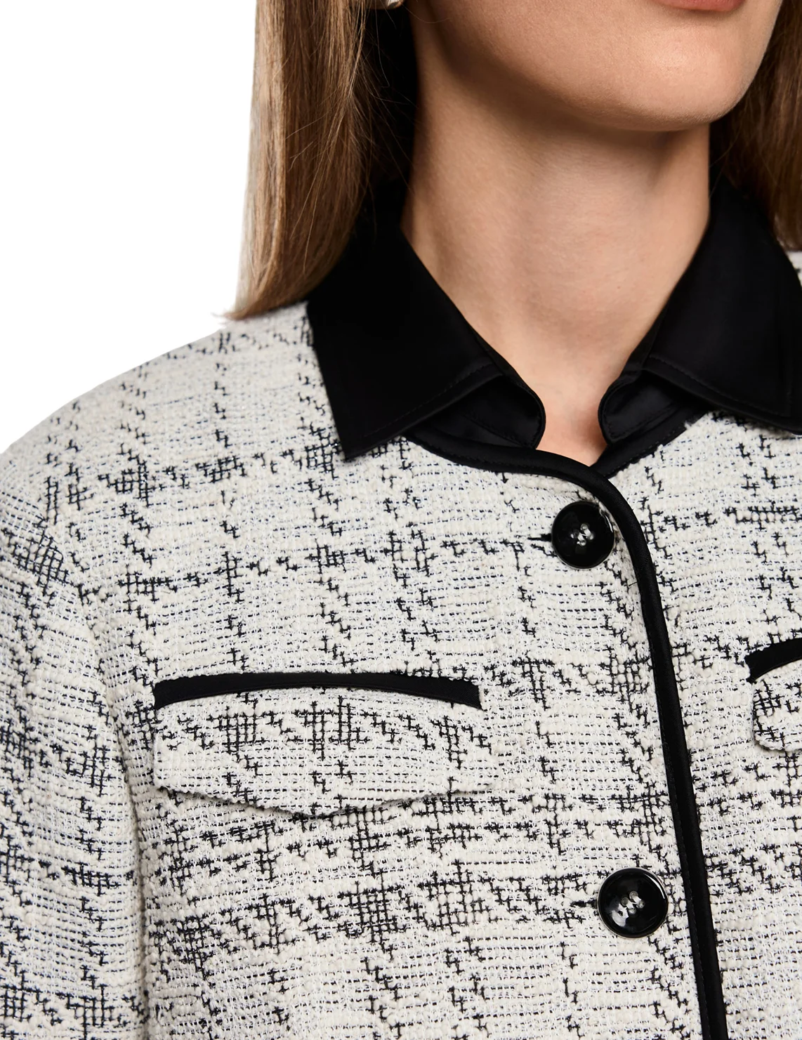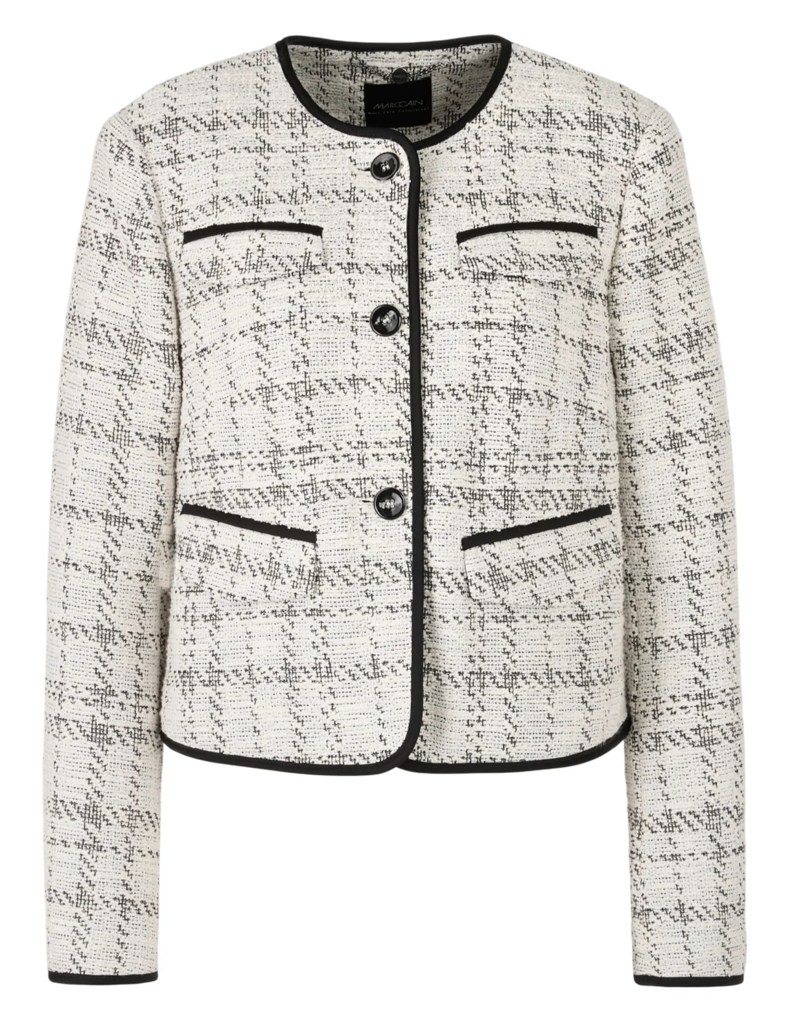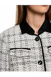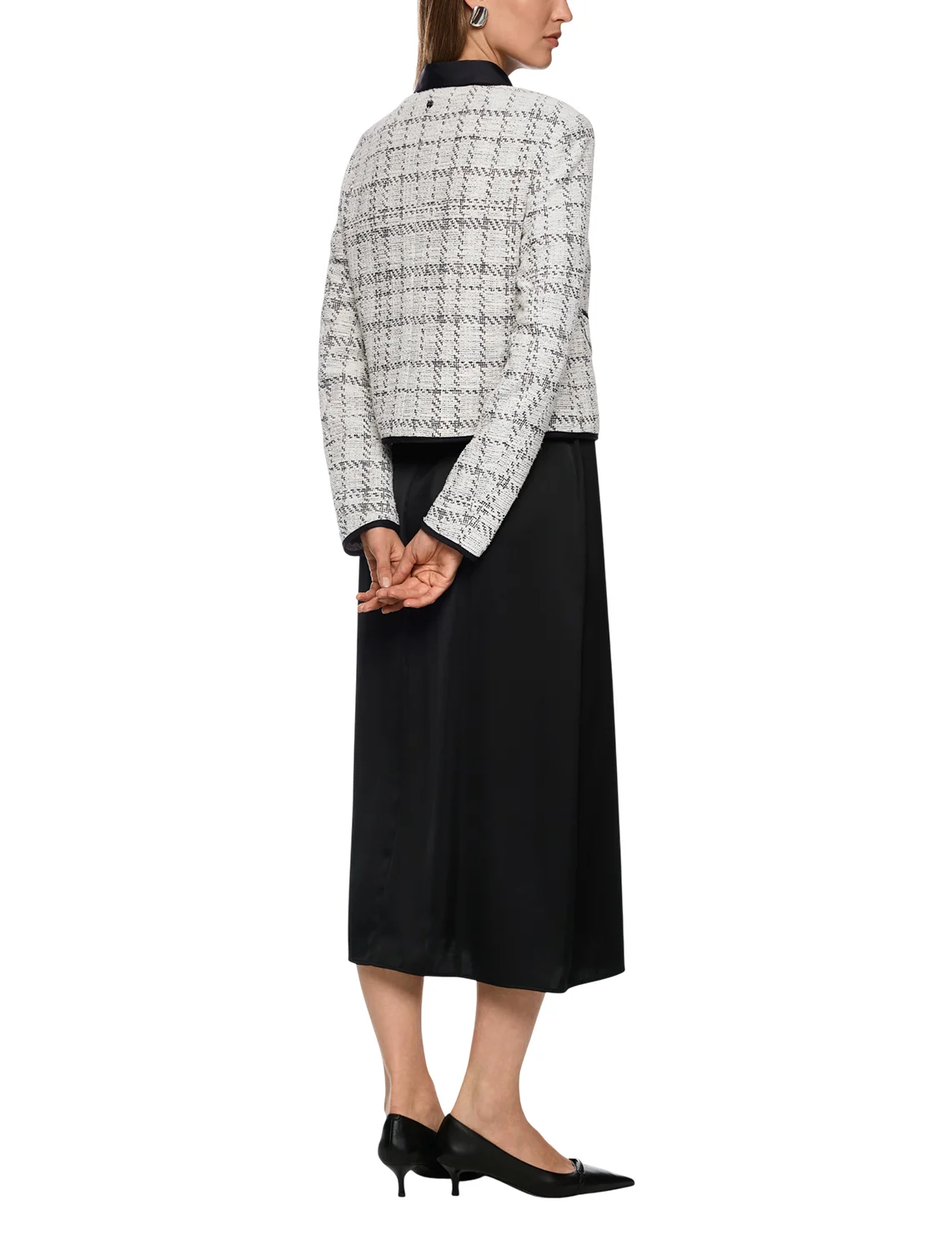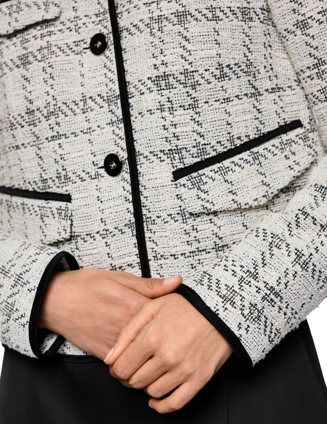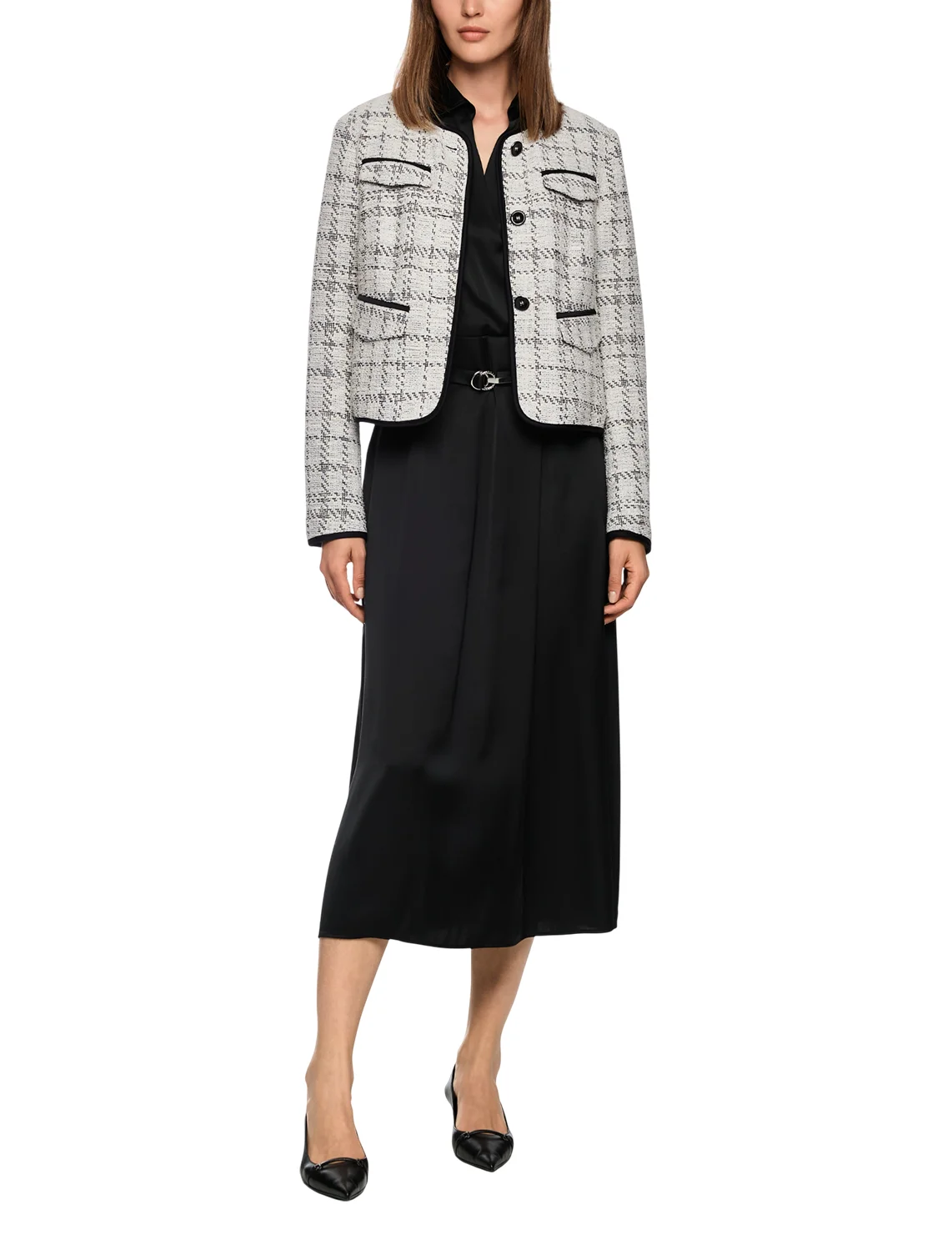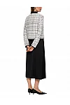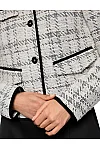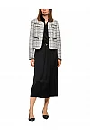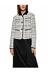 Жакет виготовлений з поліестеру, бавовни та еластану. Модель виконана в прямому крої. Має круглий виріз горловини, застібку на ґудзиках, довгі рукави та декоративні клапани. Декорований принтом у клітинку.