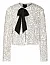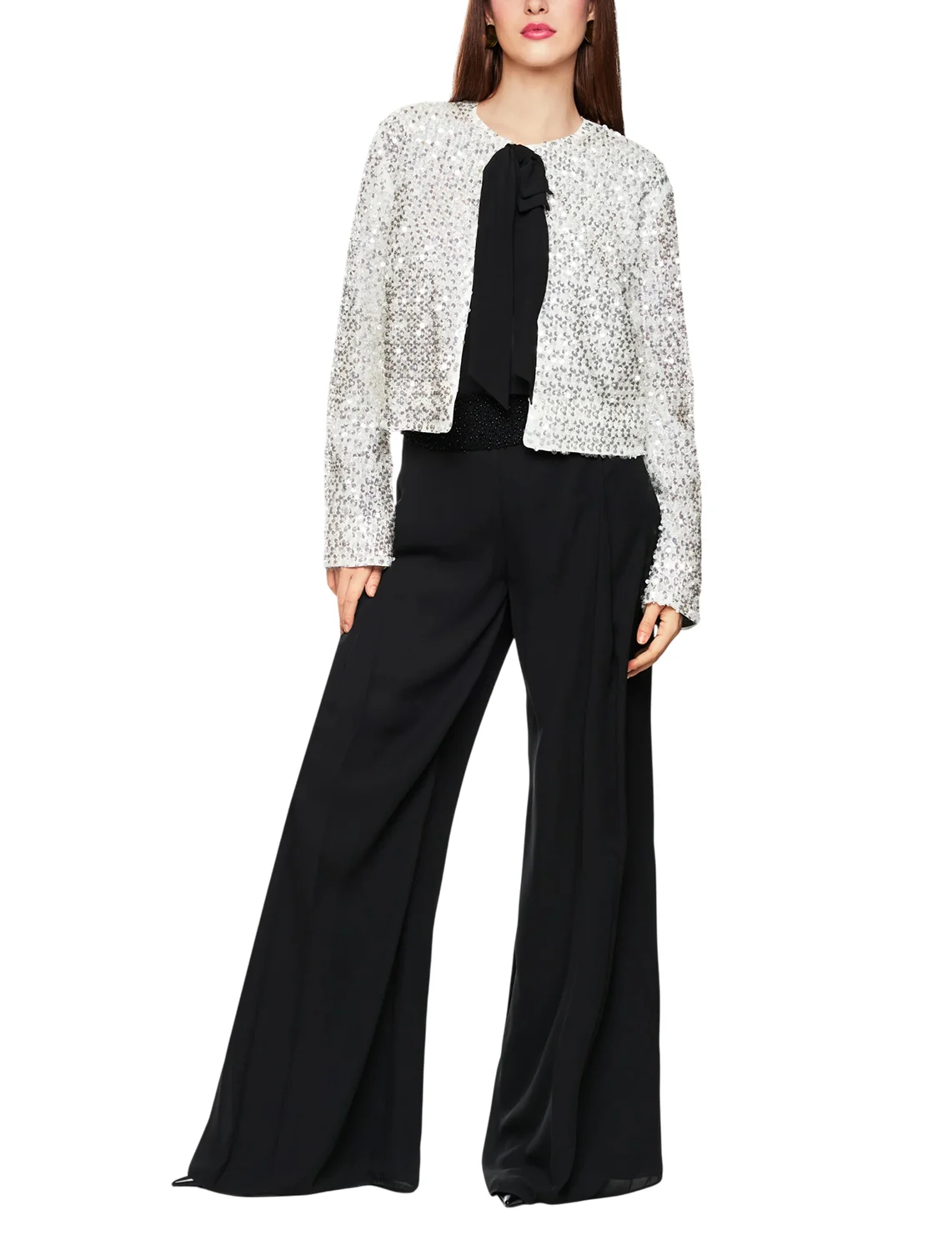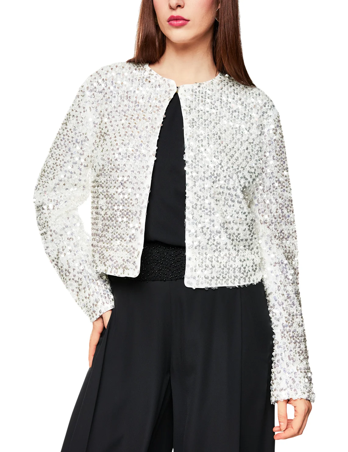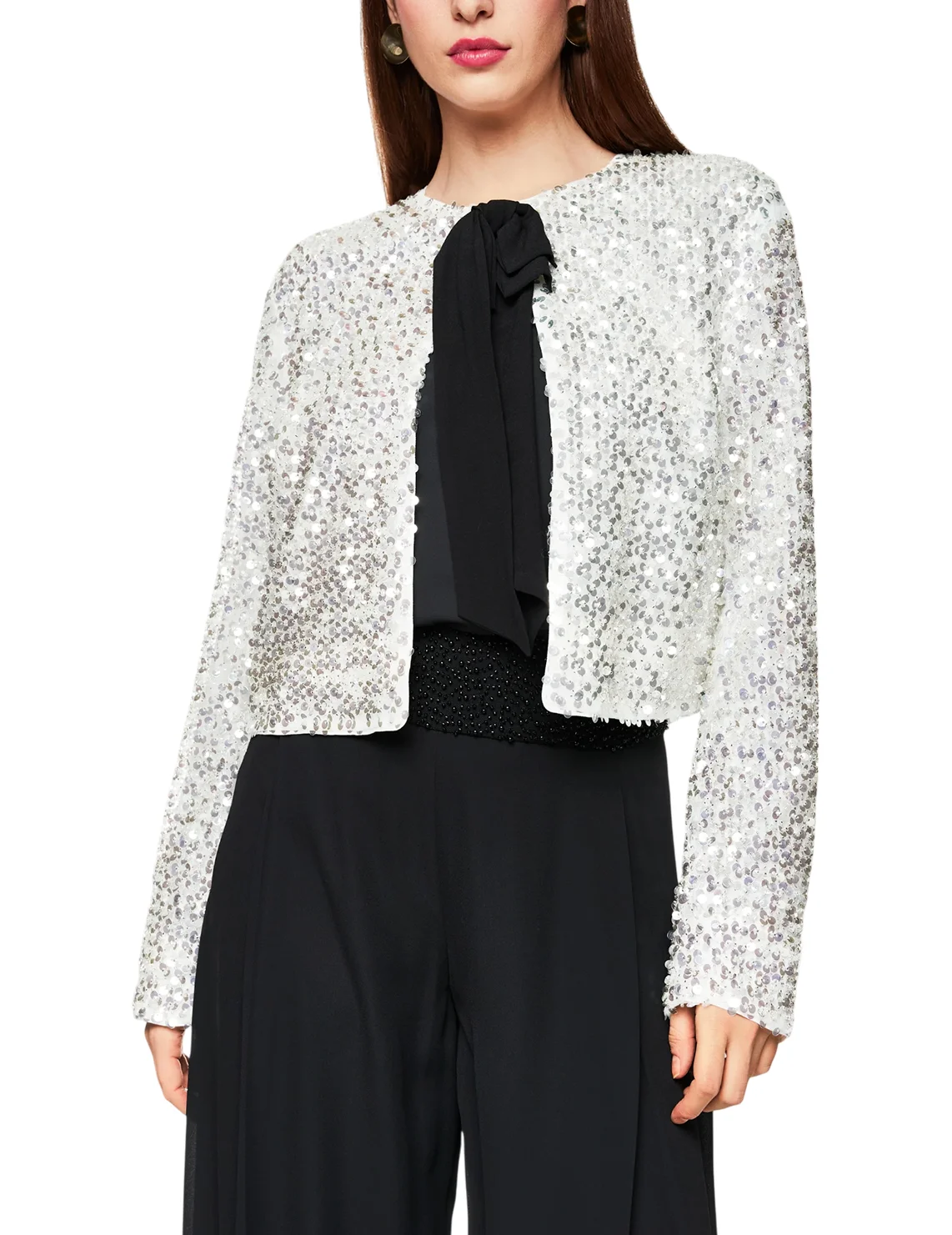 Жакет виготовлений з поліестеру високої якості. Модель виконана в прямому крої. Має круглий виріз горловини, застібку на гачок і довгі рукави. Декорований блискучими паєтками та бантом.