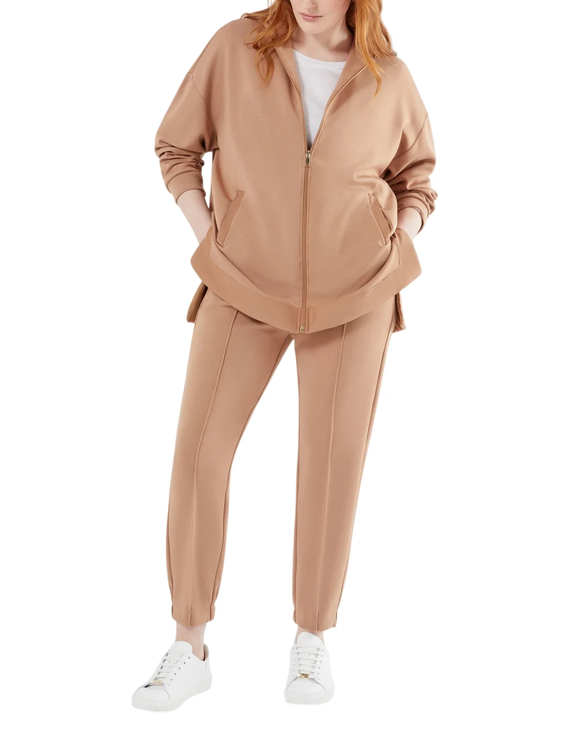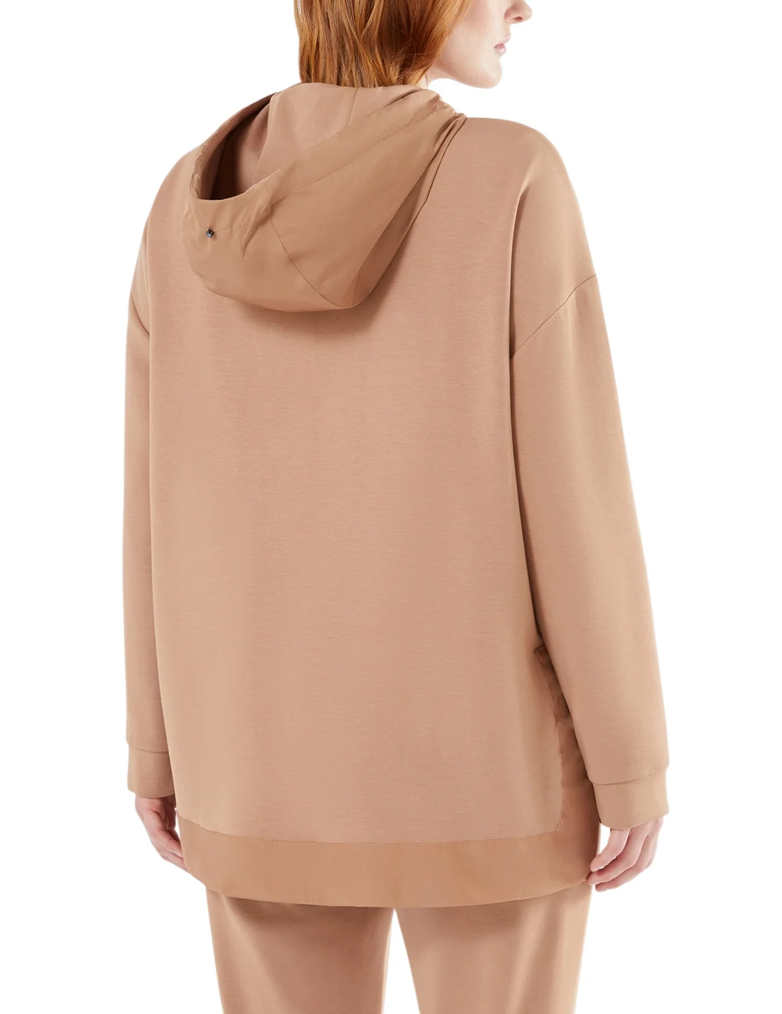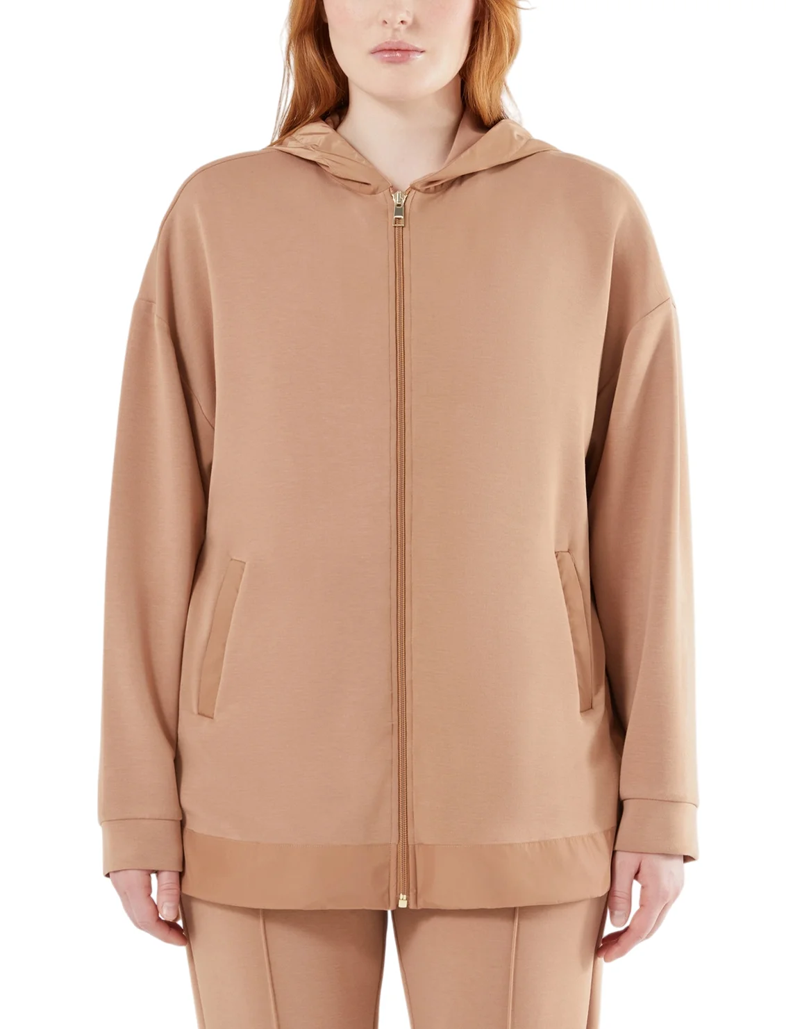 Зіп-худі виготовлено з поліаміду, віскози та еластану. Модель виконана у вільному крої. Має капюшон, застібку-блискавку, прорізні кишені, бічні розрізи та довгі рукави з манжетами.