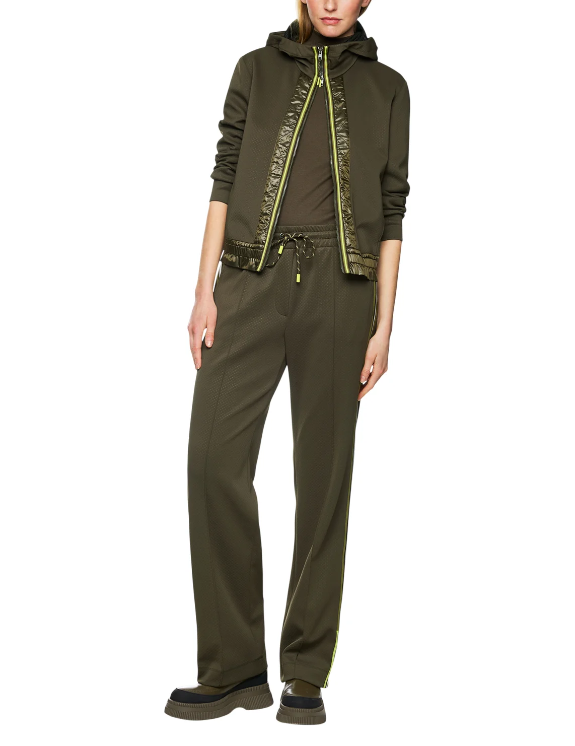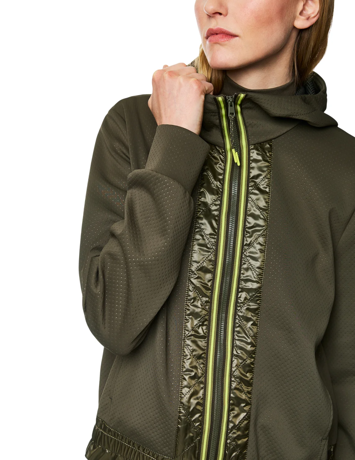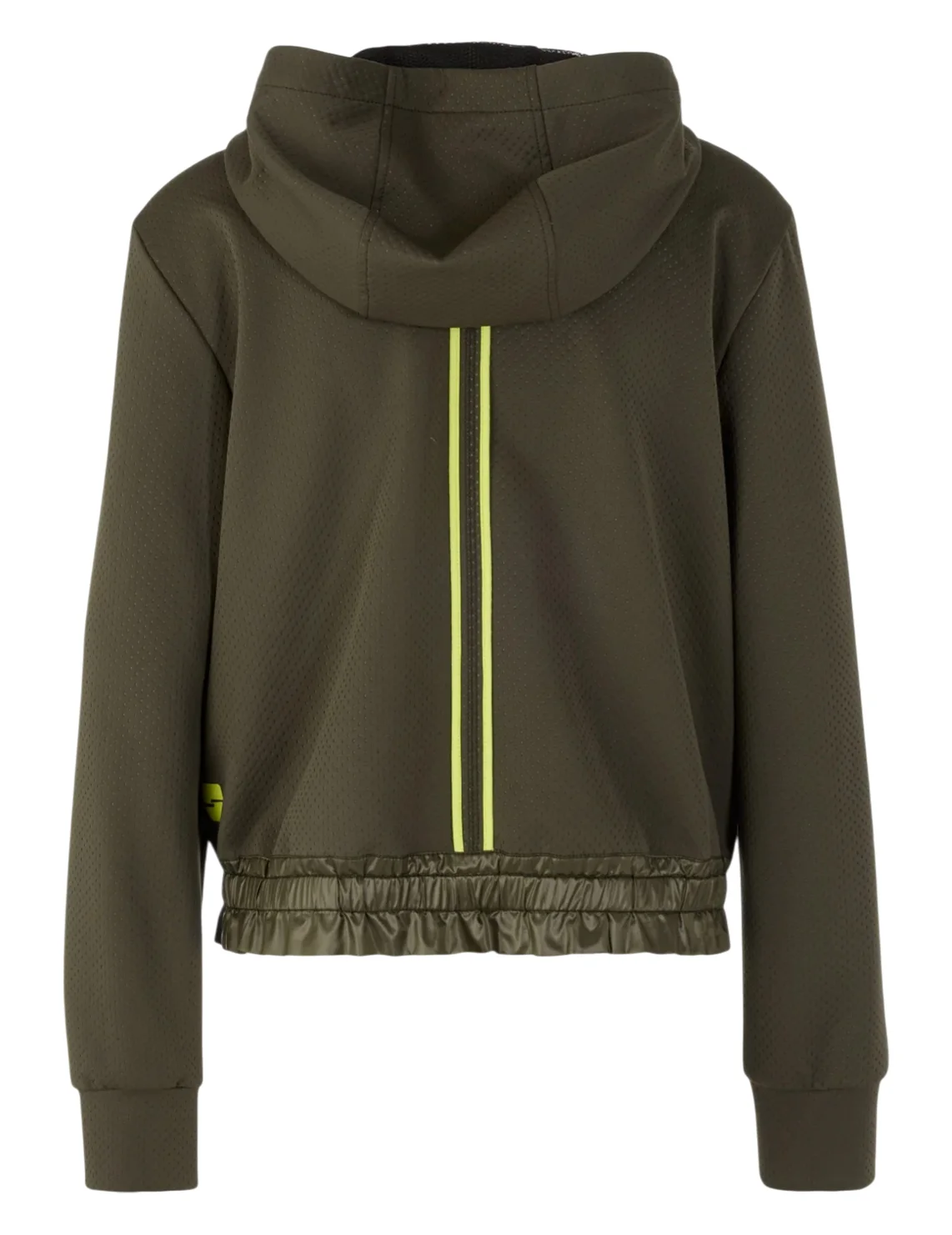 Зіп-худі виготовлено з поліестеру та еластану. Модель виконана в прямому крої. Має комір-стійку, капюшон, двосторонню застібку-блискавку, прорізні кишені та довгі рукави з манжетами. Декоровано контрастними смужками.