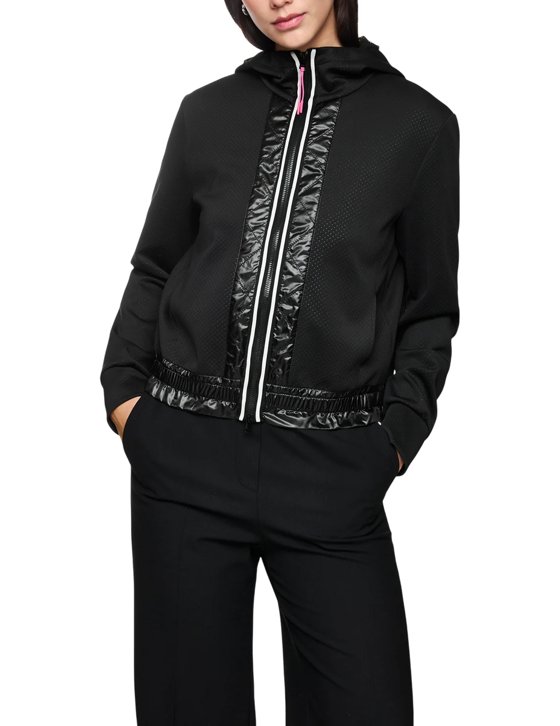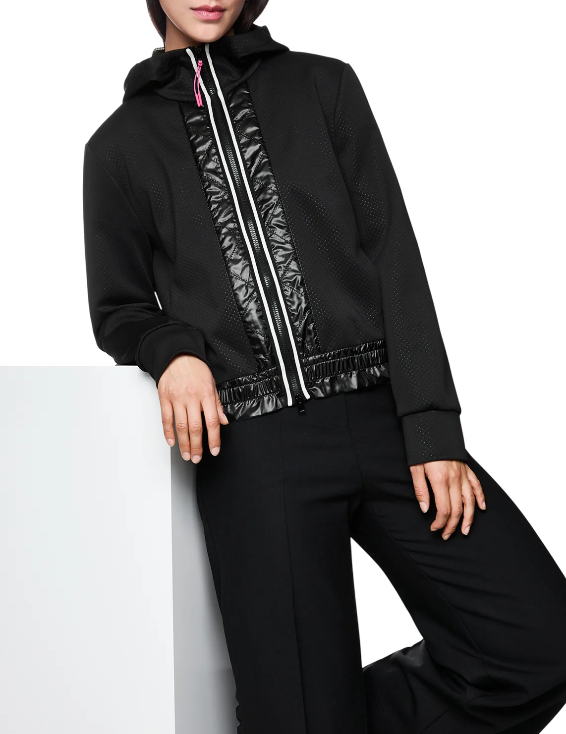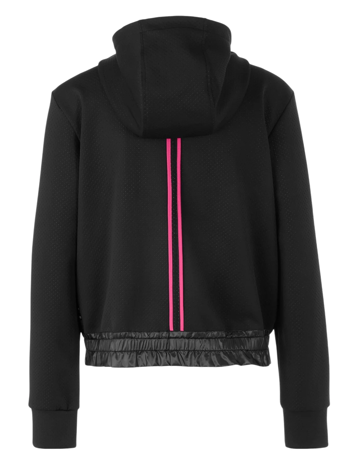 Зіп-худі виготовлено з поліестеру та еластану. Модель виконана в прямому крої. Має комір-стійку, капюшон, двосторонню застібку-блискавку, прорізні кишені та довгі рукави з манжетами. Декоровано контрастними смужками.