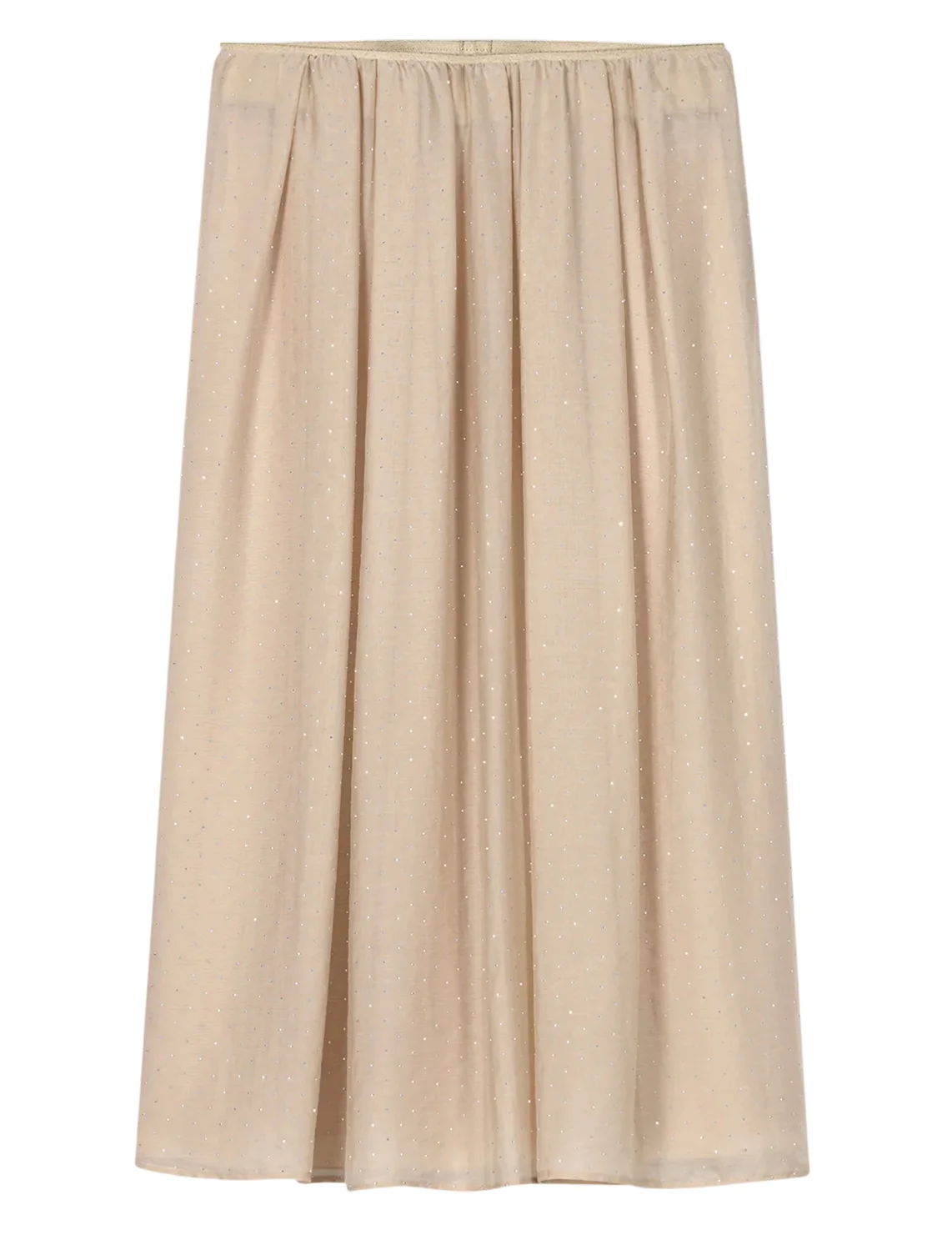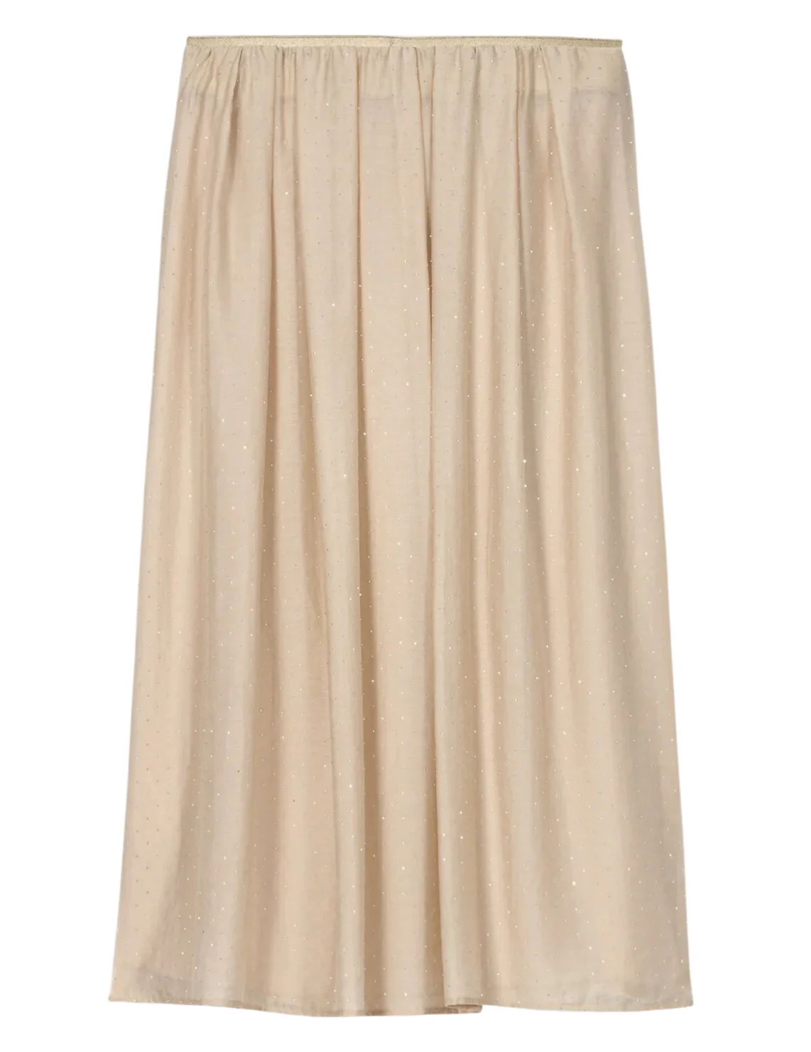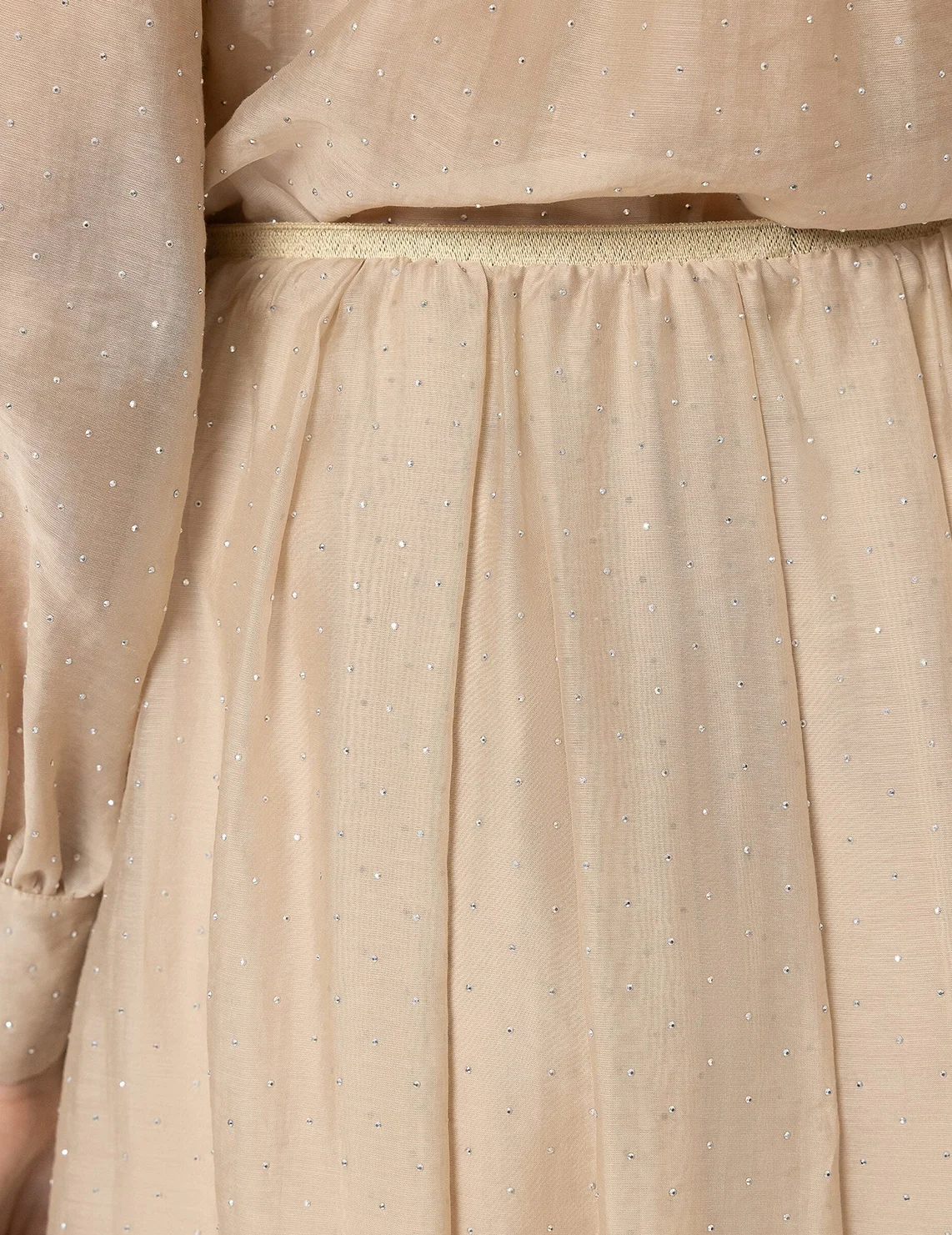 Юбка изготовлена из лиоцелла и полиамида, подкладка из вискозы. Модель длины миди выполнена в расклешенном крое. Имеет эластичный пояс и декорирована стразами.