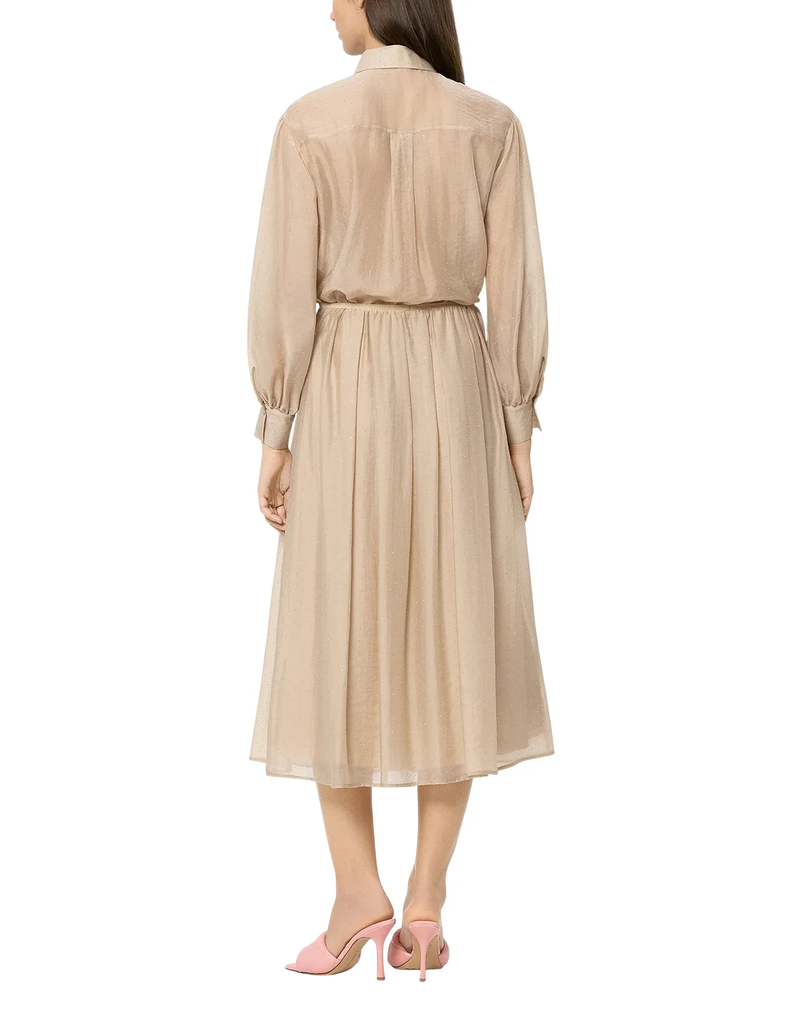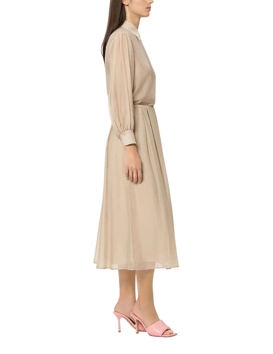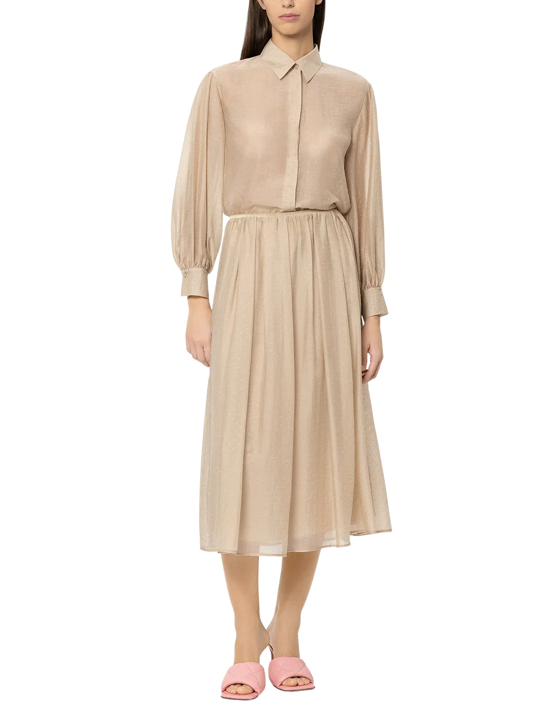 Юбка изготовлена из лиоцелла и полиамида, подкладка из вискозы. Модель длины миди выполнена в расклешенном крое. Имеет эластичный пояс и декорирована стразами.