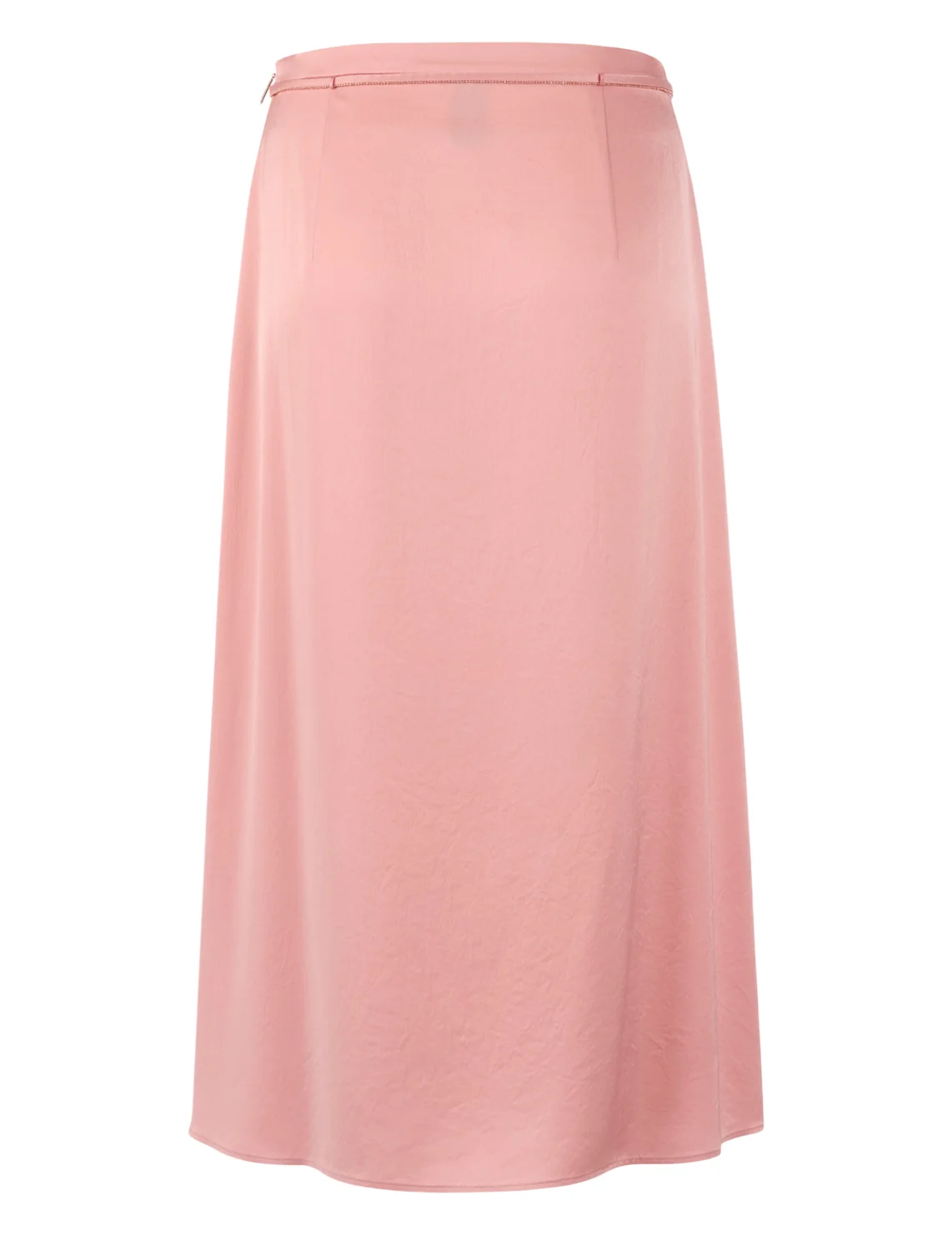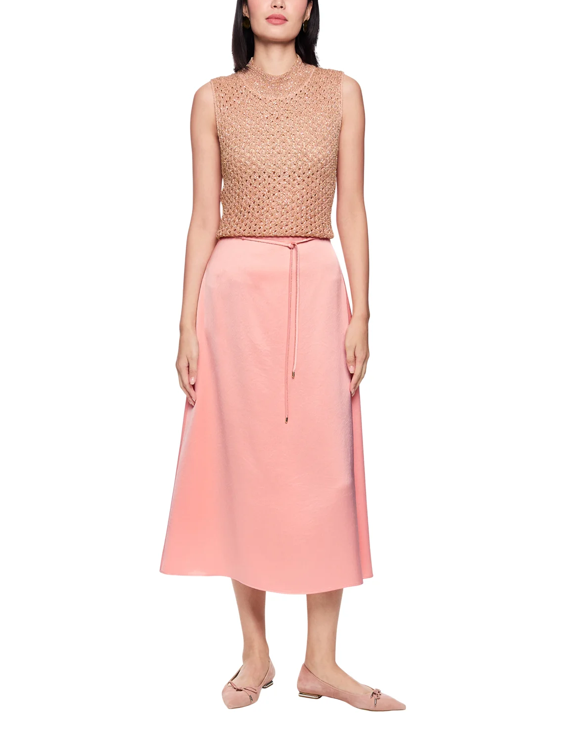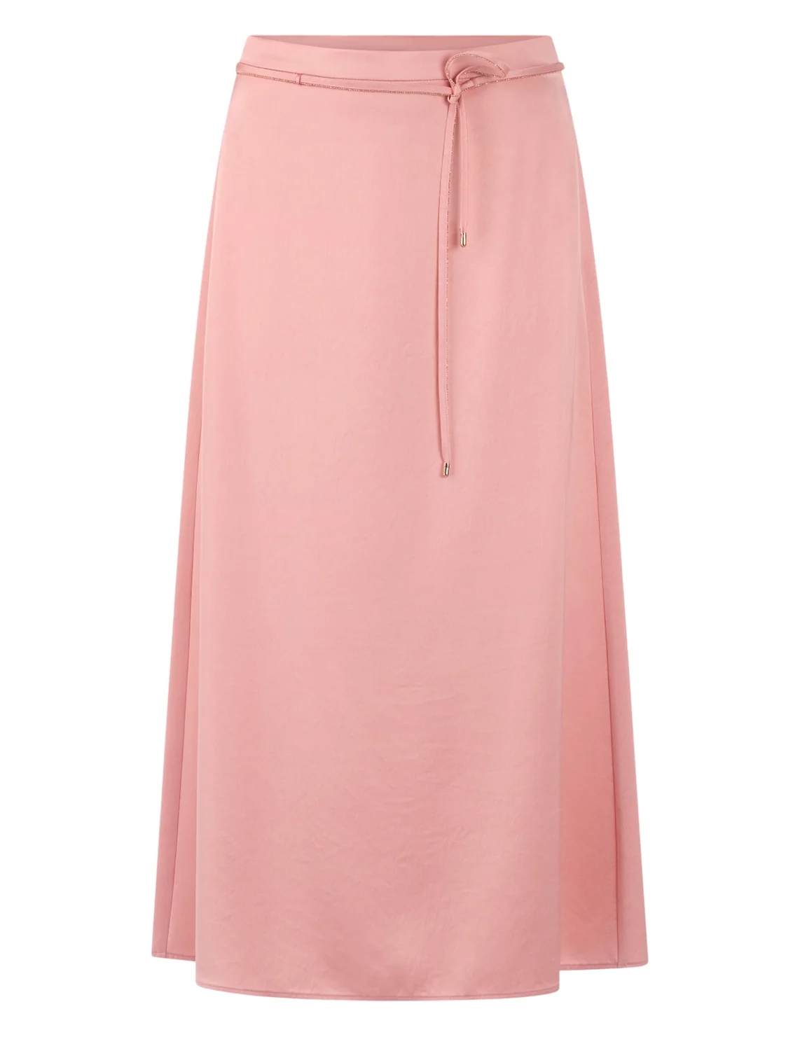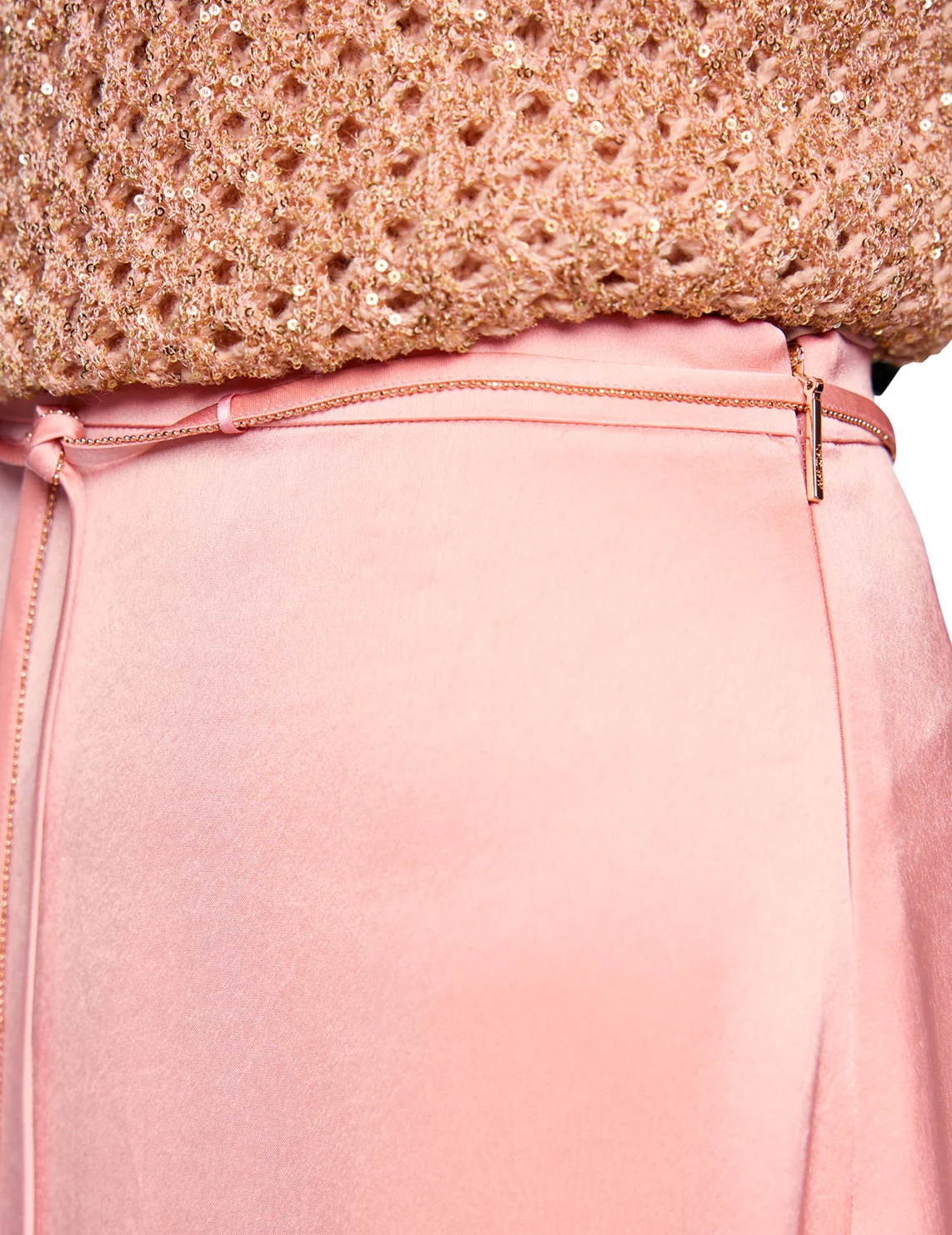 Юбка изготовлена из ацетата и полиэстера. Модель длины миди выполнена в прямом крое. Имеет пояс в виде шнурка и застежку на молнии сбоку. Пояс украшен цепочкой.
