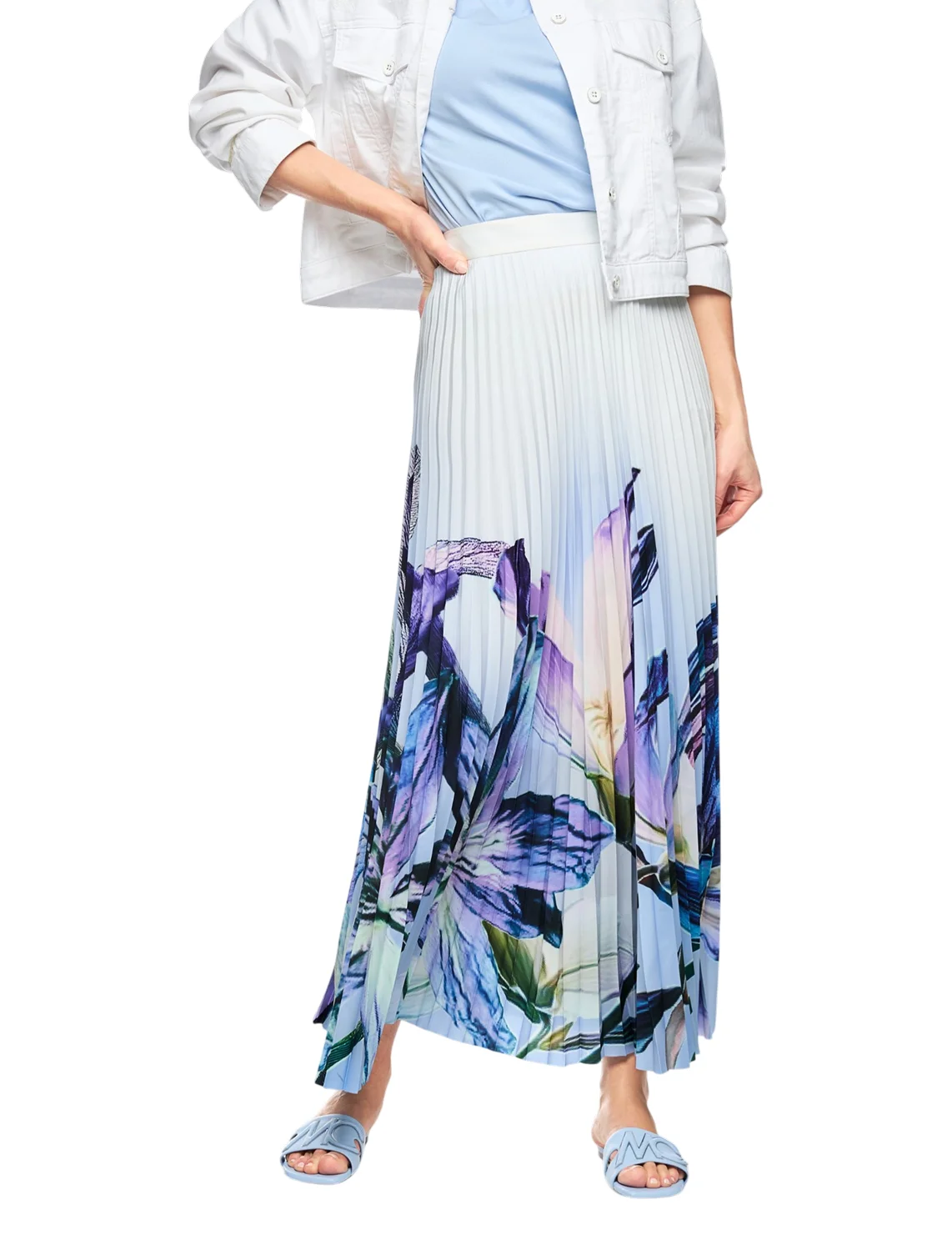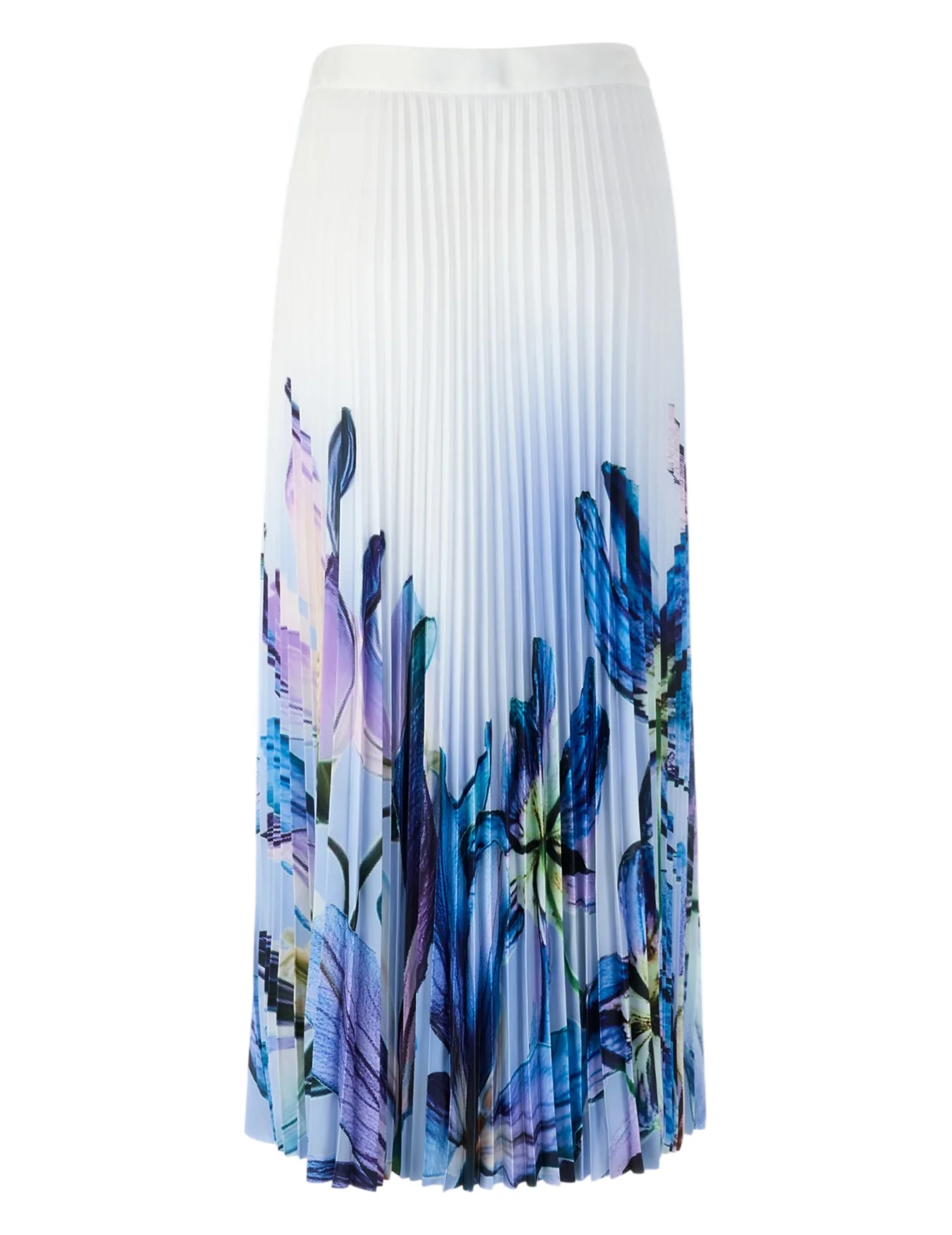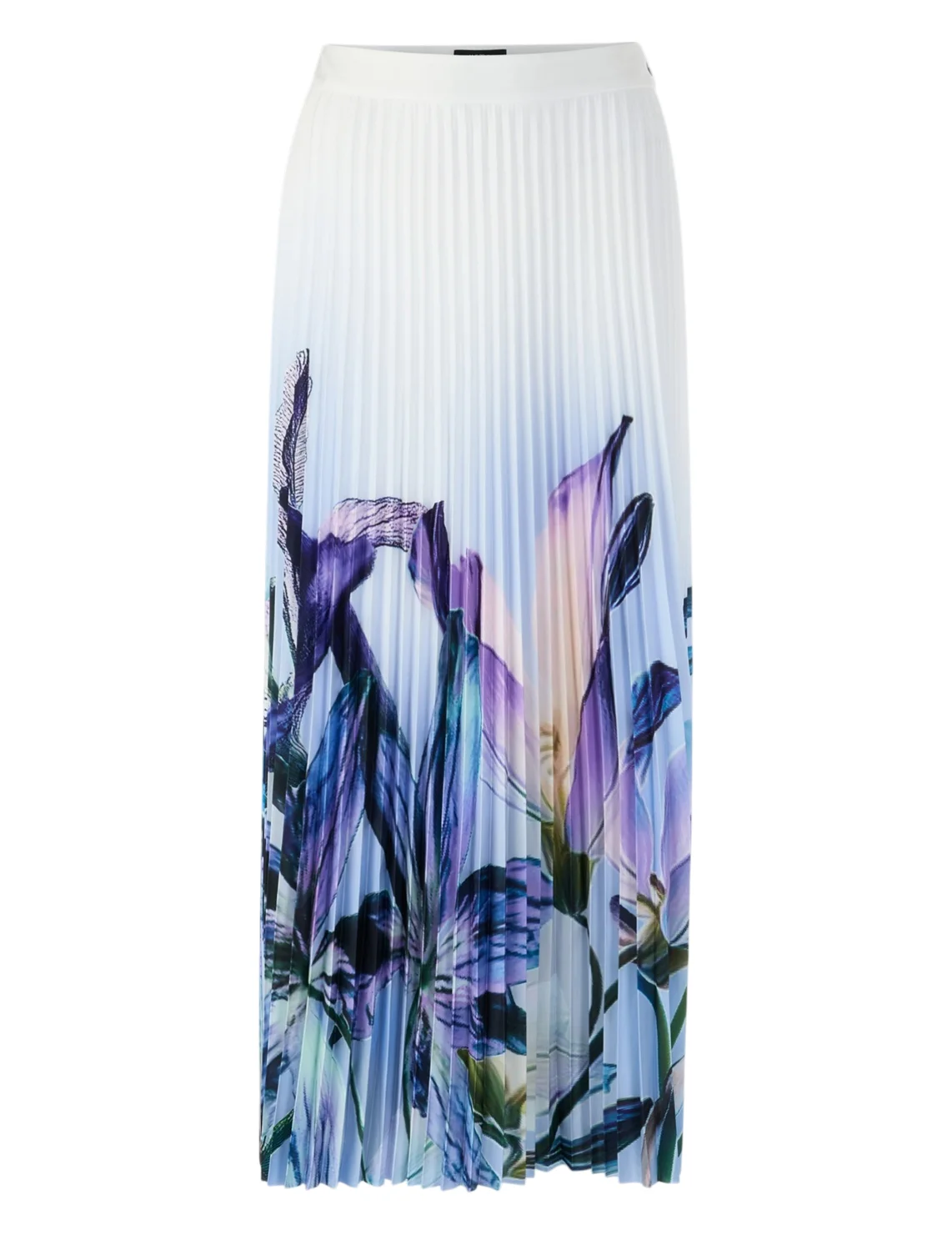 Юбка изготовлена из 100% полиэстера, подкладка из полиэстера. Модель длины миди выполнена в расклешенном крое. Имеет застежку на молнии сбоку, плиссировку и цветочный принт.