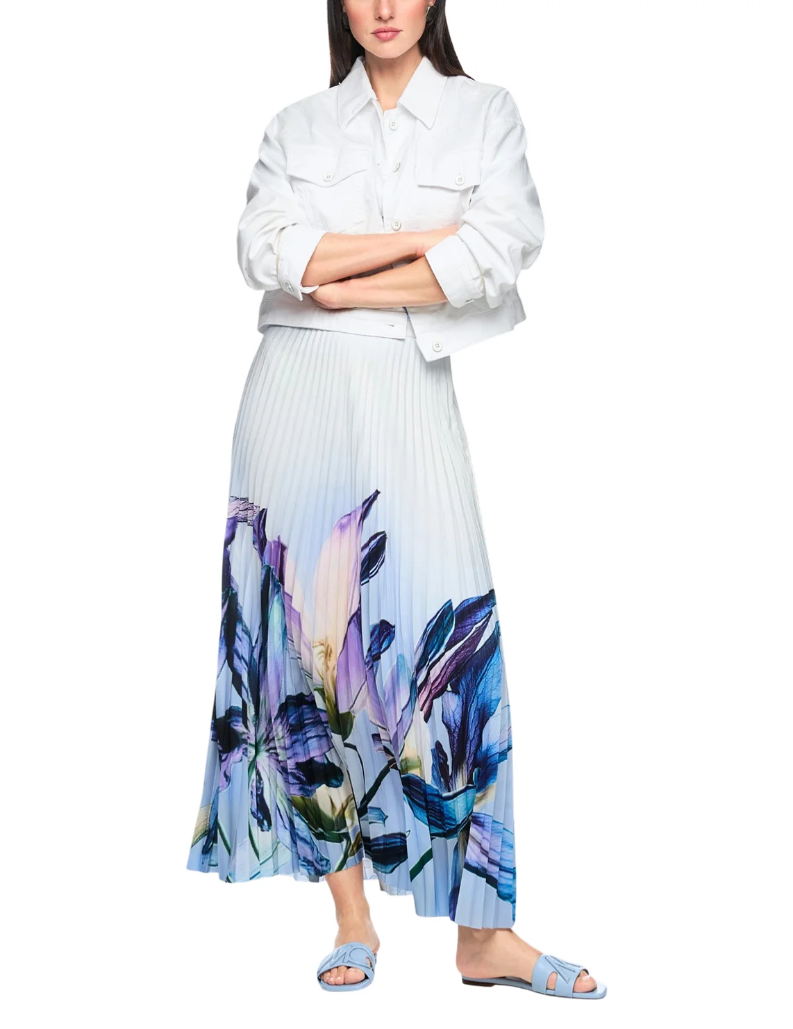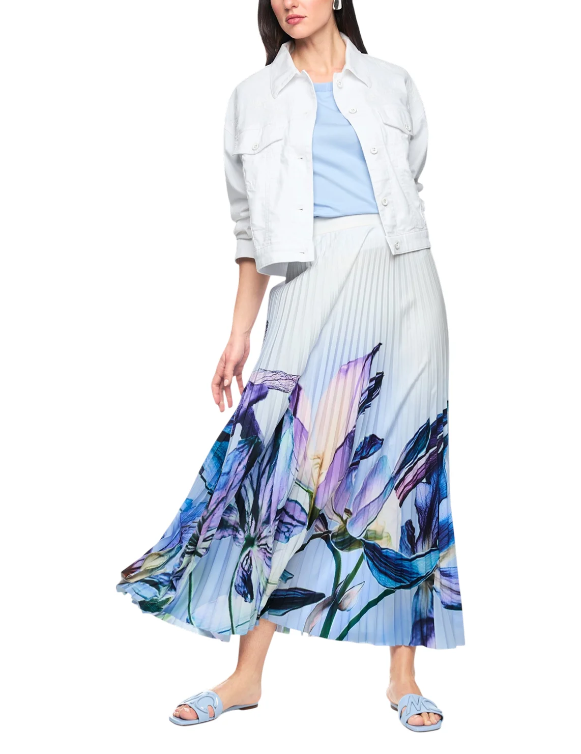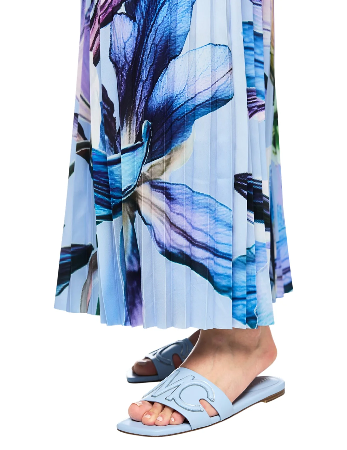 Юбка изготовлена из 100% полиэстера, подкладка из полиэстера. Модель длины миди выполнена в расклешенном крое. Имеет застежку на молнии сбоку, плиссировку и цветочный принт.
