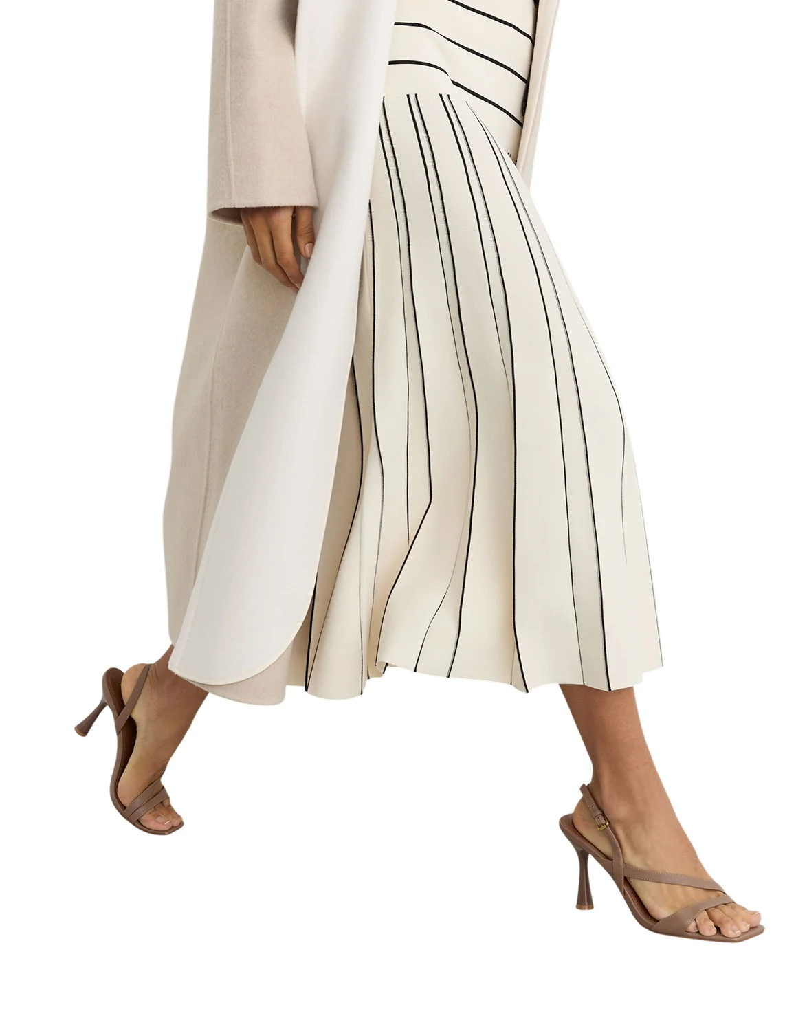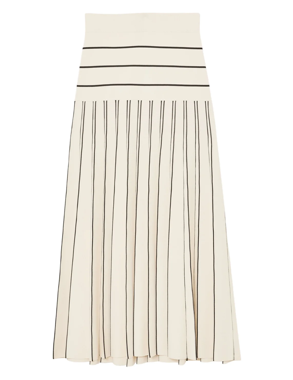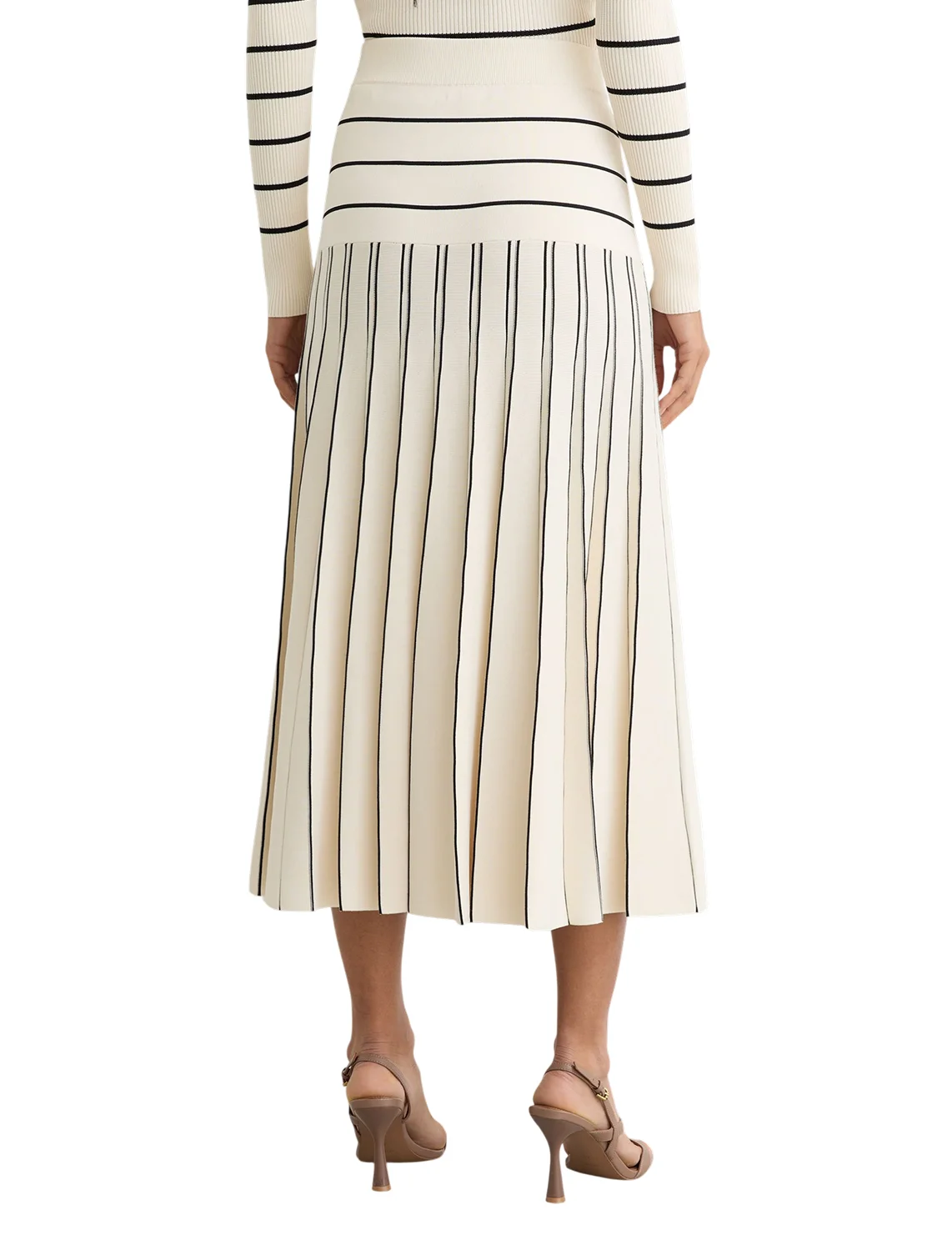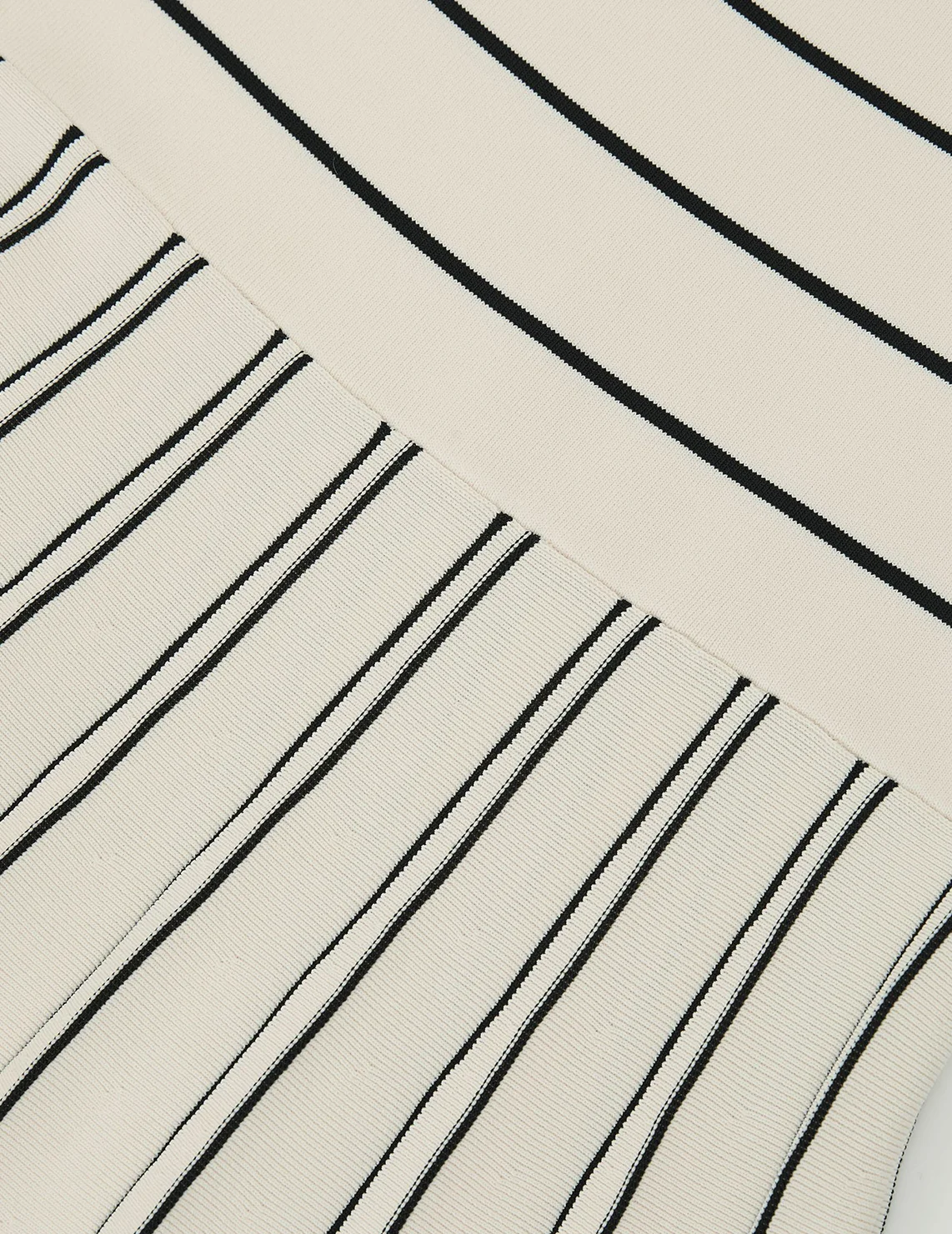 Юбка изготовлена из вискозы, нейлона и эластана. Модель длины миди выполнена в расклешенном крое. Имеет эластичный пояс и плиссировку. Декорирована принтом в полоску.