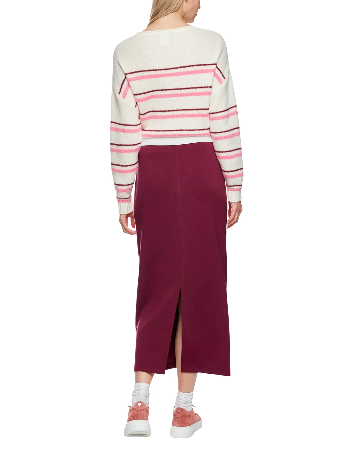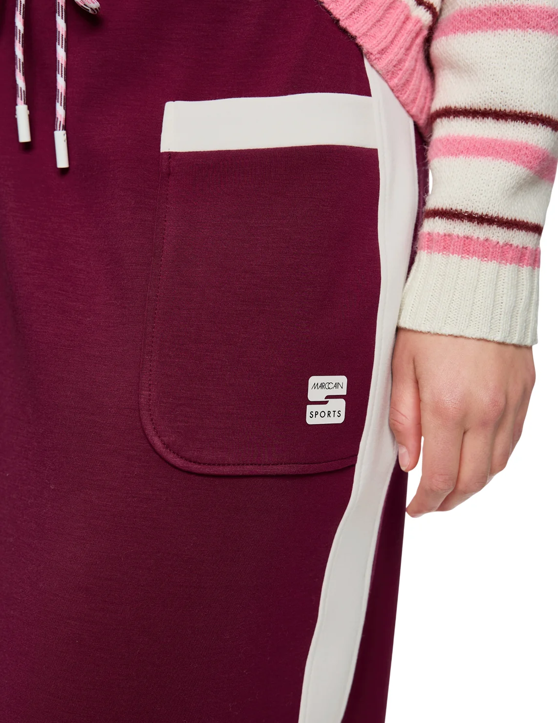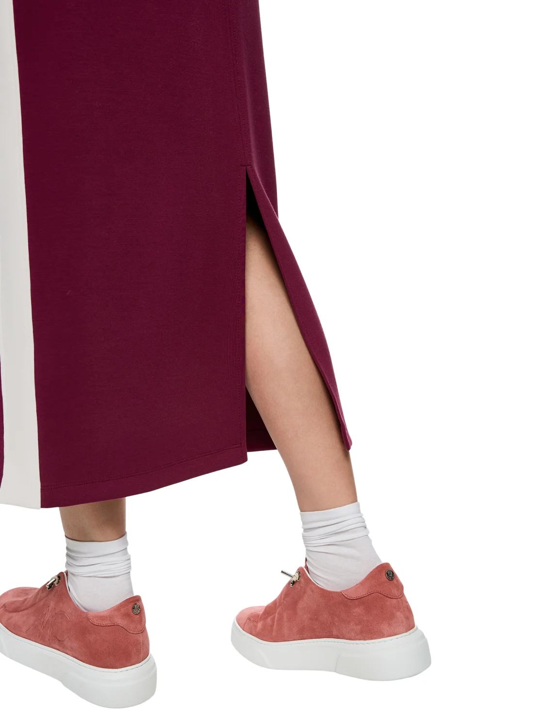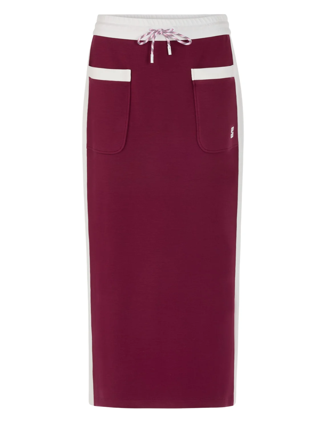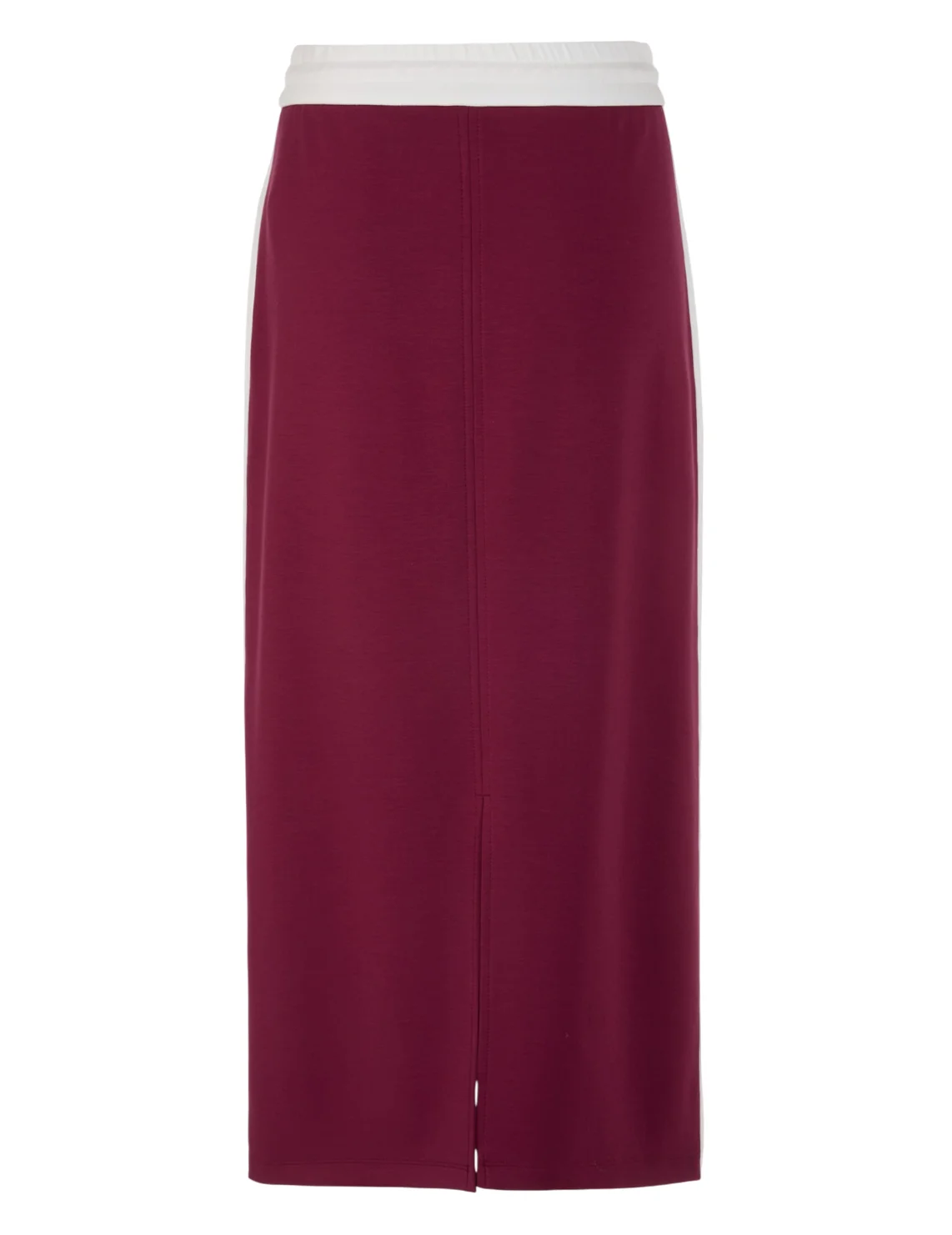 Юбка изготовлена из полиамида, вискозы и эластана. Модель длины миди выполнена в прямом крое. Имеет эластичный пояс с кулиской, накладные карманы и разрез сзади. Декорирована контрастными полосами и логотипом бренда.