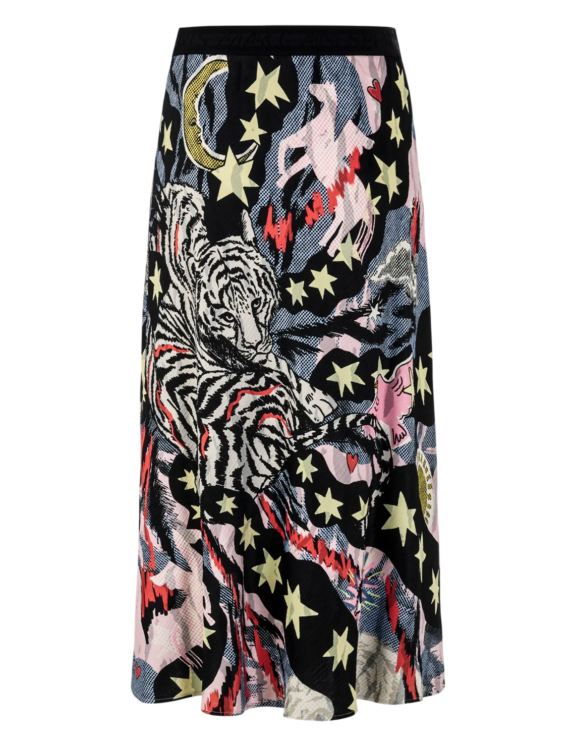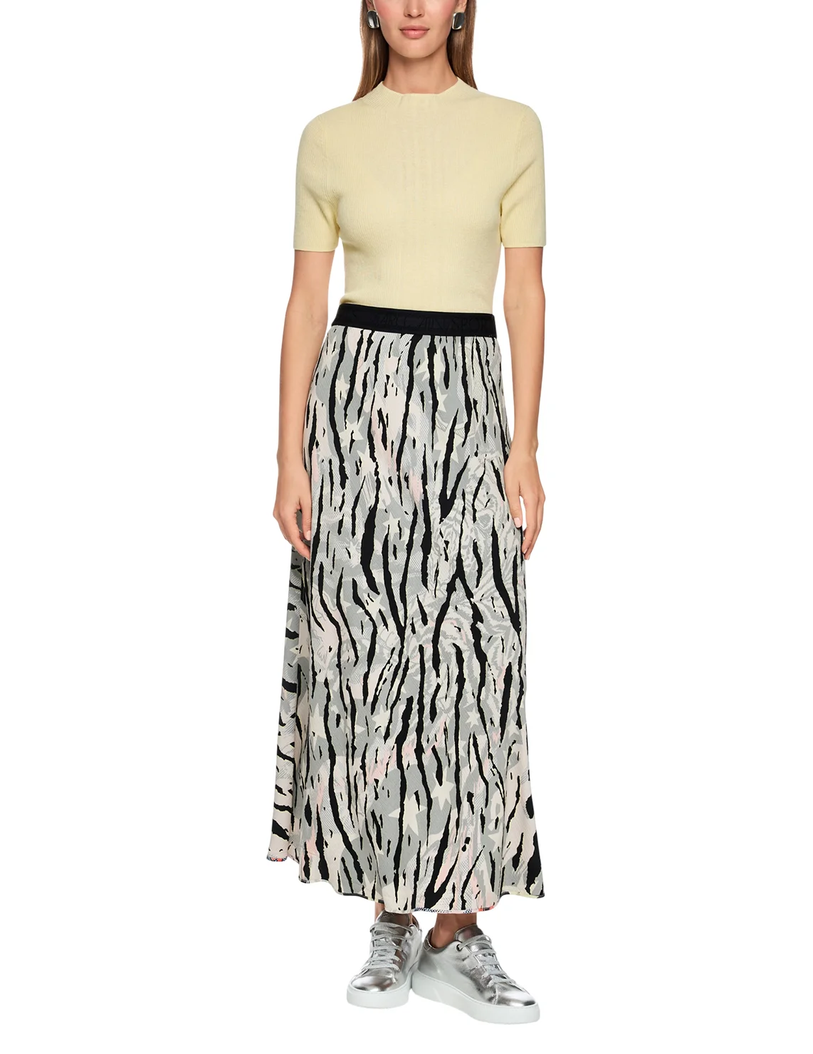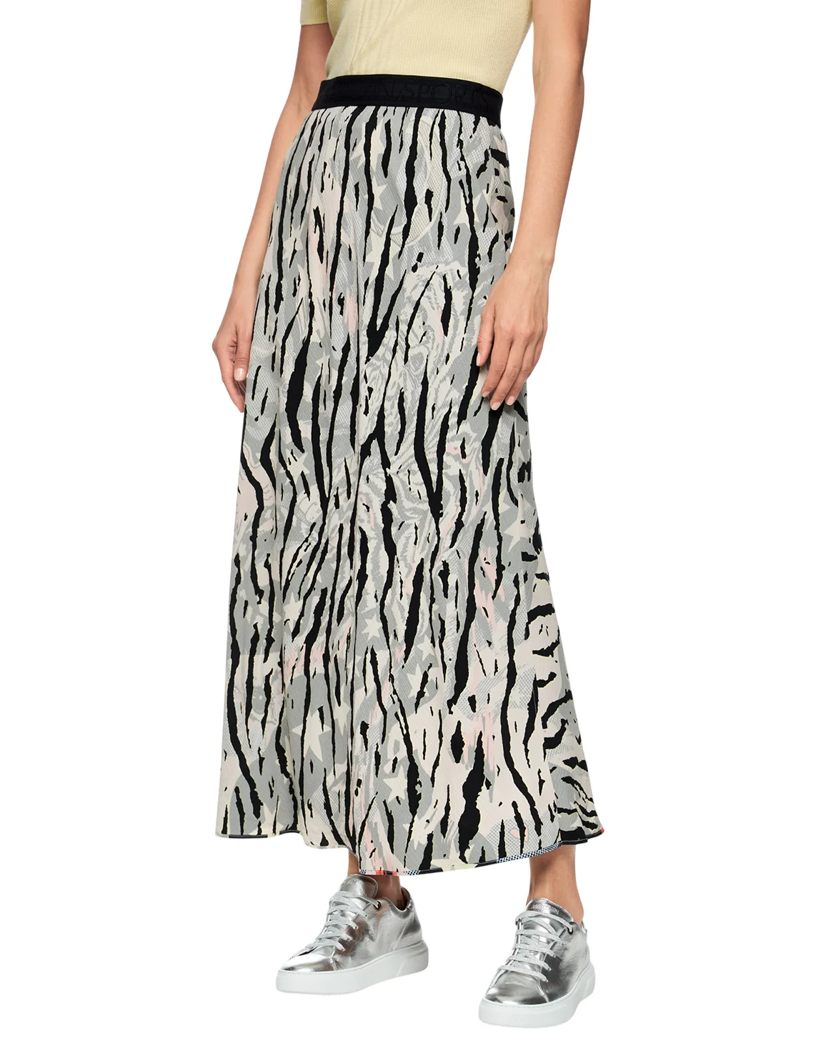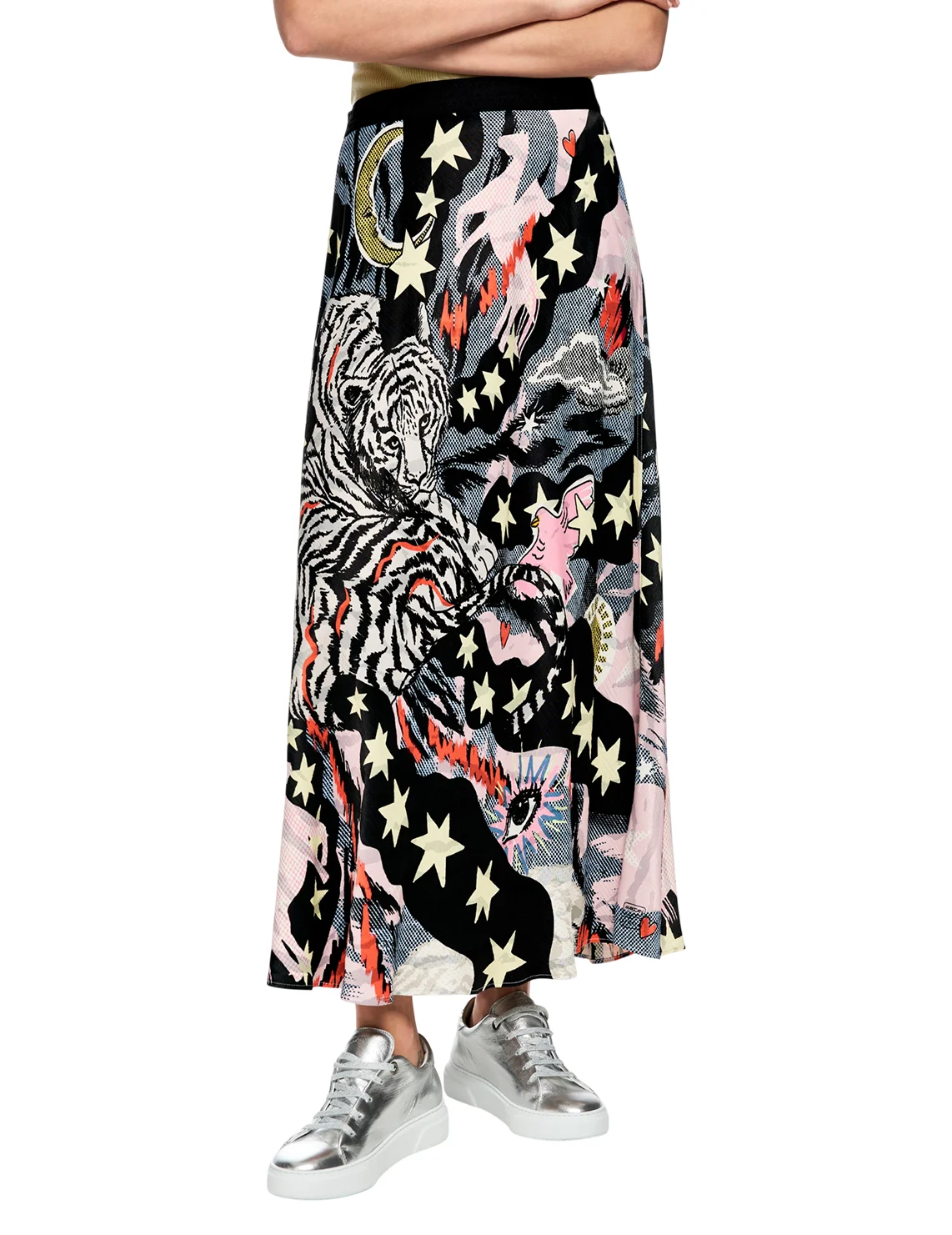 Двусторонняя юбка изготовлена из 100% вискозы. Модель длины миди выполнена в расклешенном крое. Имеет эластичный пояс. Декорирована абстрактным принтом с одной стороны и анималистичным принтом с другой стороны.