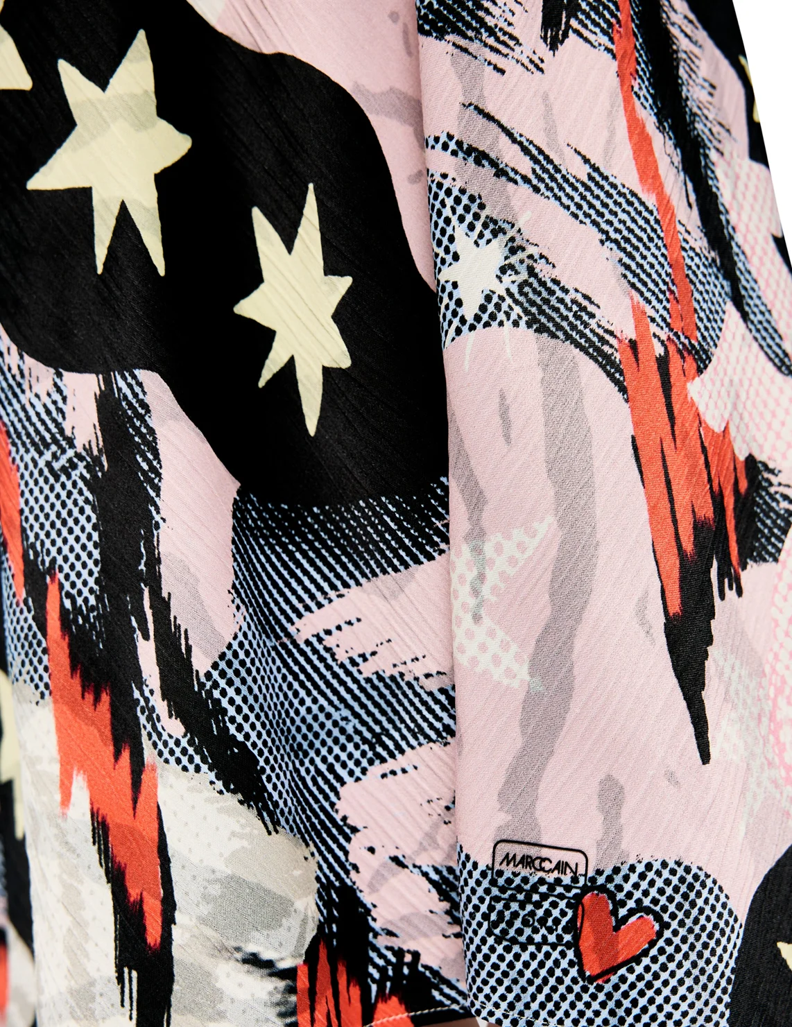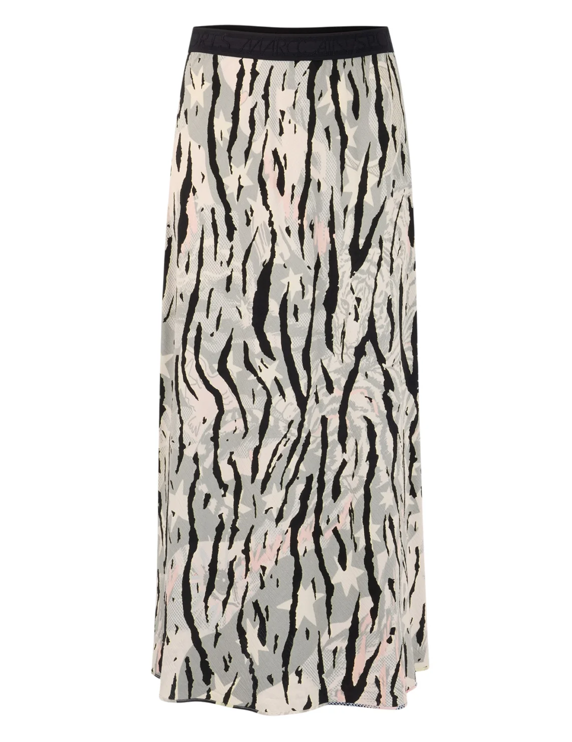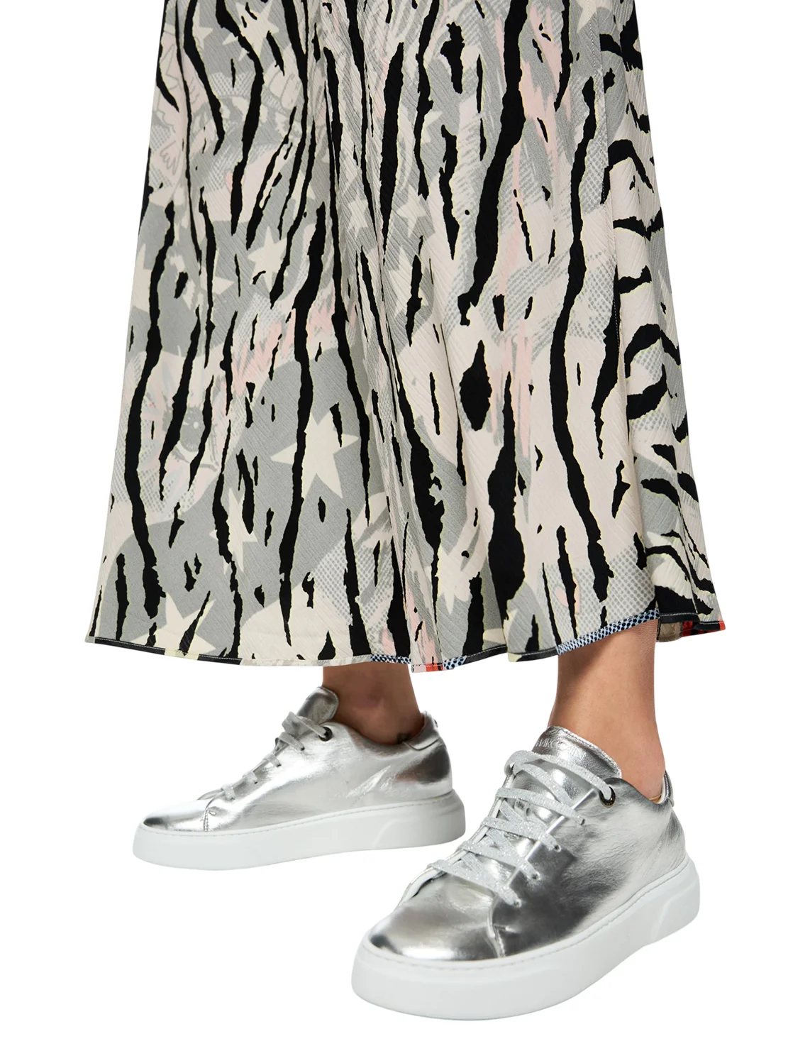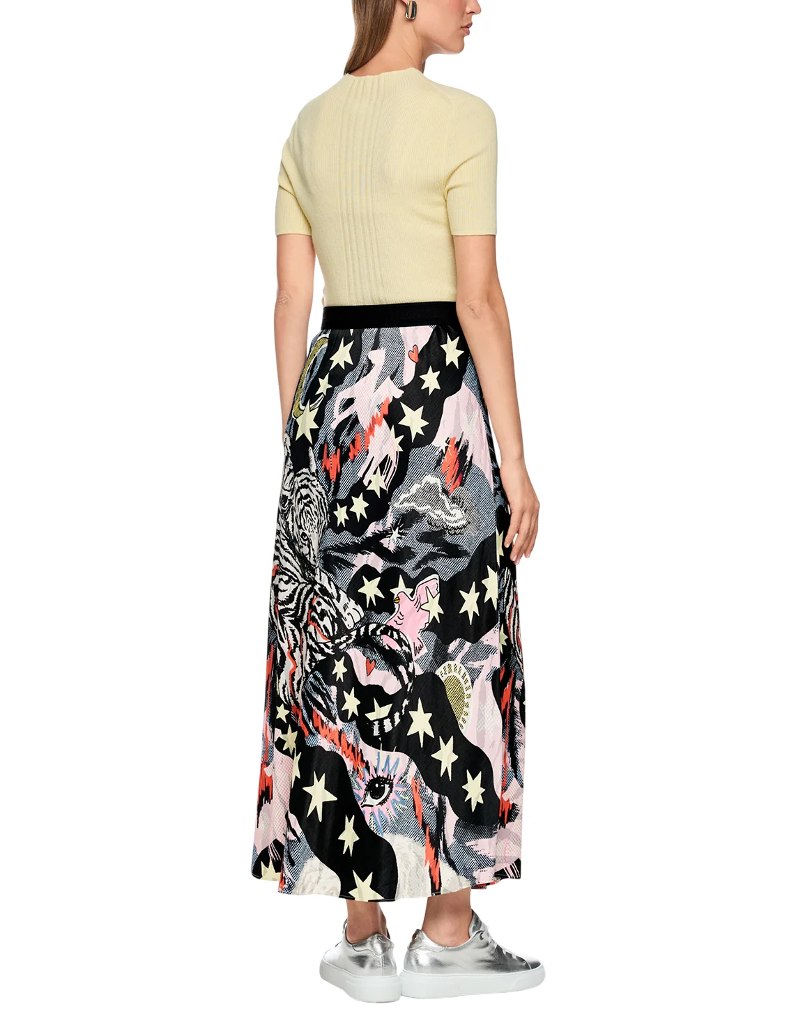 Двусторонняя юбка изготовлена из 100% вискозы. Модель длины миди выполнена в расклешенном крое. Имеет эластичный пояс. Декорирована абстрактным принтом с одной стороны и анималистичным принтом с другой стороны.