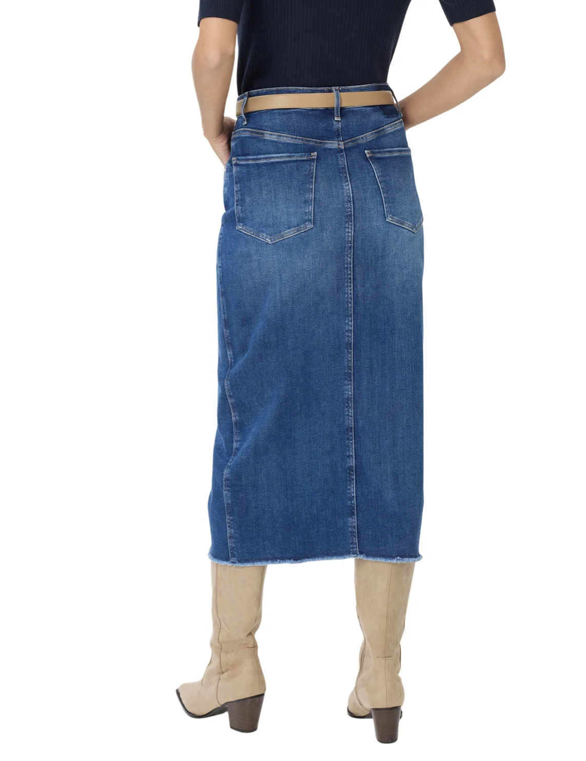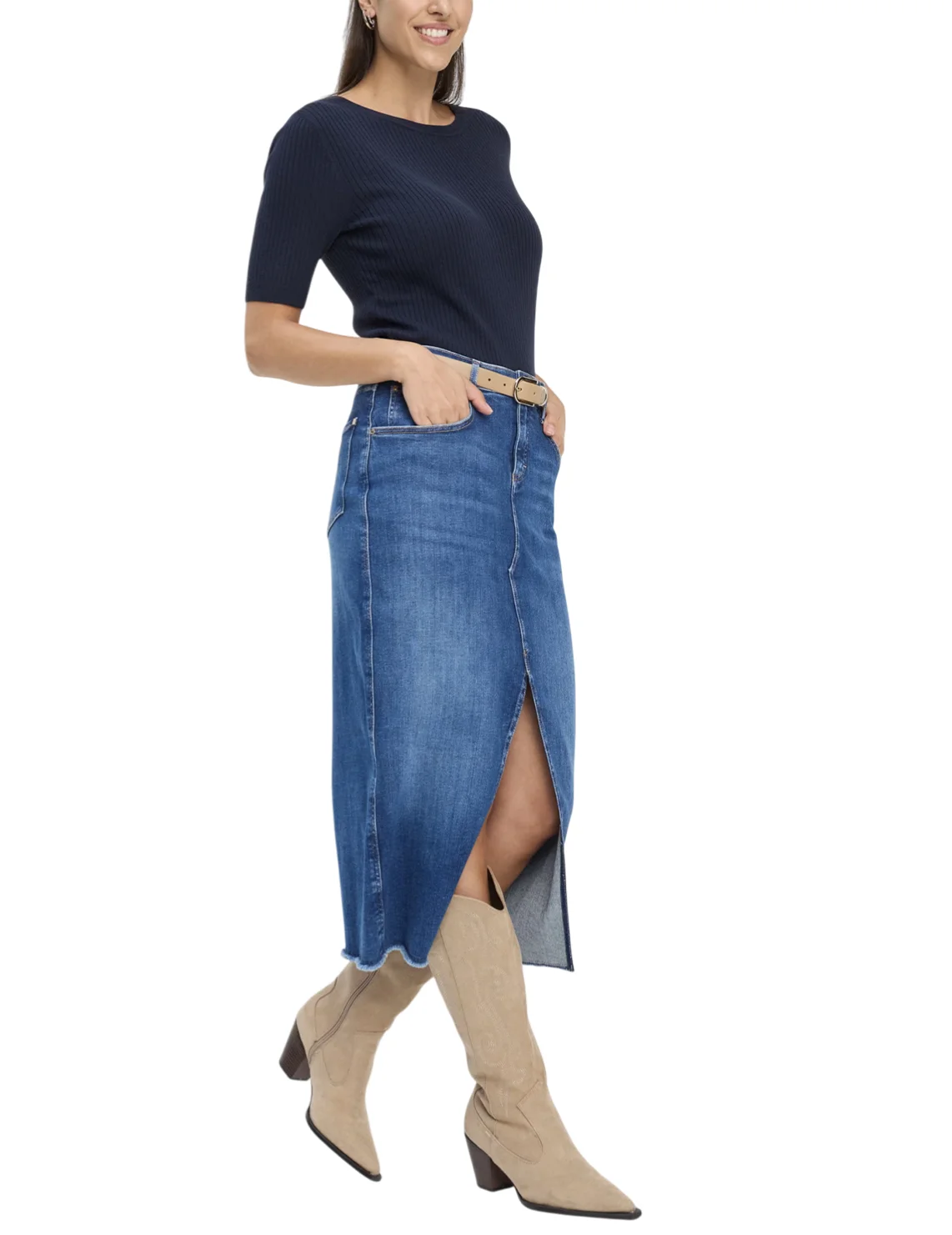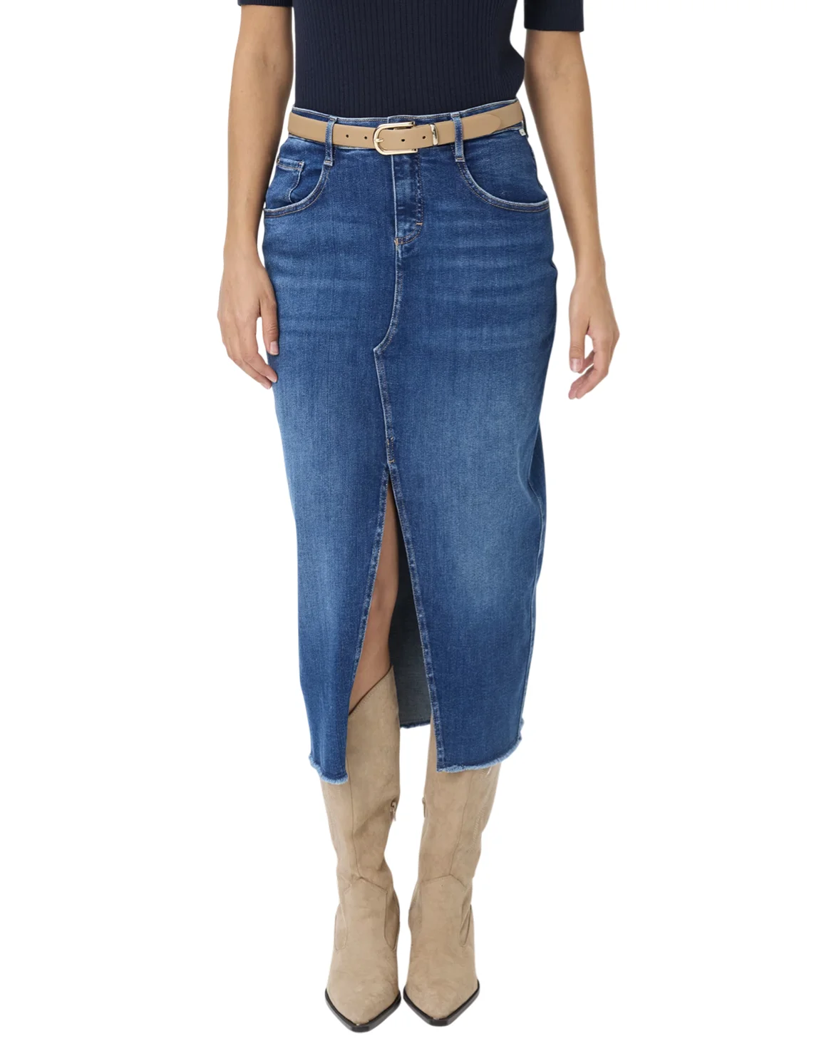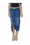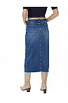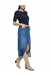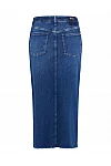 Джинсовая юбка изготовлена из хлопка, полиэстера и эластана. Модель длины миди выполнена в прямом крое. Имеет шлёвки для ремня, скрытую застежку-молнию с пуговицей, прорезные карманы спереди, накладные карманы сзади и передний разрез.