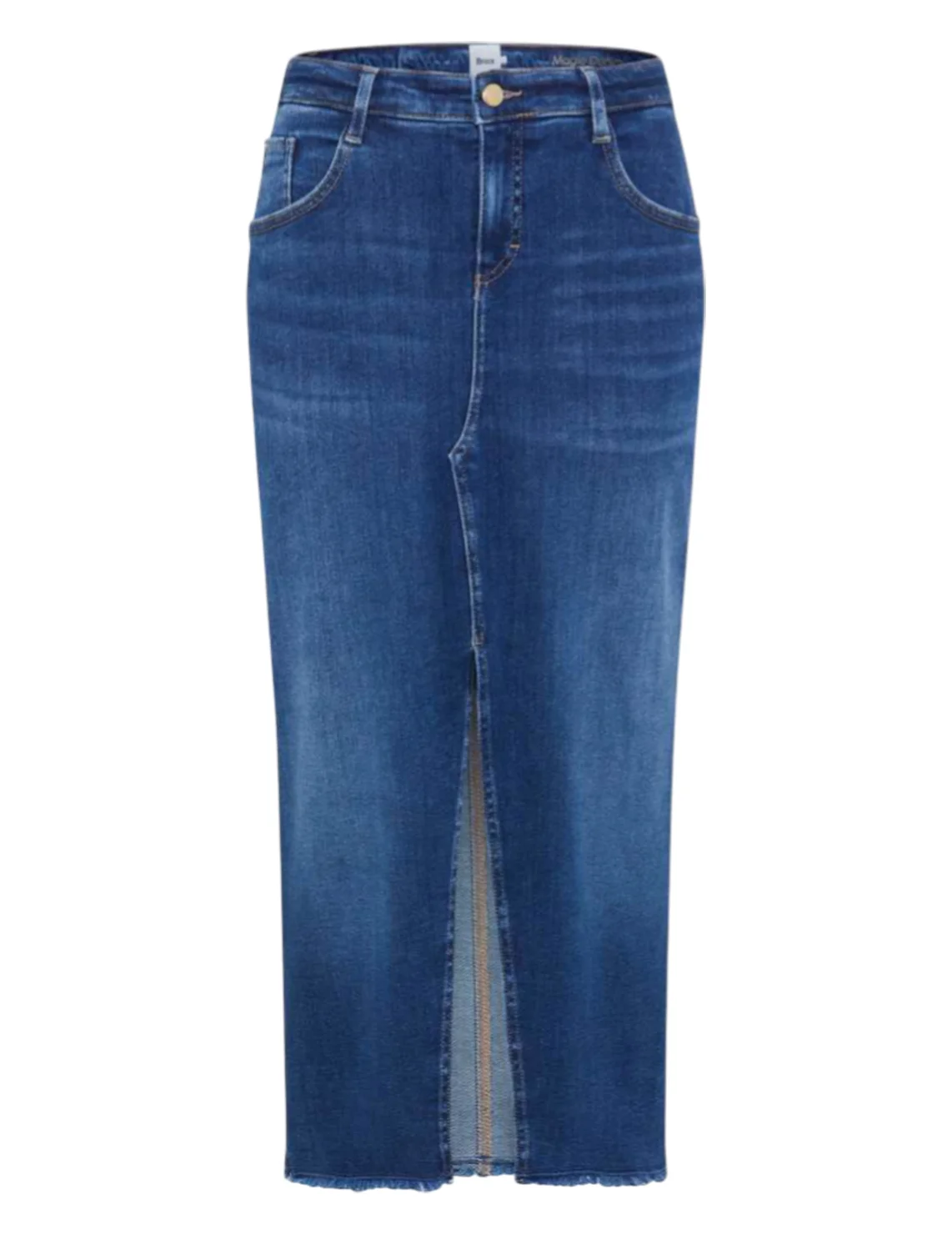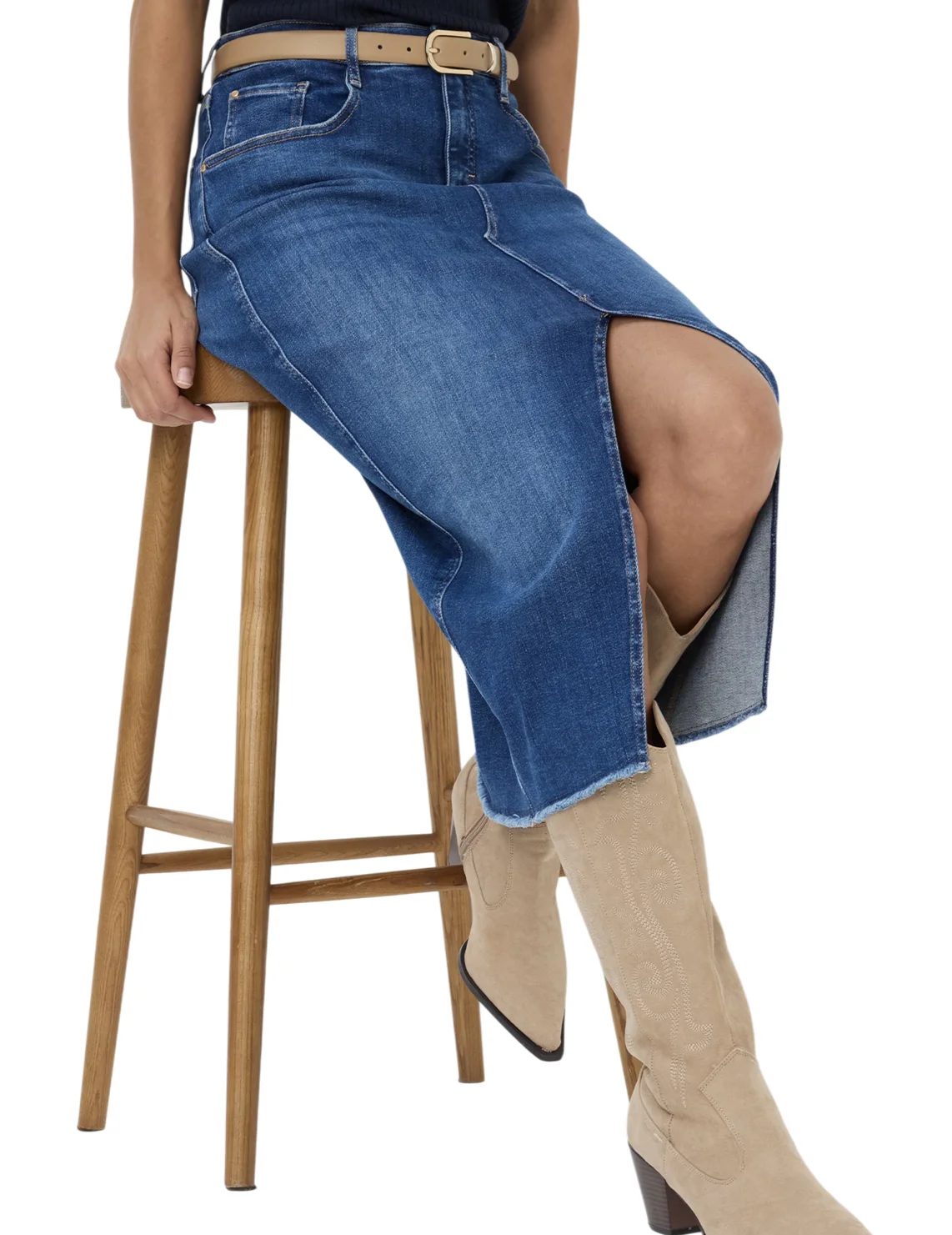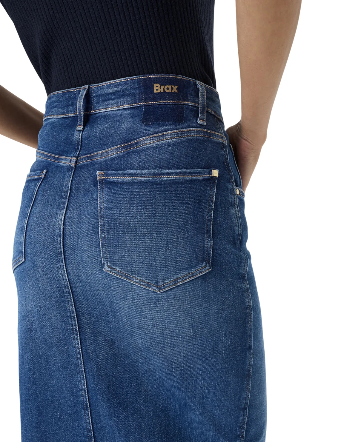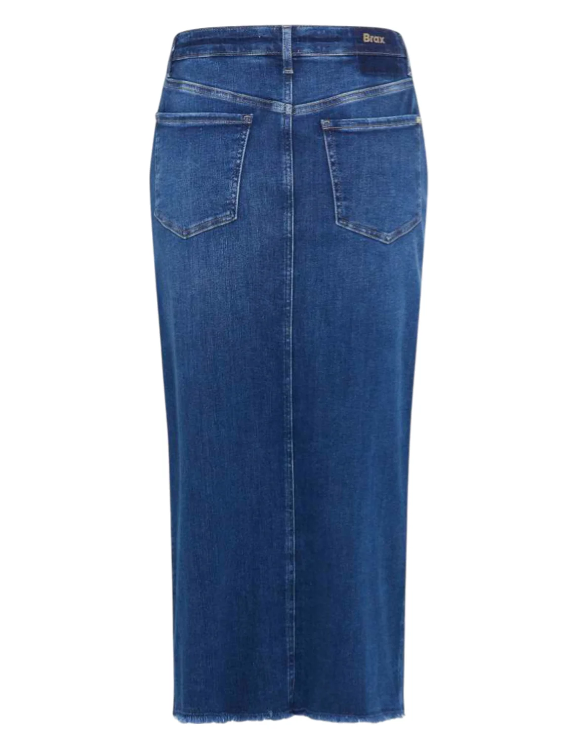 Джинсовая юбка изготовлена из хлопка, полиэстера и эластана. Модель длины миди выполнена в прямом крое. Имеет шлёвки для ремня, скрытую застежку-молнию с пуговицей, прорезные карманы спереди, накладные карманы сзади и передний разрез.