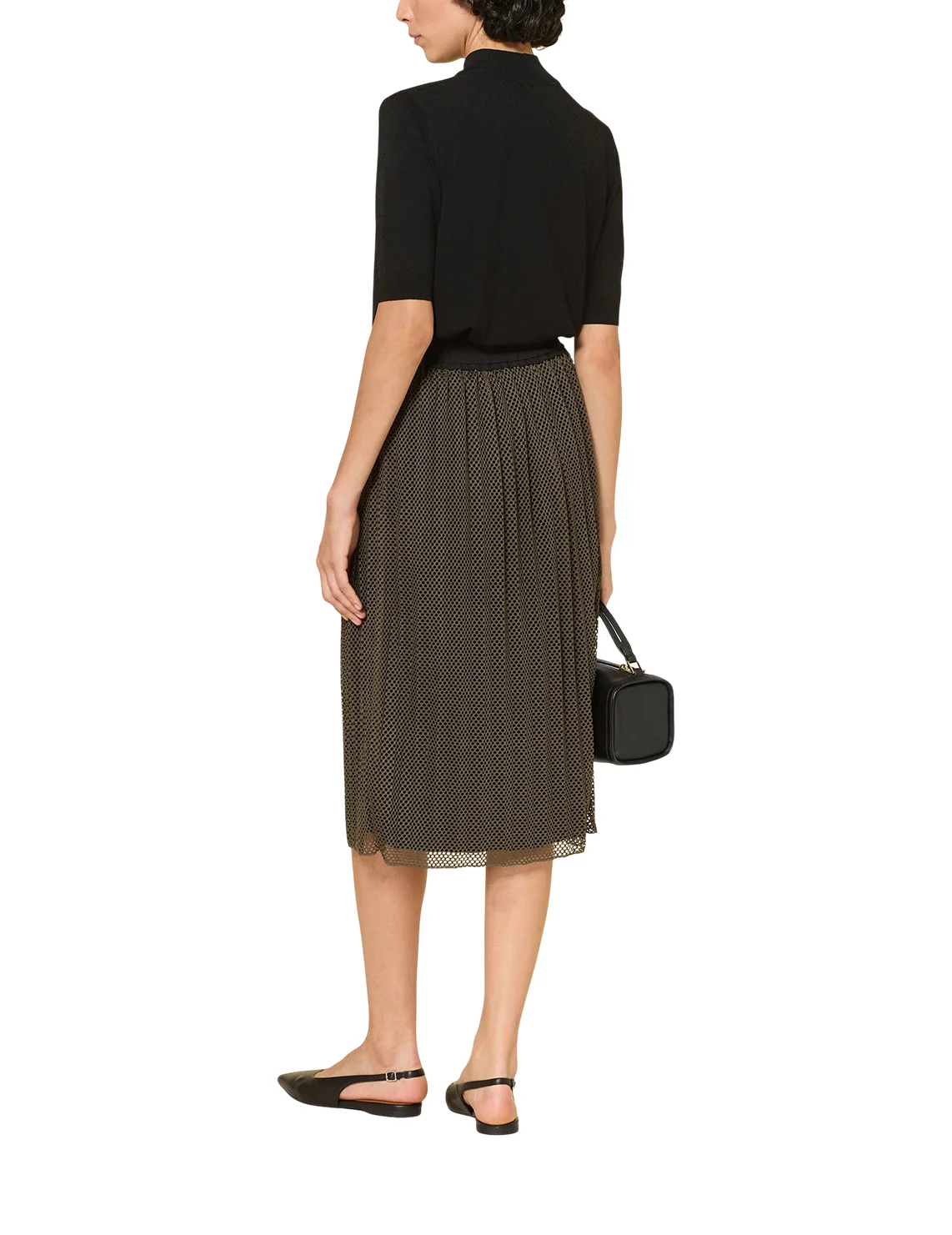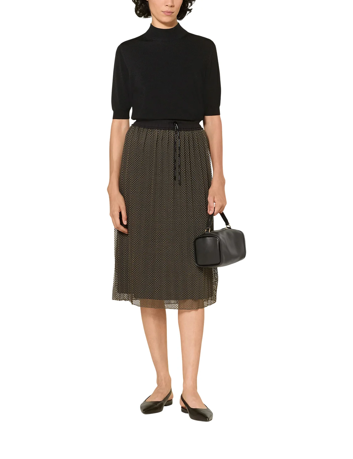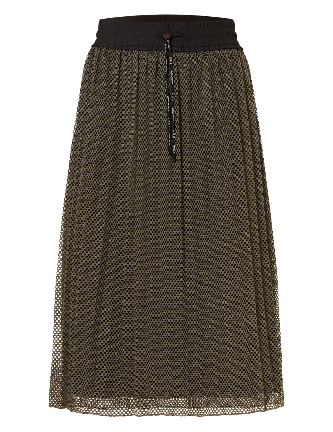 Сетчатая юбка изготовлена из 100% полиэстера, подкладка из полиамида и эластана. Модель длины миди выполнена в расклешенном крое. Имеет плиссировку и эластичный пояс с кулиской.