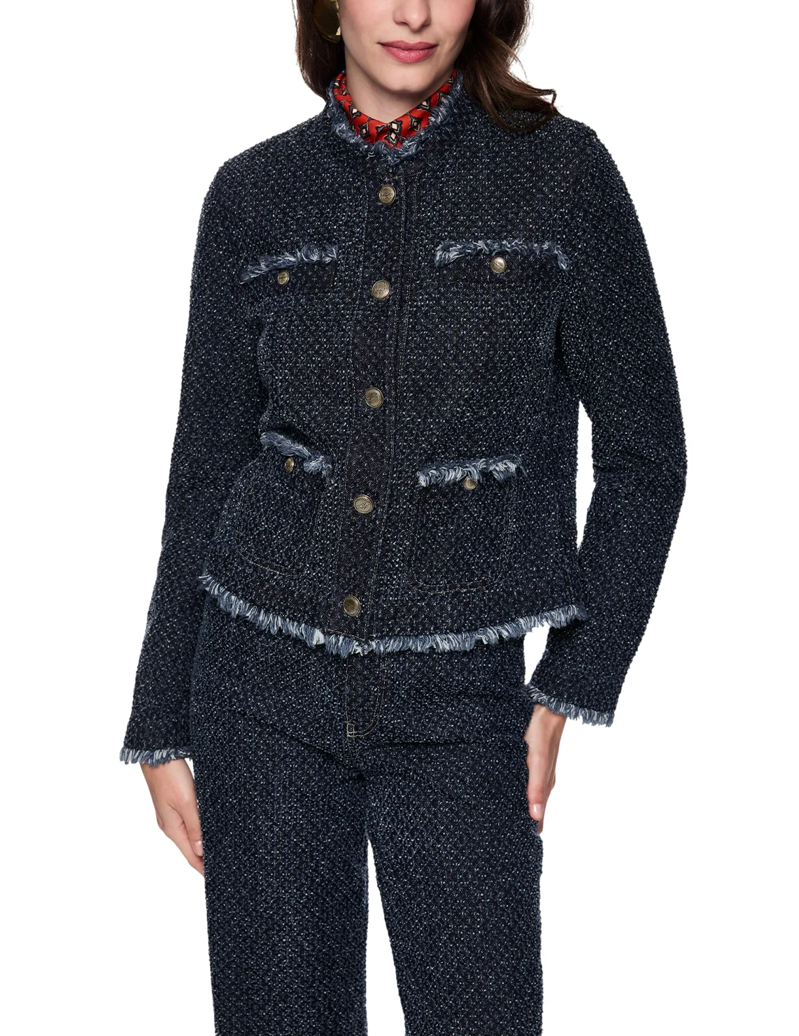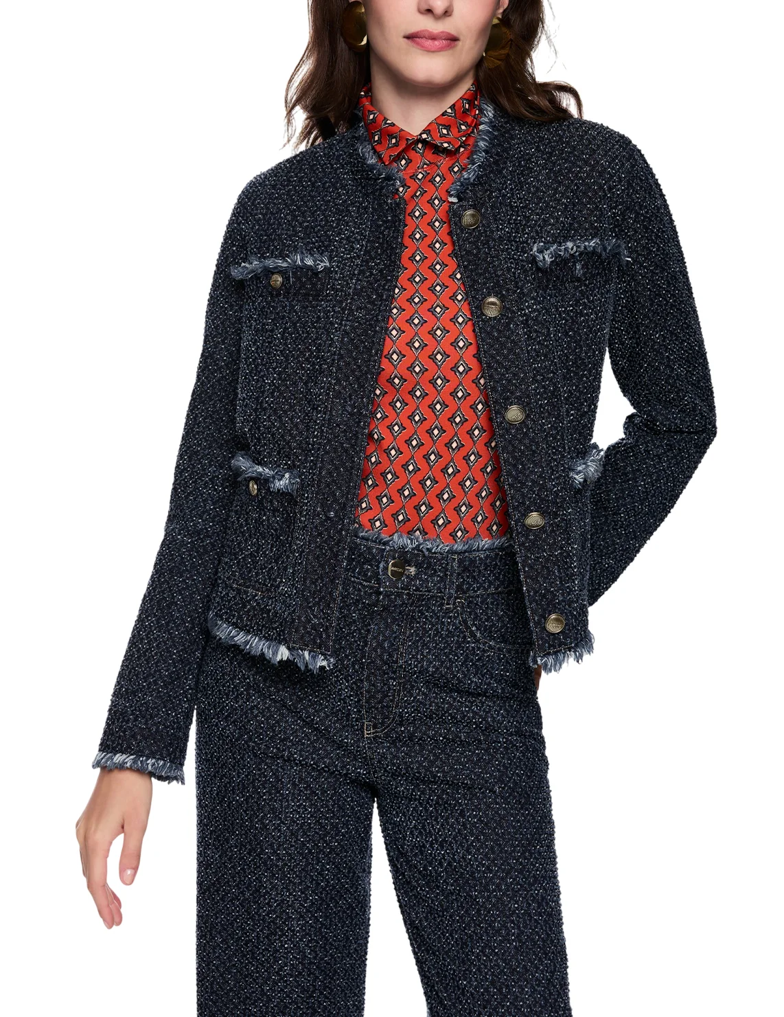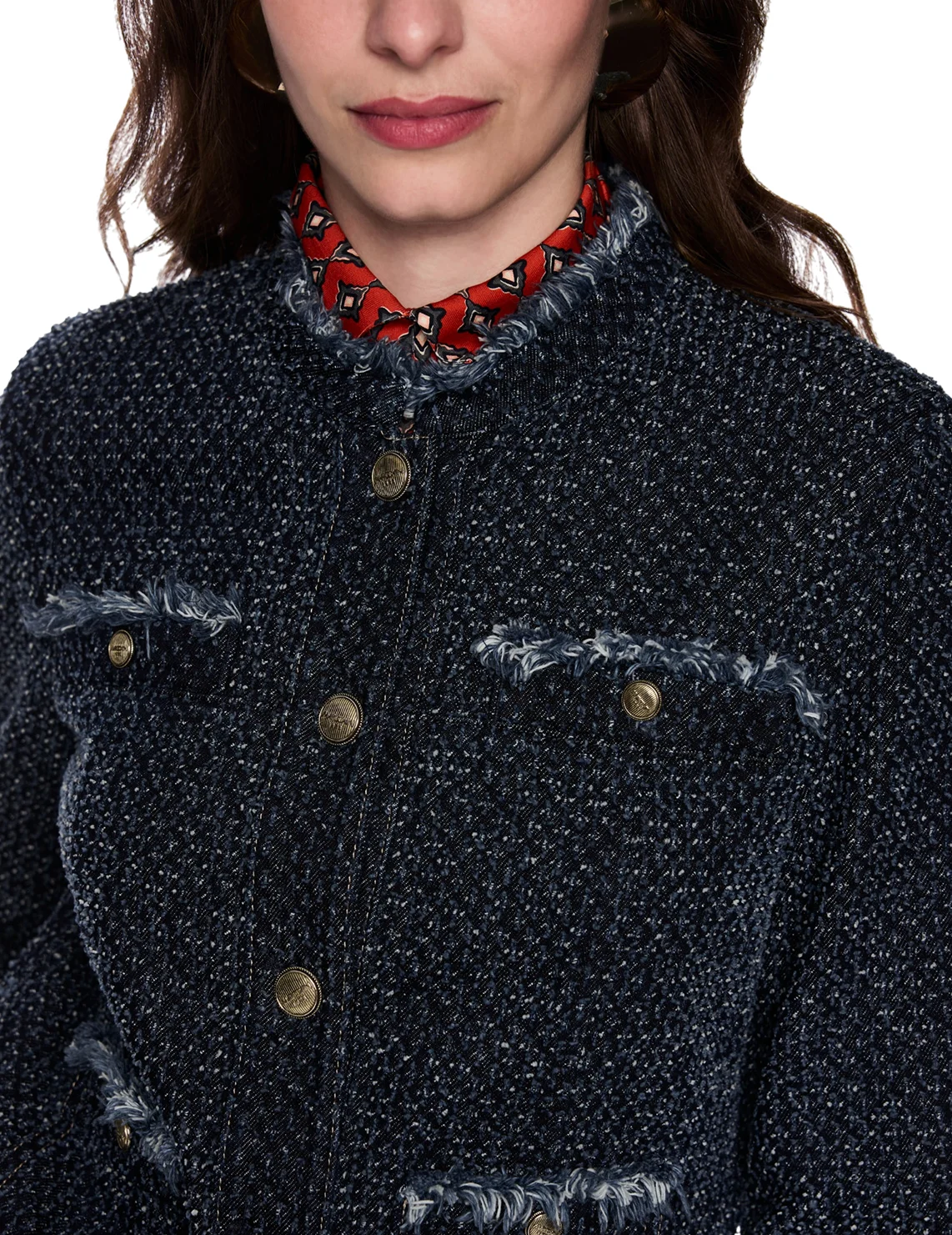 Жакет изготовлен из хлопка высокого качества. Модель выполнена в прямом крое. Имеет воротник-стойку, застежку на пуговицах, длинные рукава и накладные карманы. Декорирован бахромой.