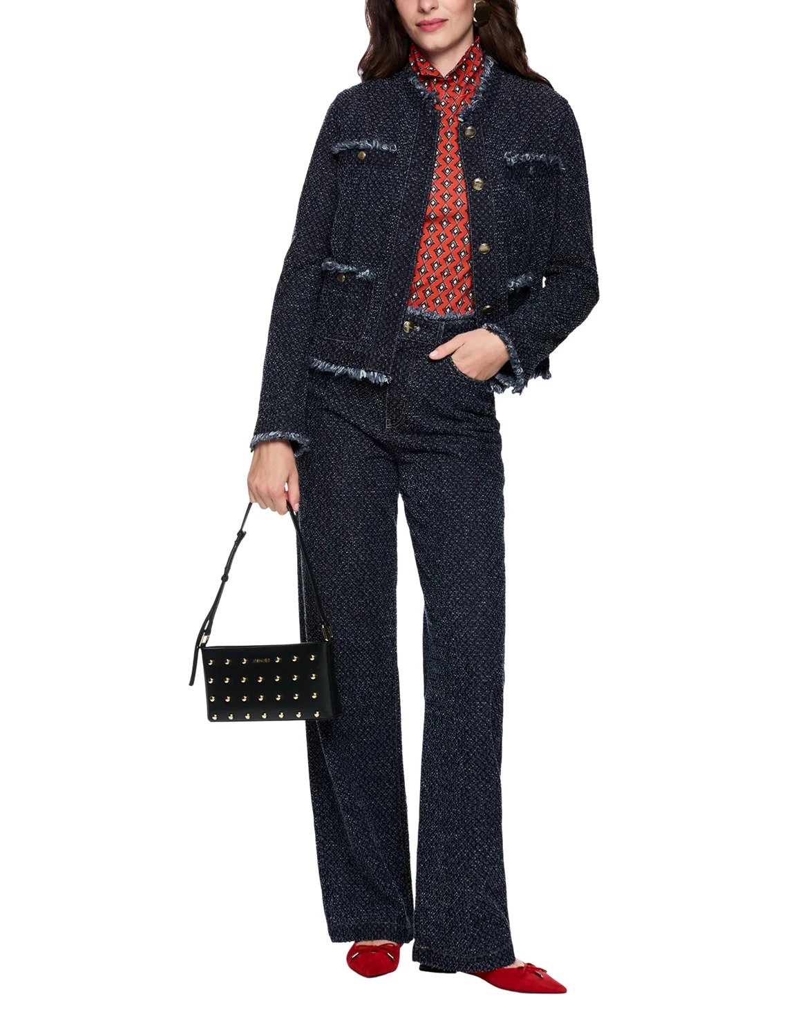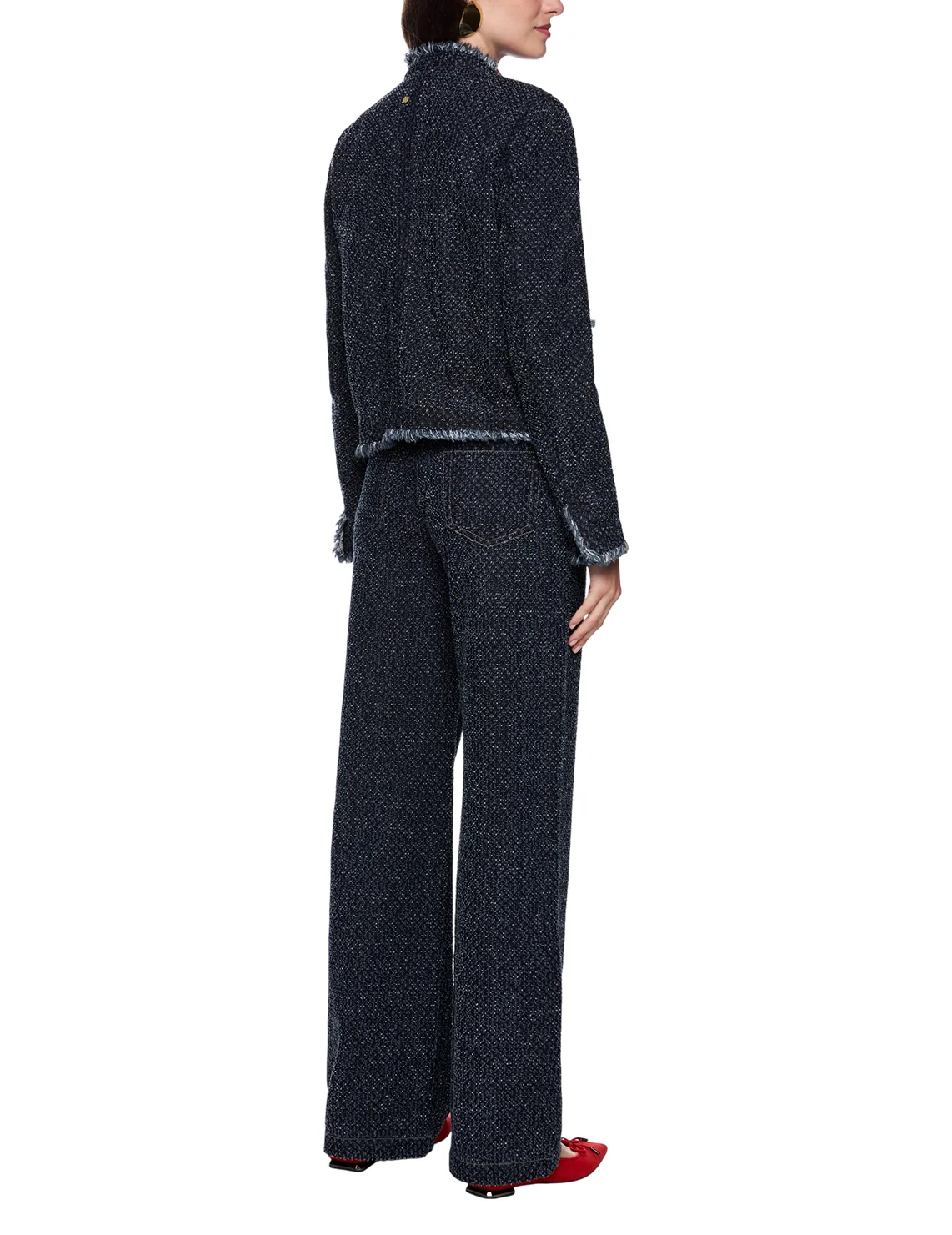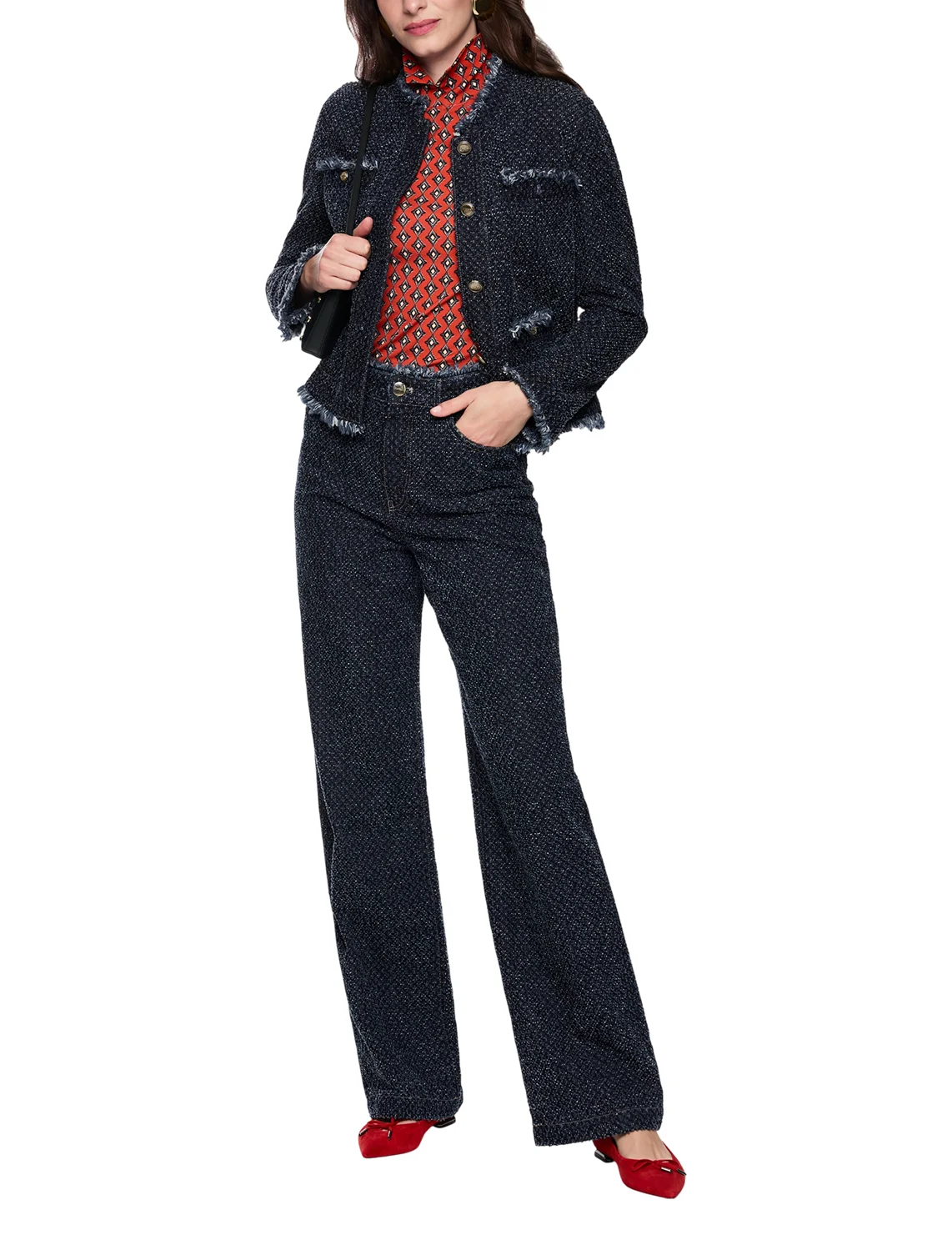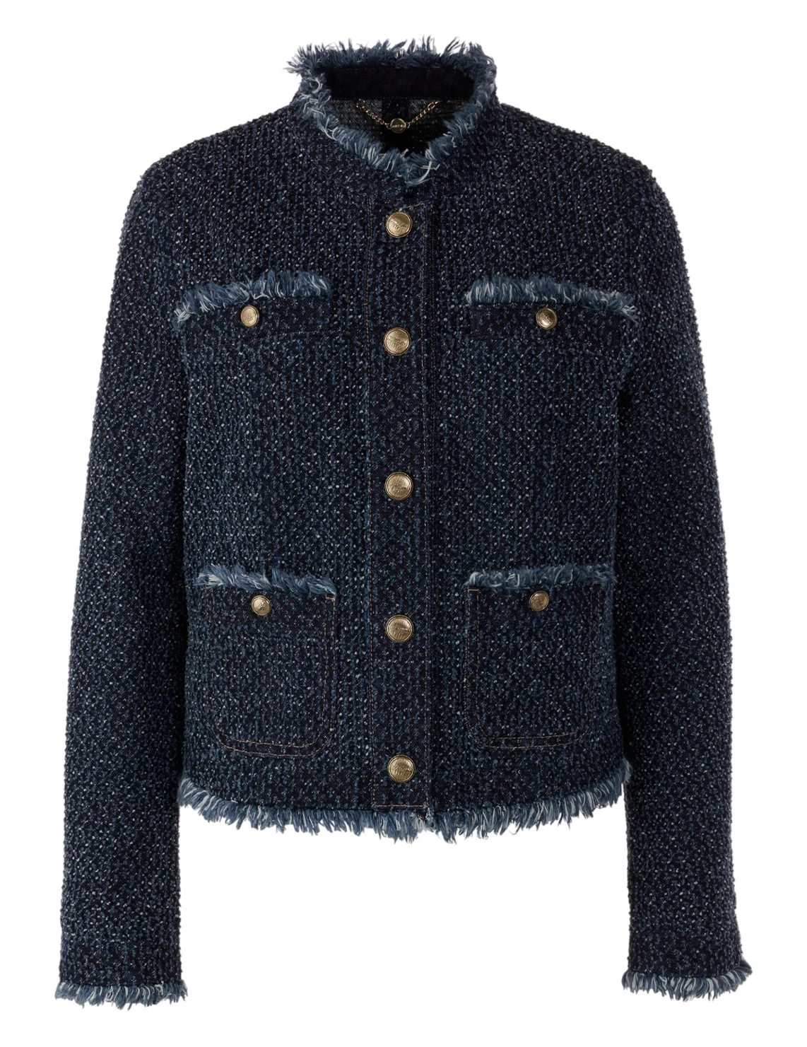Жакет изготовлен из хлопка высокого качества. Модель выполнена в прямом крое. Имеет воротник-стойку, застежку на пуговицах, длинные рукава и накладные карманы. Декорирован бахромой.