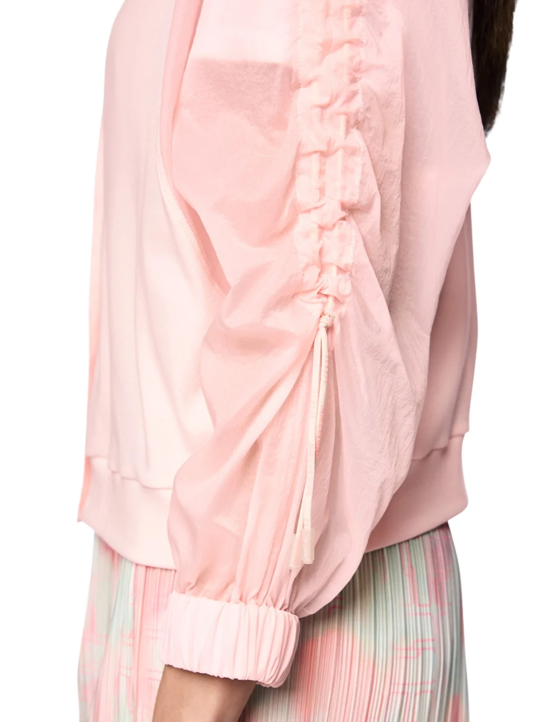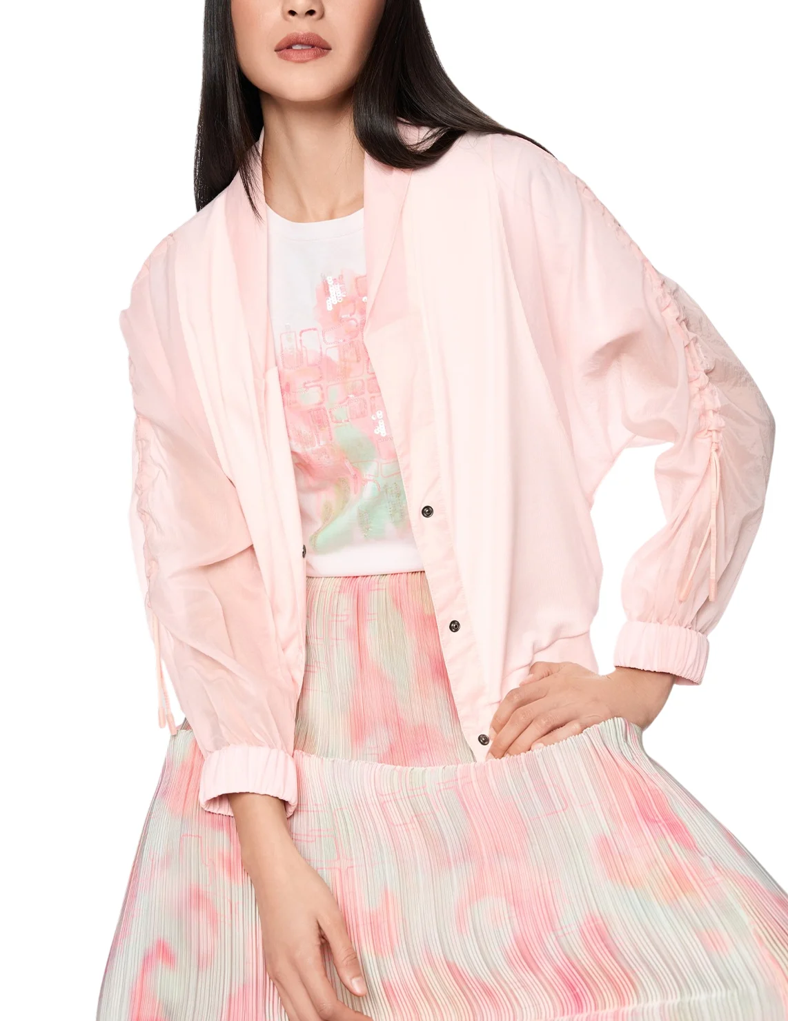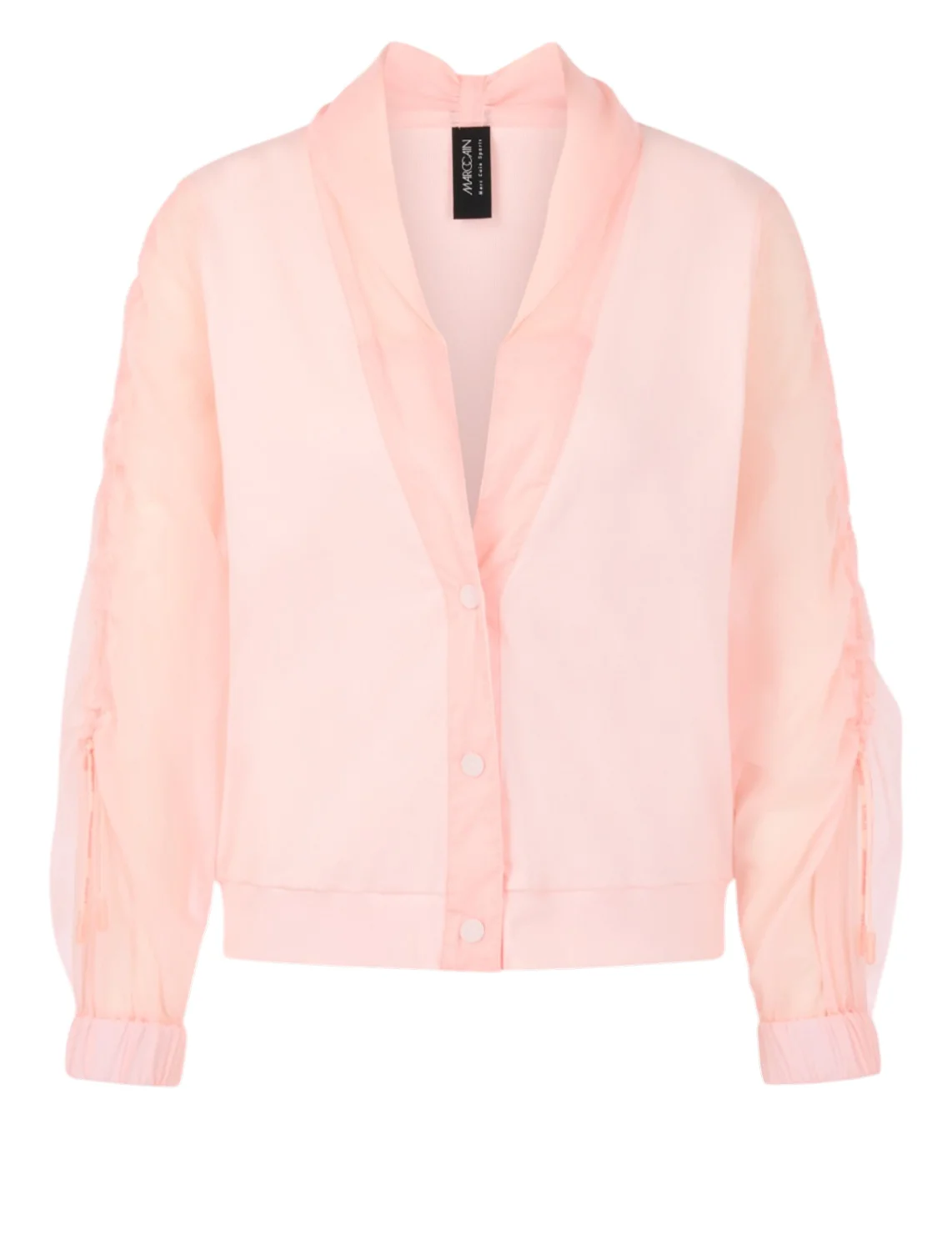 Жакет изготовлен из хлопка и эластана. Модель выполнена в прямом крое. Имеет V-образный вырез горловины, полупрозрачные длинные рукава с манжетами, застежку на кнопках и сборки на рукавах.