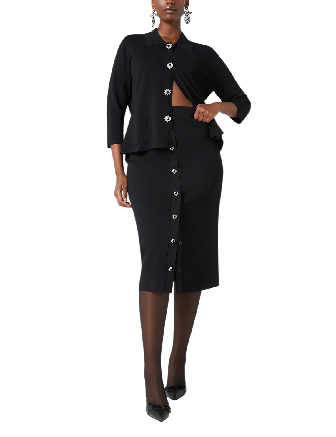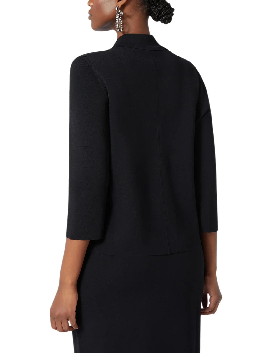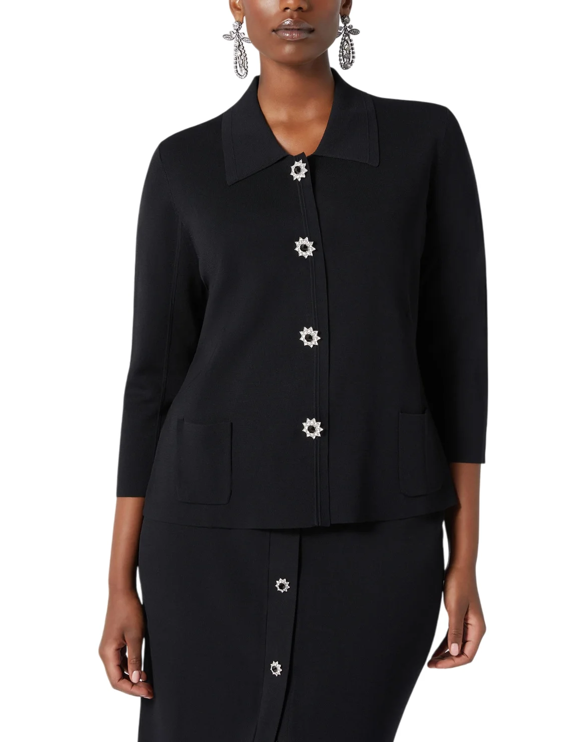 Жакет изготовлен из вискозы и полиамида. Модель прямого кроя. Имеет отложной воротник, застежку на кнопки, рукава 3/4 и два передних накладных кармана. Декорирован камнями на кнопках.