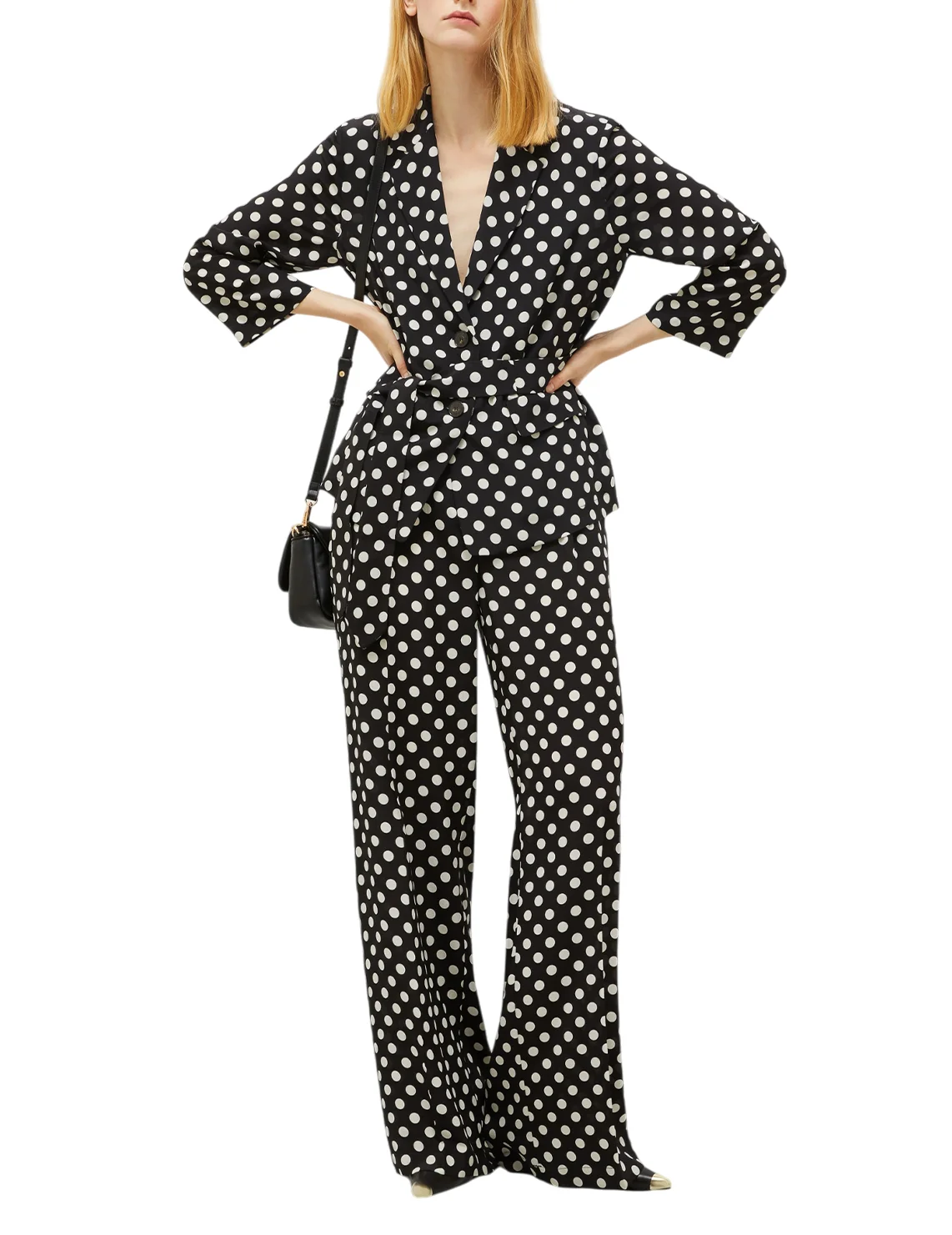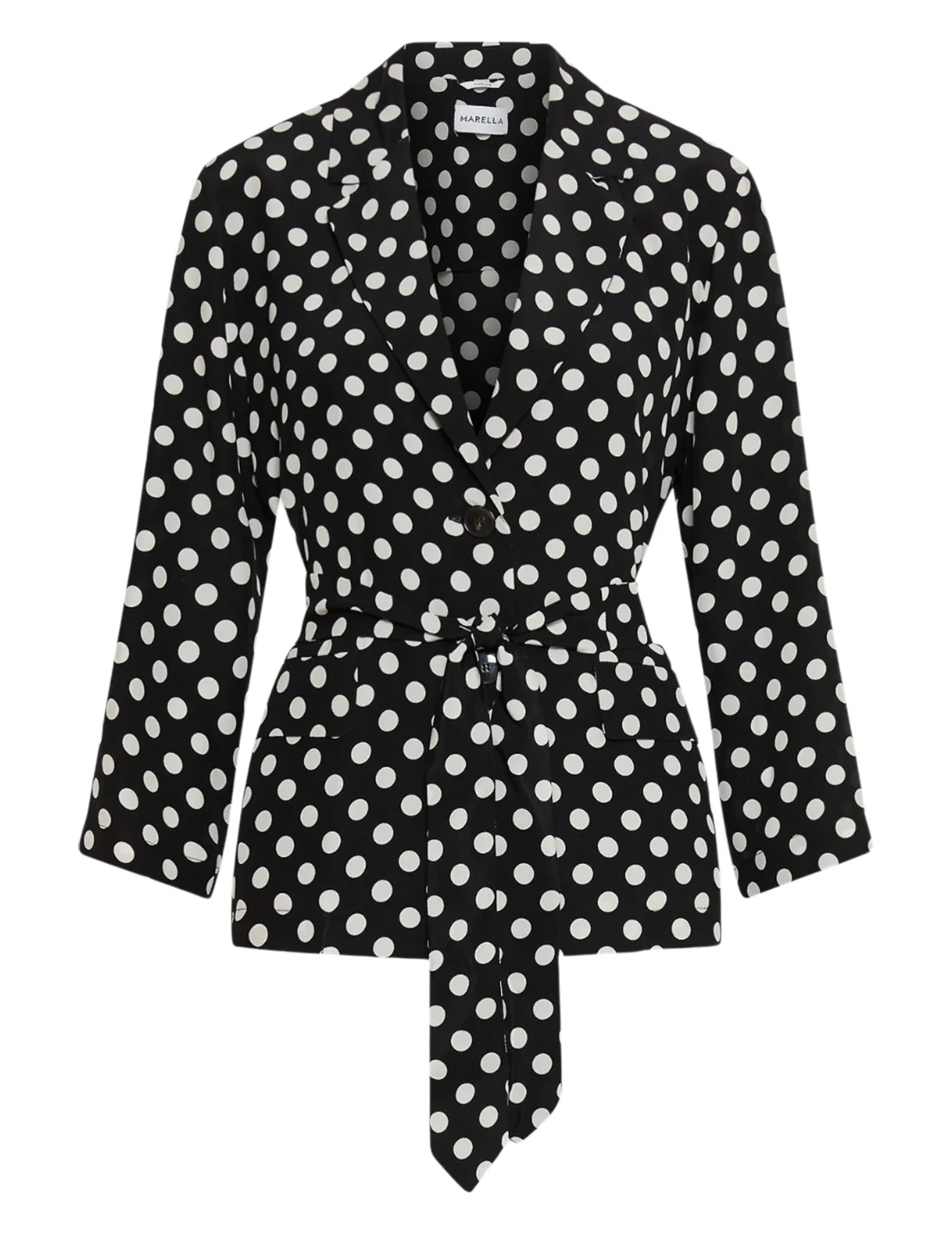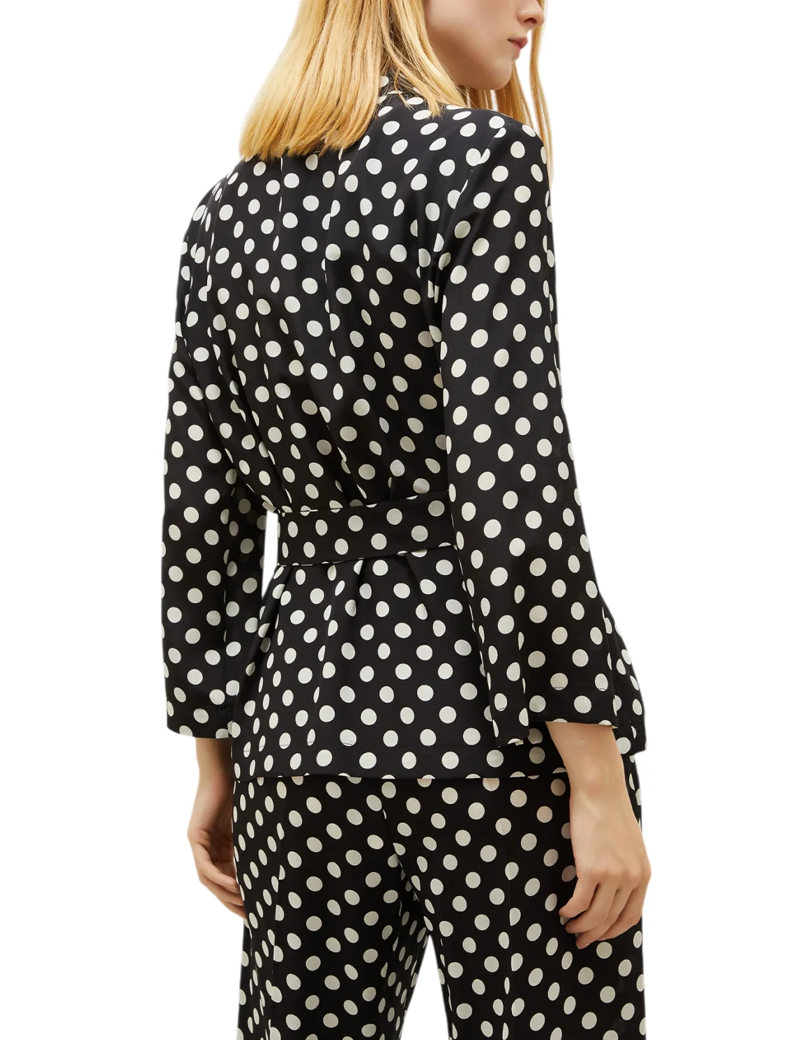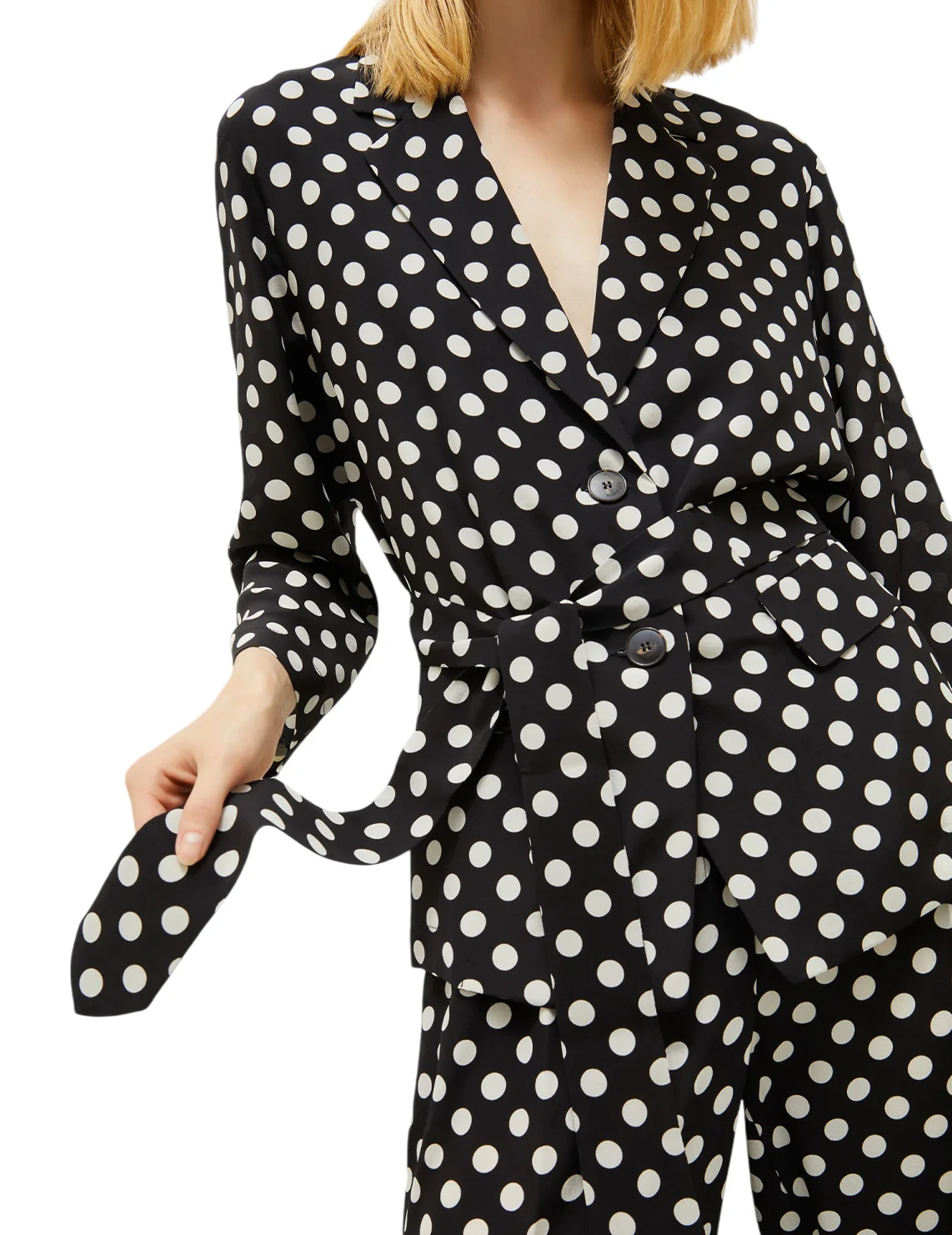 Жакет выполнен из 100% шелка. Модель выполнена в прямом крое. Имеет отложной воротник с лацканами, рукава длиной 3/4, пояс в тон, застежку на пуговицы и карманы с клапанами. Декорирован принтом в горошек.